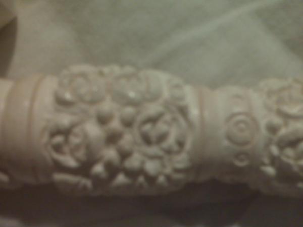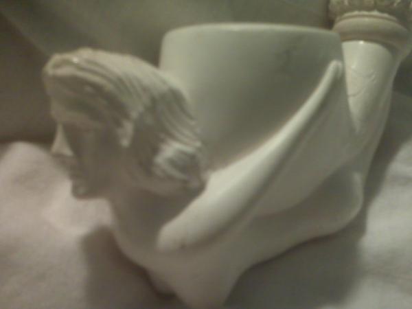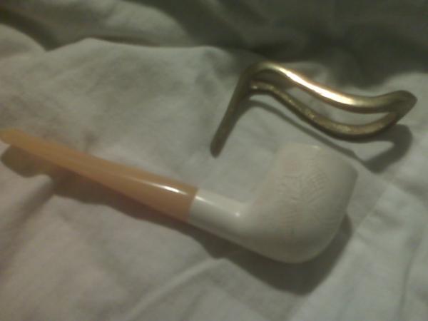 The long pipe is White Ivory with carvings of flowers in 6 different places that go all the way around. The bowl of the pipe has a carving of a whole naked lady facing out. There is a spot in the middle of the stem where the previous owners broke it and gued it back together. The mouthpiece is a type of yellow plastic