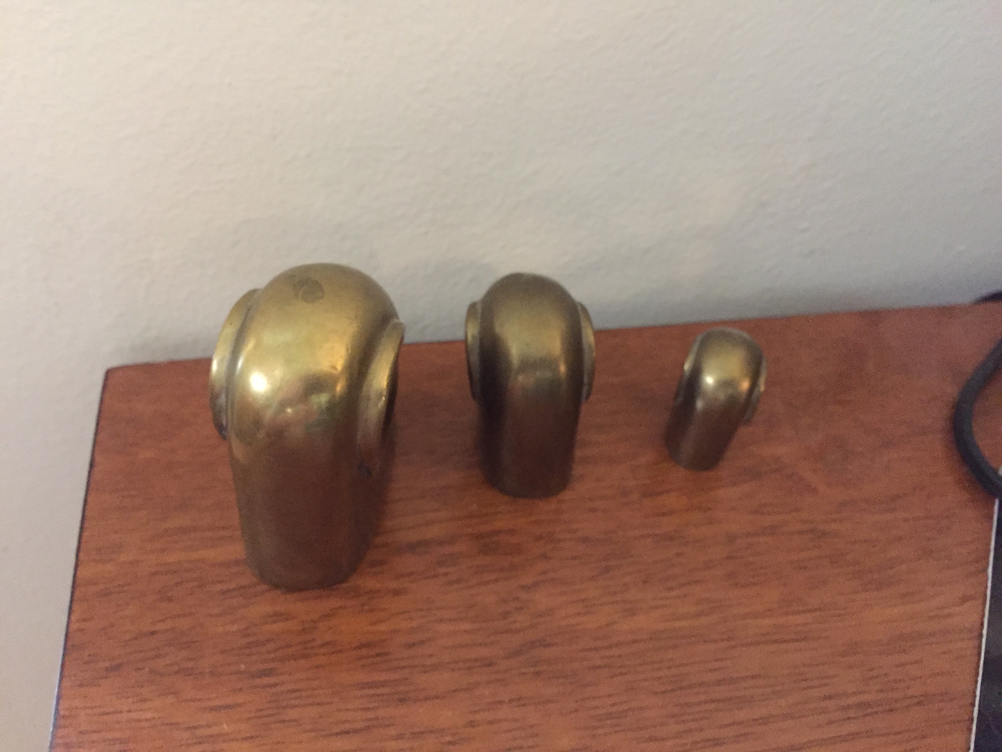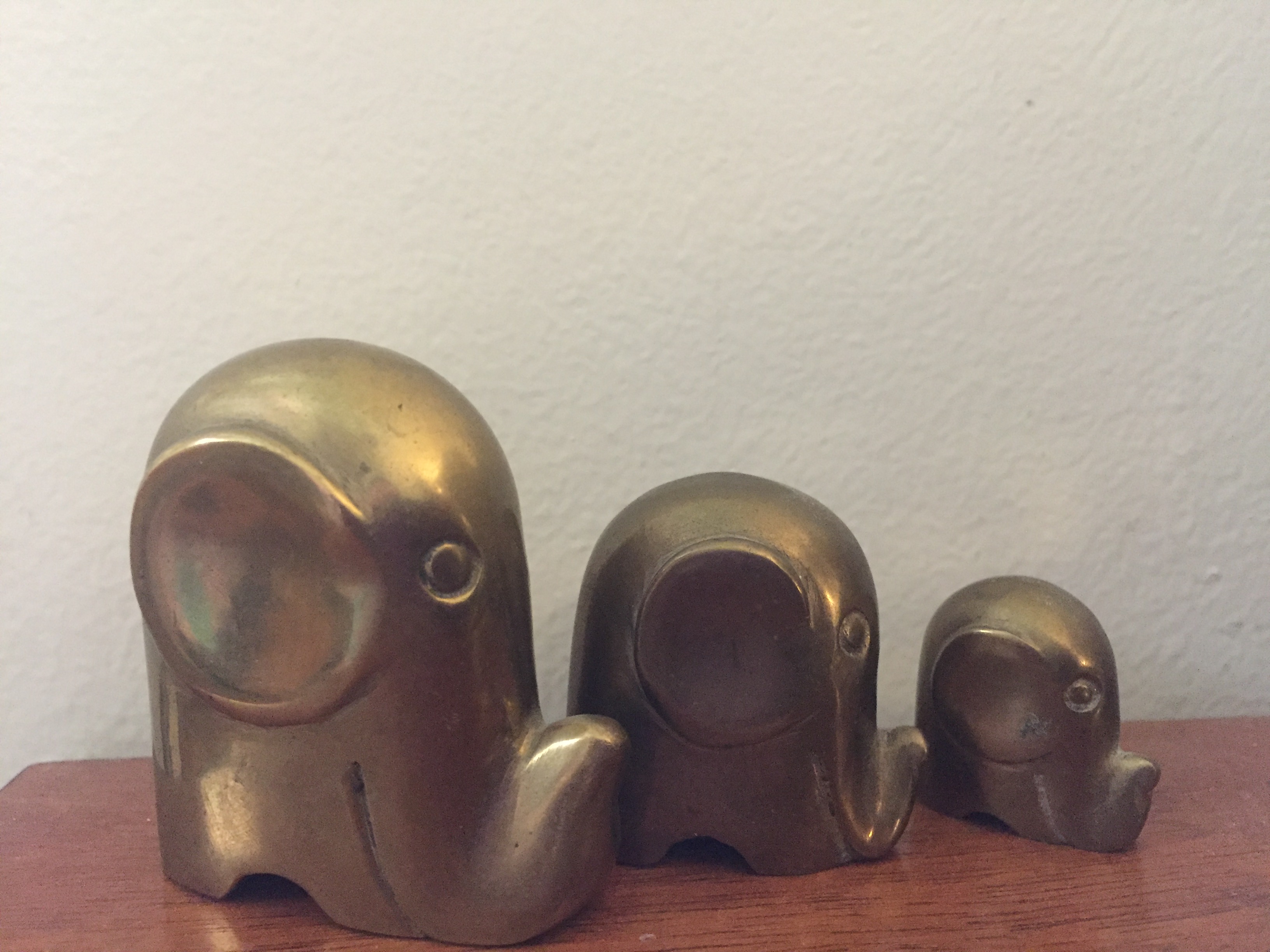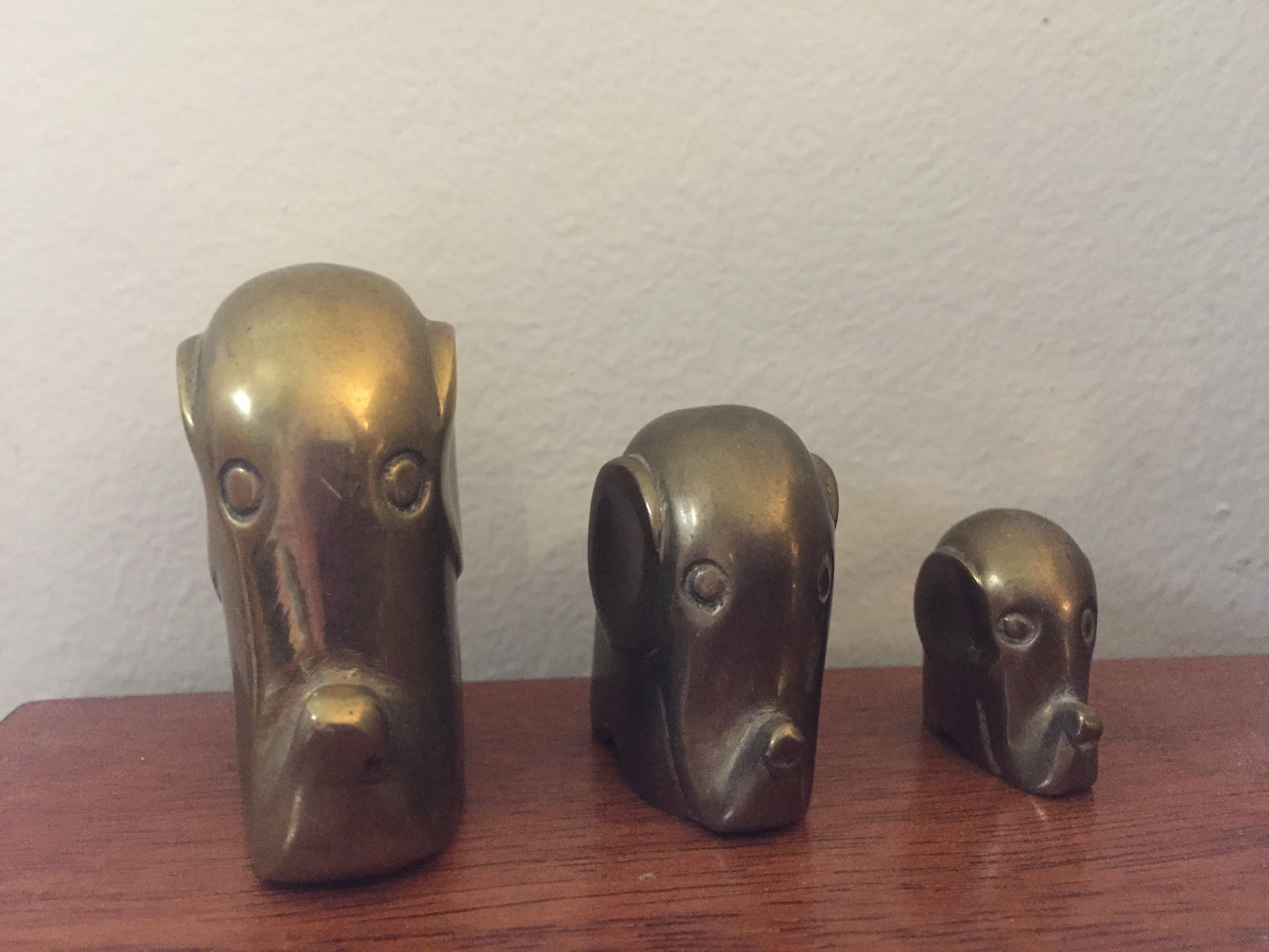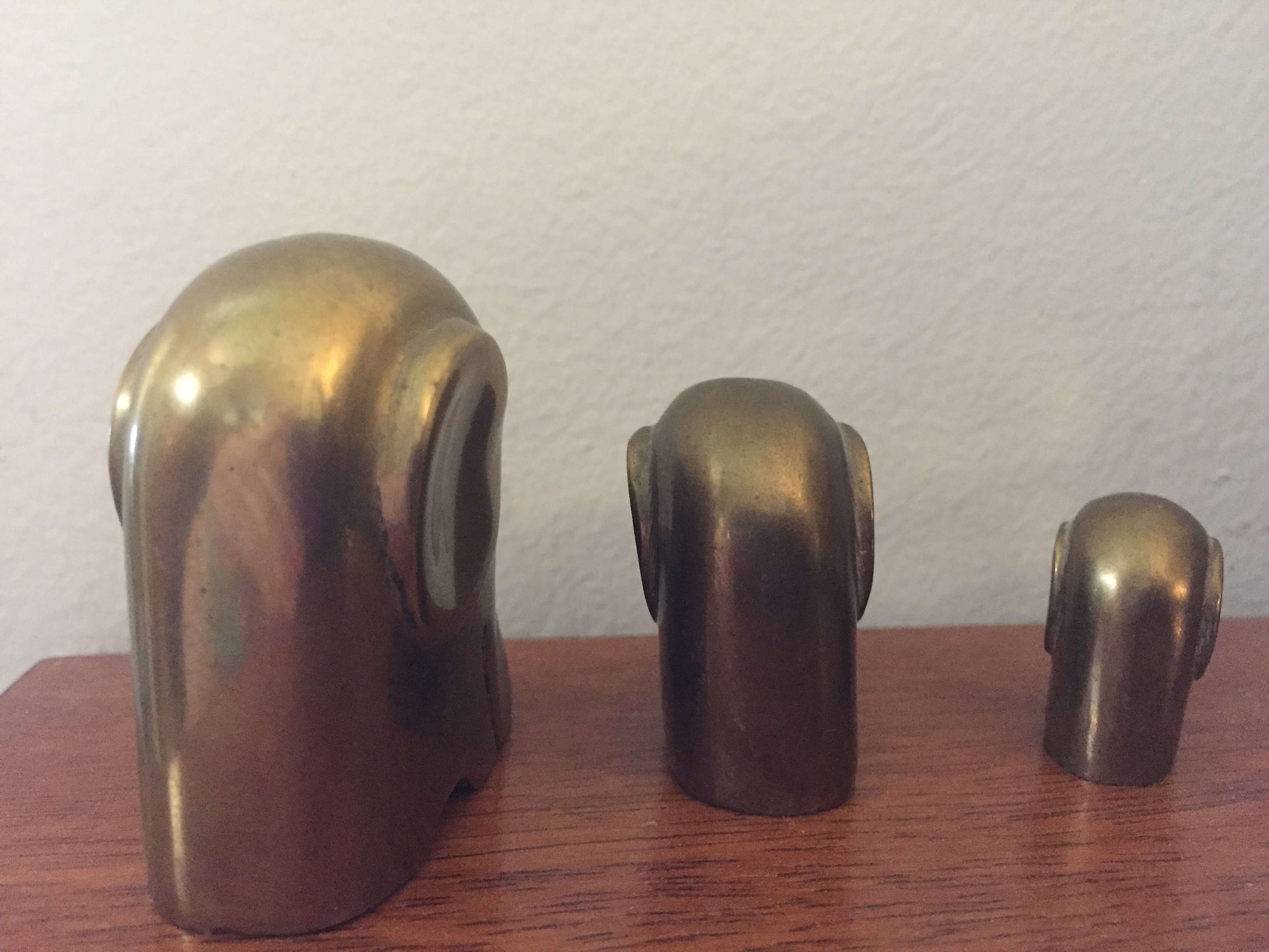 A set of three small brass animals, the largest being about 2 inches in height. I think they are elephants, but they could possibly be monkey heads or some other sort of animal. I can’t find anything like them online. They were purchased as part of a lot at an auction, and so I have no idea what their origin is.