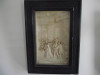 These are two ‘pictorial style’ high or alto-relief (or relievo) works in plaster (??), each depicting two women spending leisure time in a country wooded setting. In one piece, the women engage in a spirited fencing match (or is this a duel??). In the other, as the two rest on the ground--presumably after their athletics (we see their swords lying on the ground by their sides)--one of the women leans in to the other, kissing her on her cheek. Condition: Both frames have various areas where the gilt is split or has flaked off. In the fencing relief, one woman’s arm and sword is broken off; the underlying metal armature poking out from the break point, and the second woman is missing her sword. There is glue residue around the second woman’s wrist from a repair to attach a broken hand. The first woman’s hat in the foreground has plaster loss. Wear consistent with age.