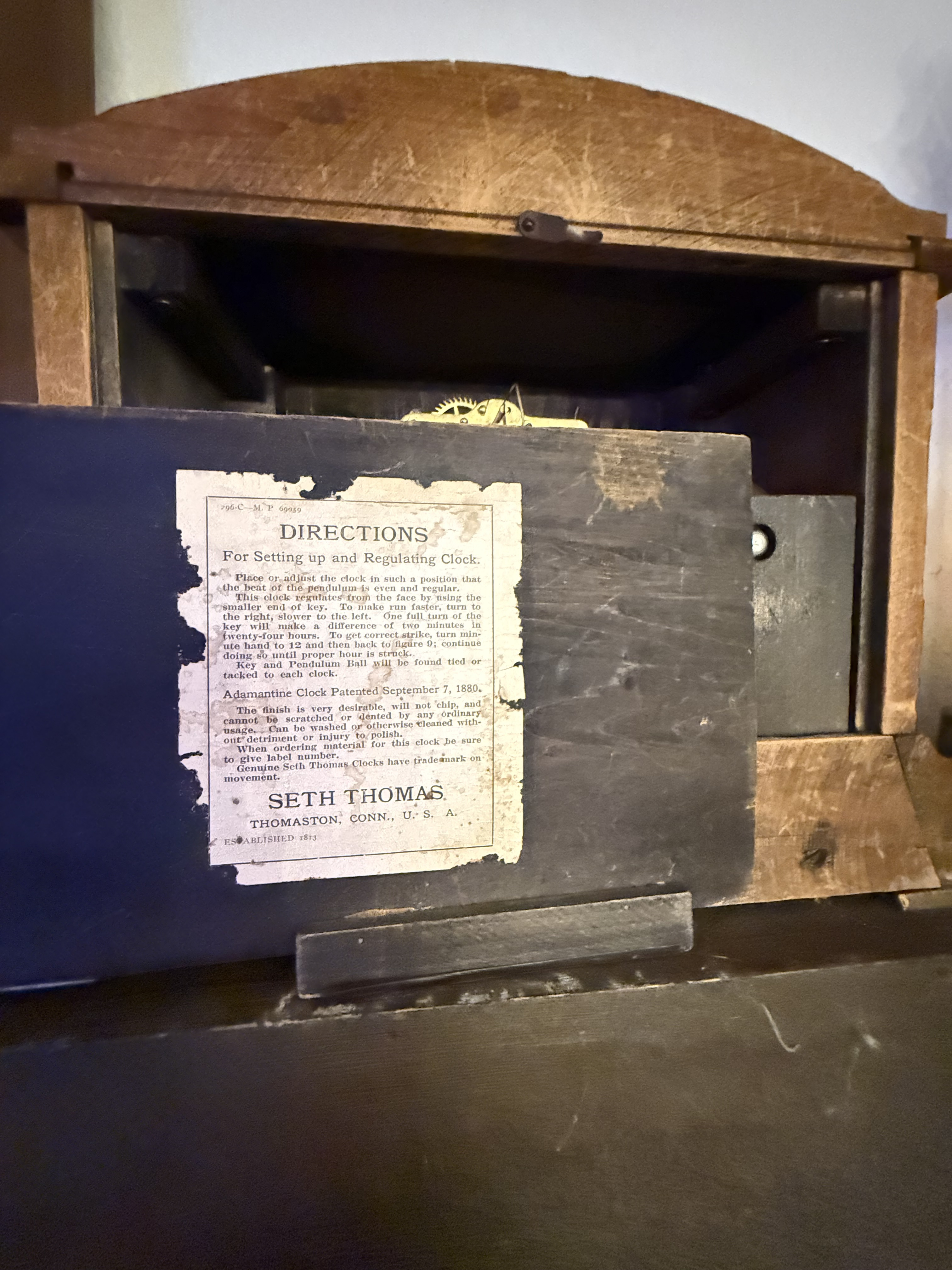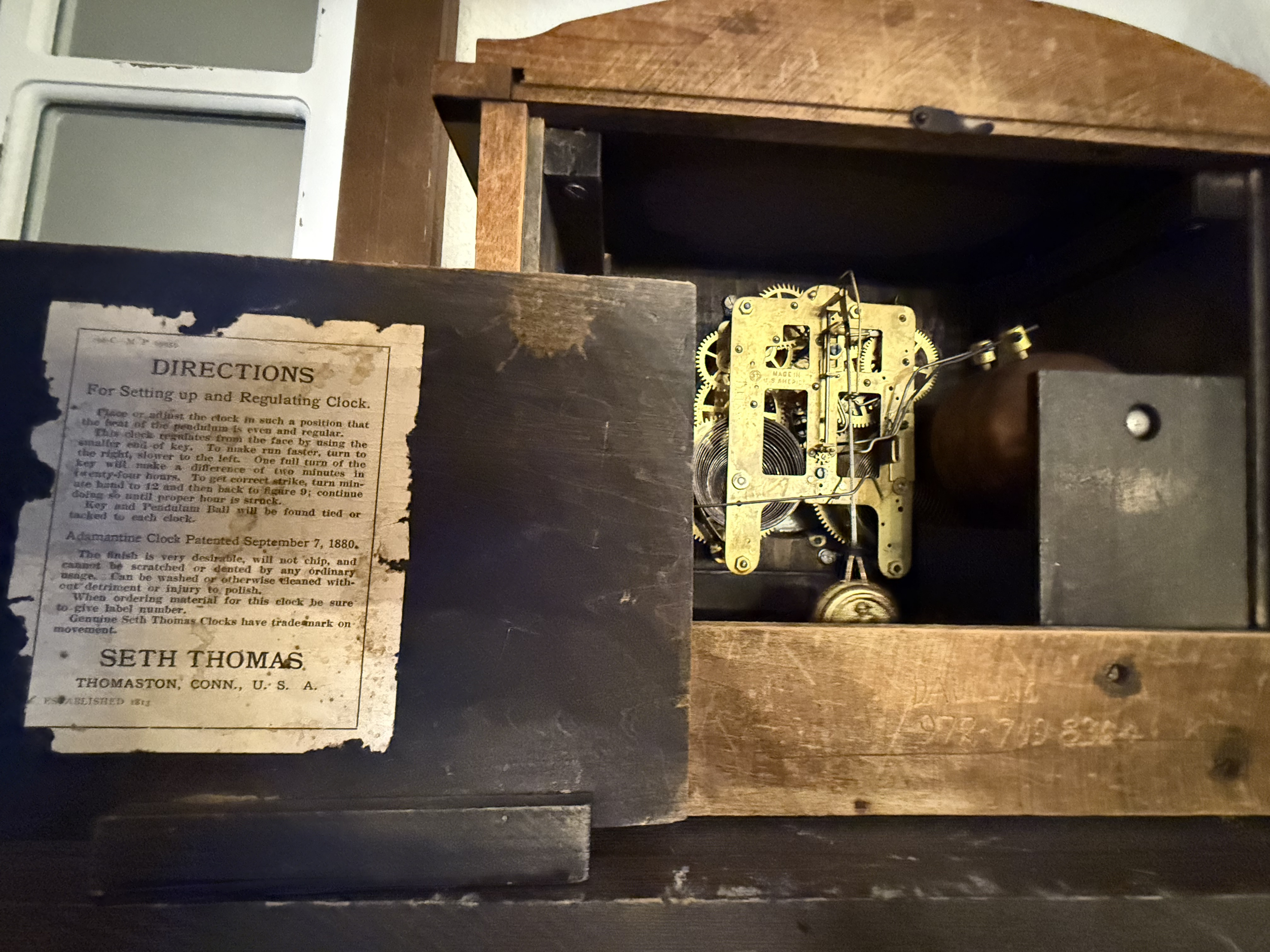 This clock belonged to my mother and gifted to me. There is a phone number carved into it, but that belonged to my mother. There is the Seth Thomas information on the back that states information about the clock.
