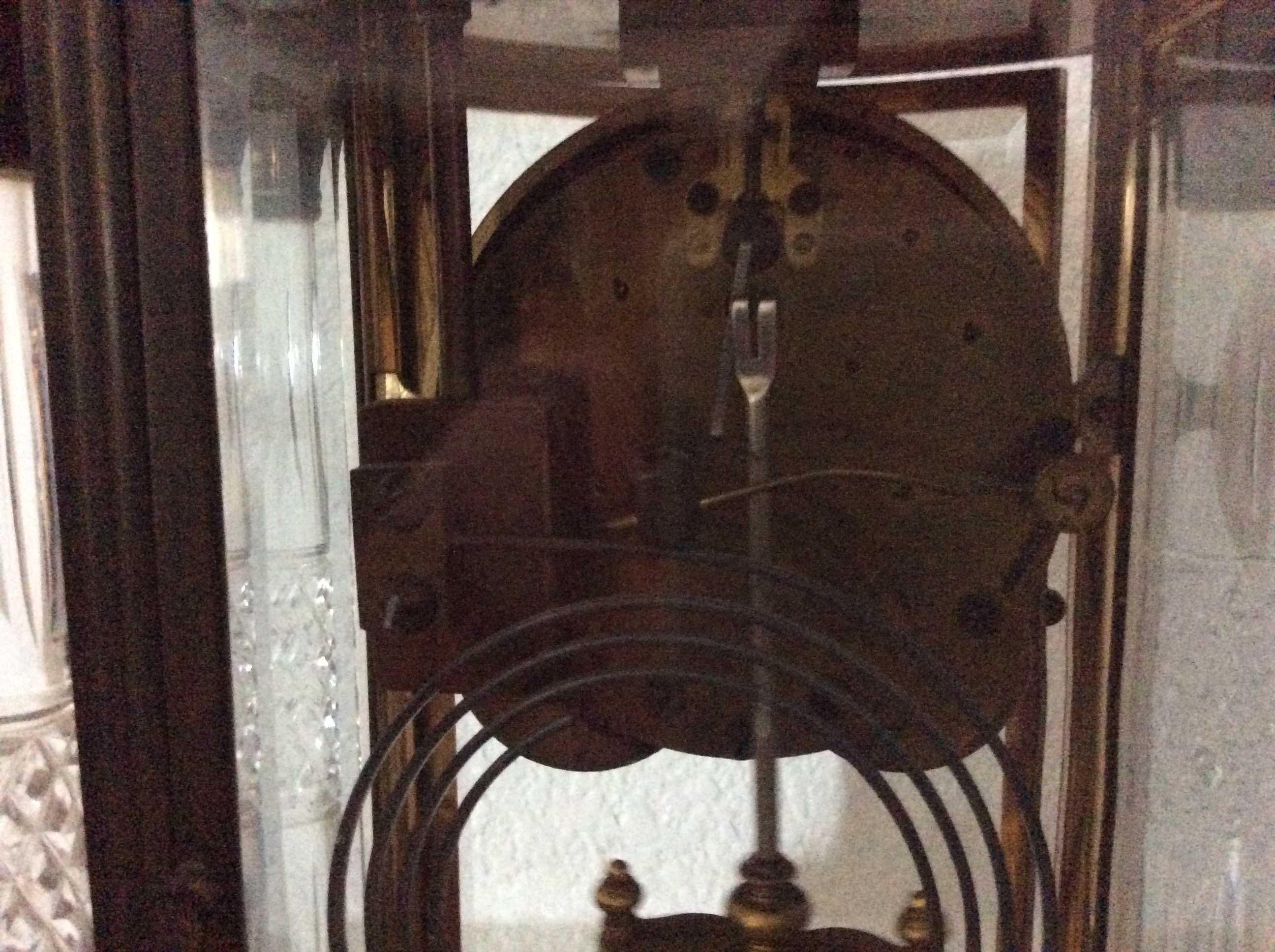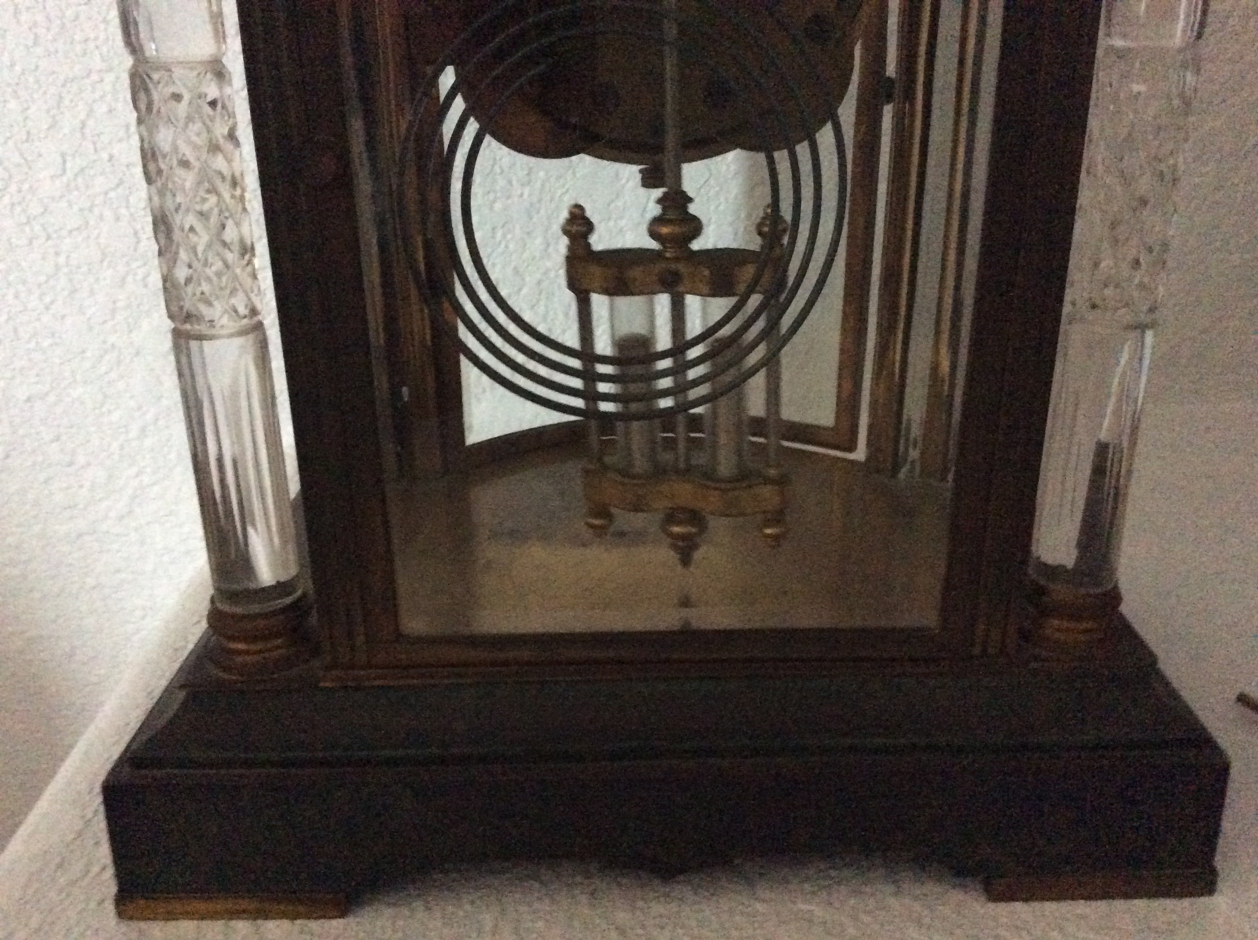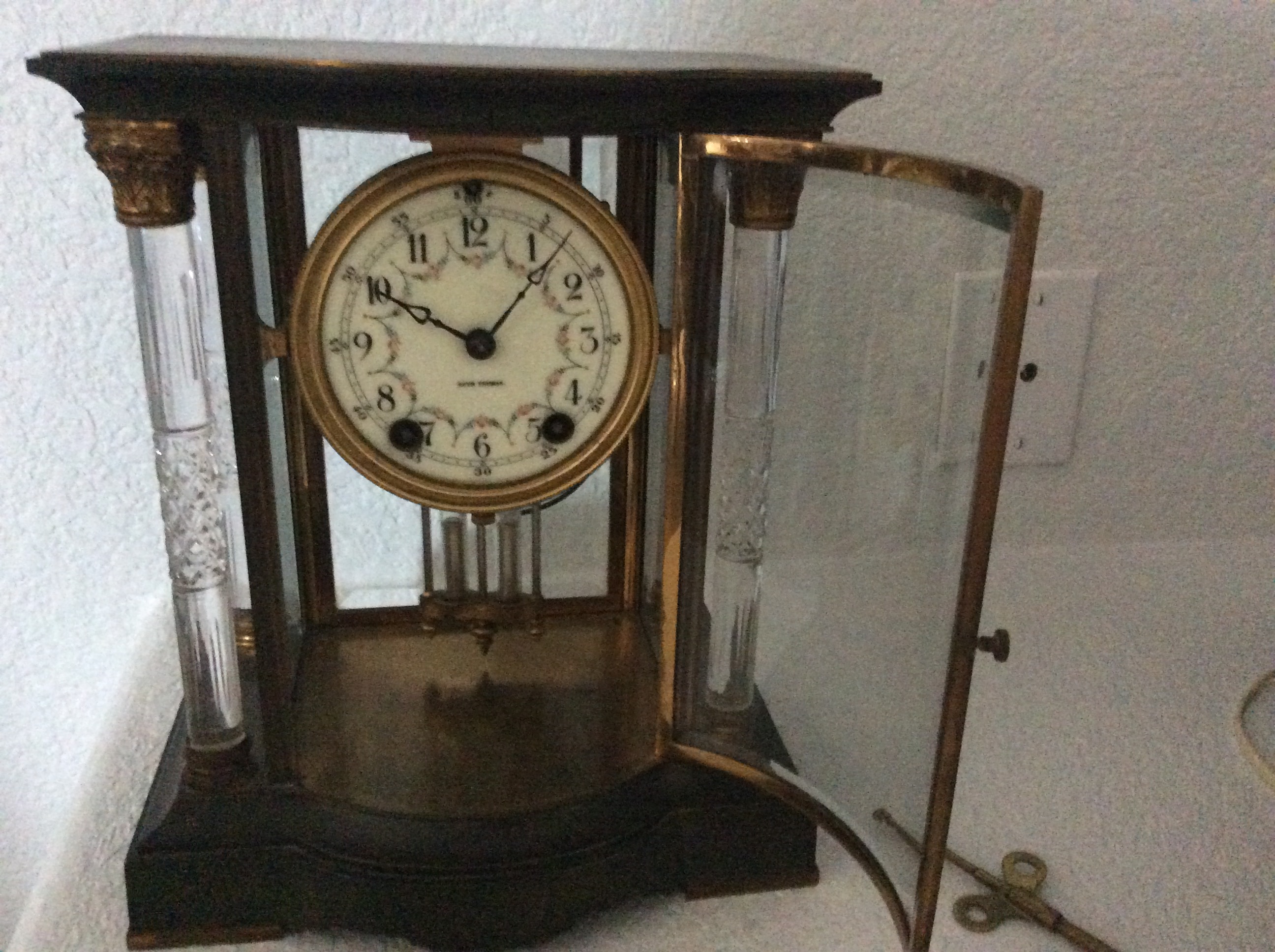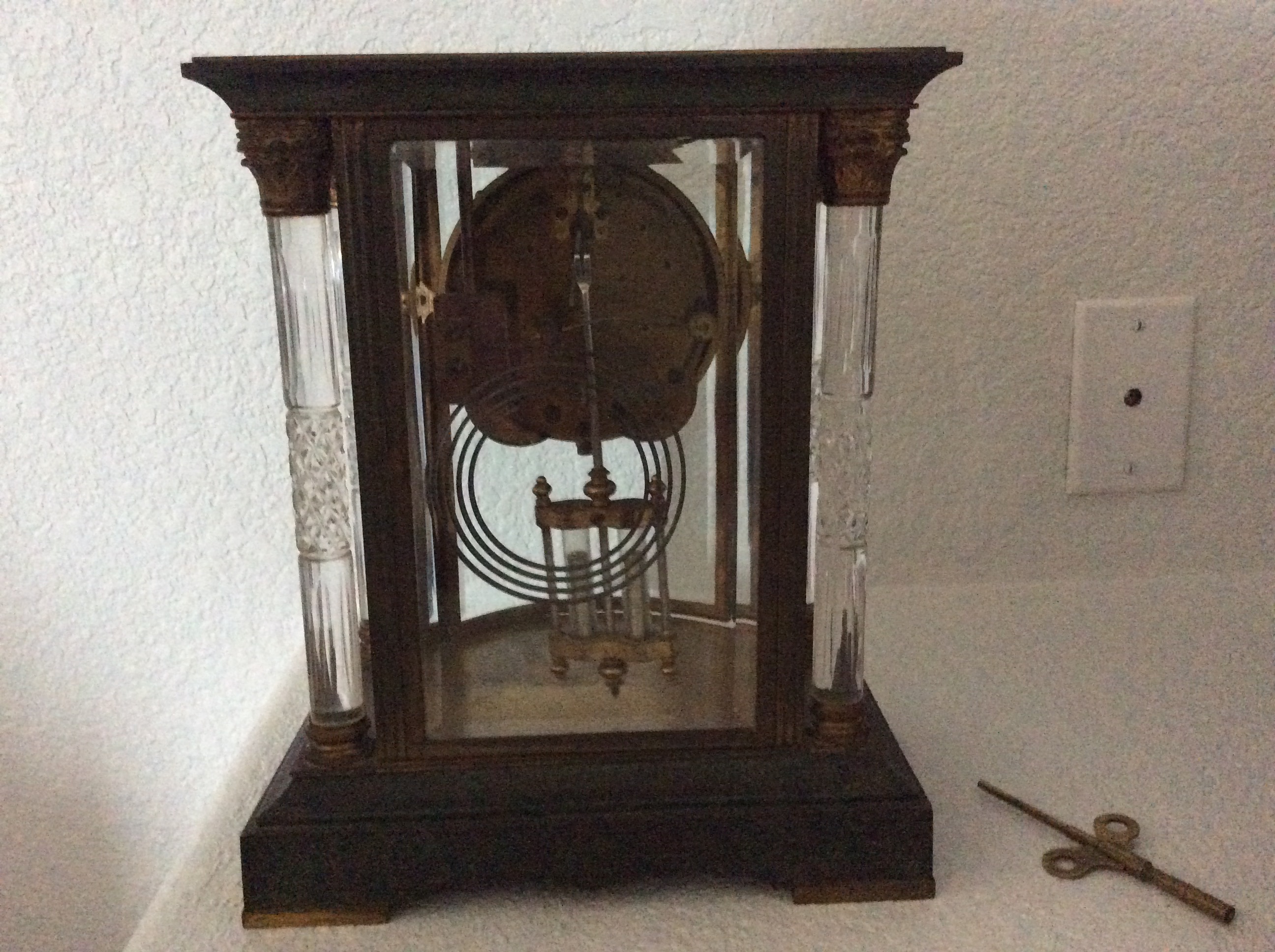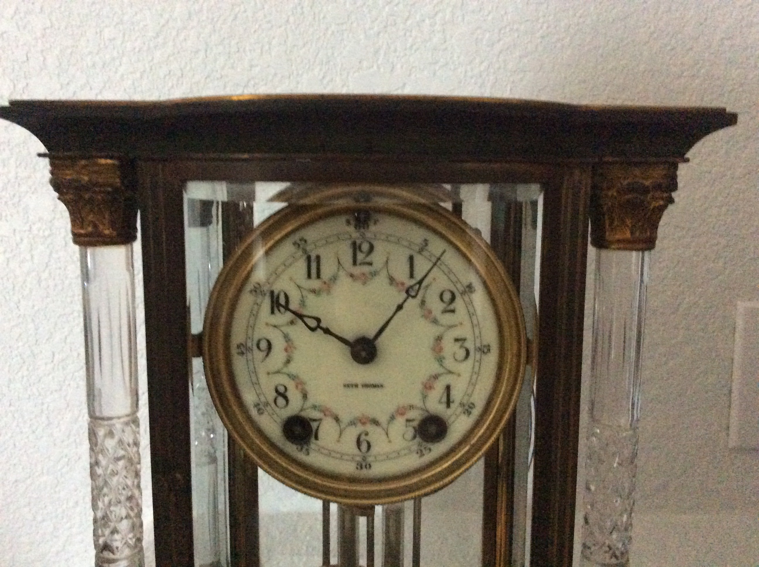 The clock is a Seth Thomas Empire Clock. I do not know where to find the Empire number on the clock. The four columns are crystal.
