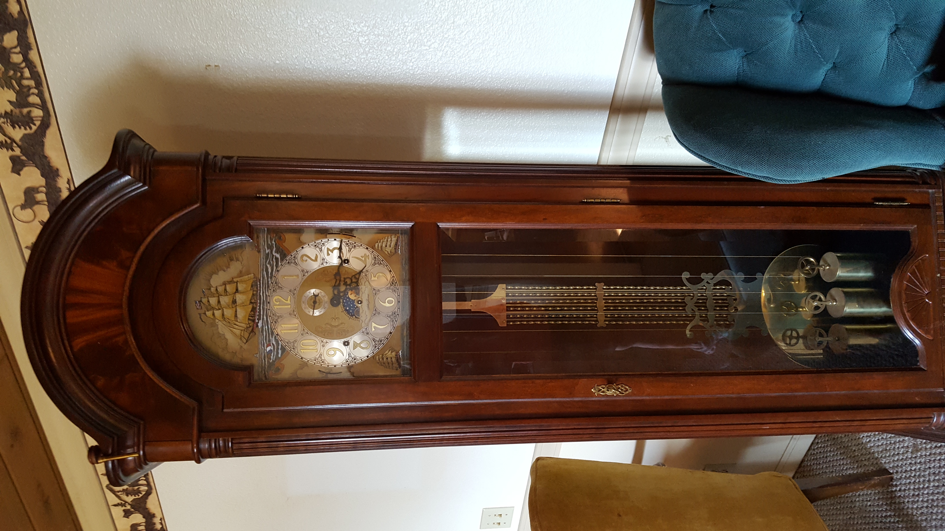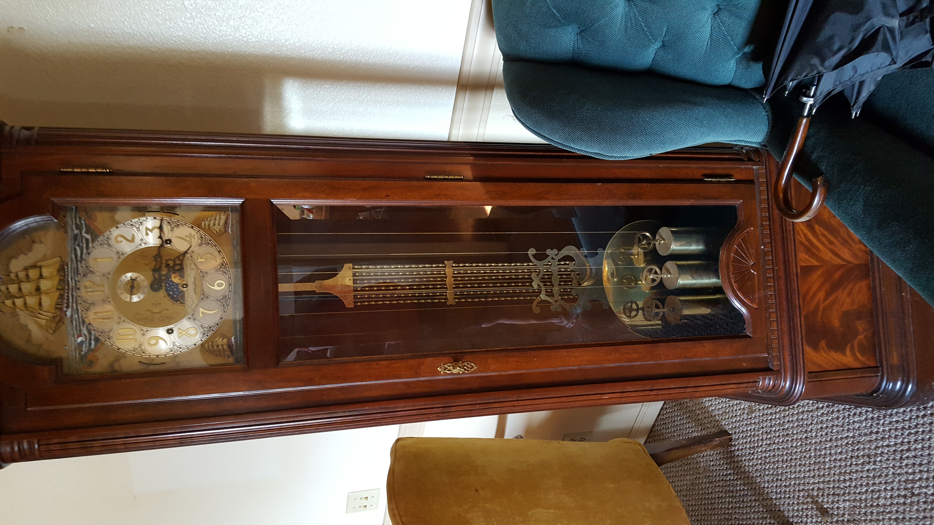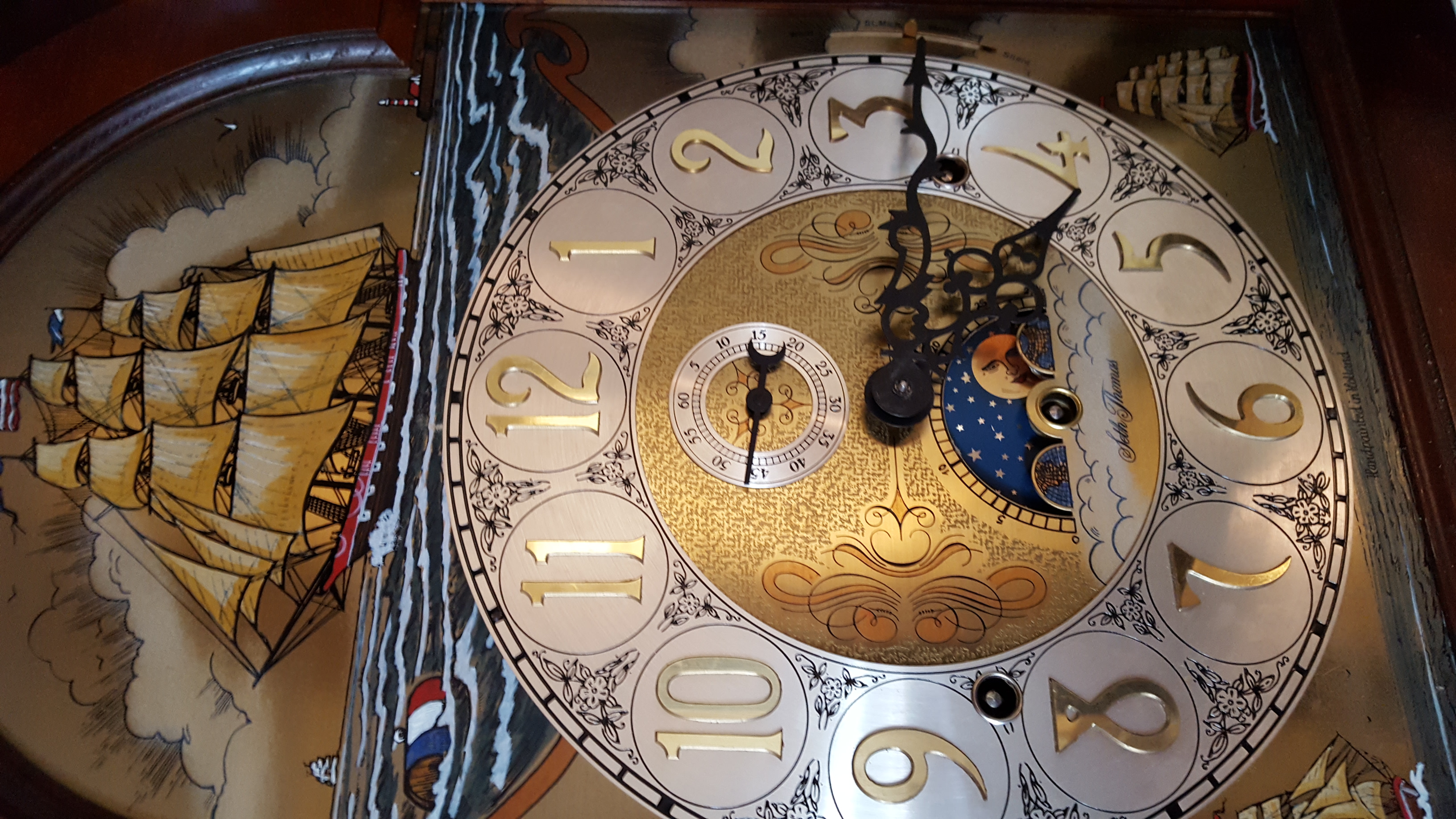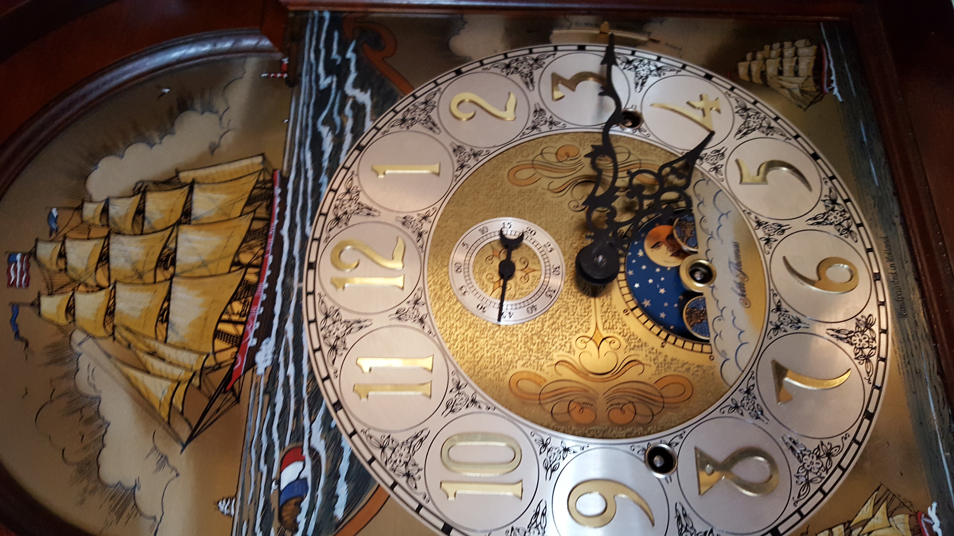 Seth Thomas grandfather clock with picture of sailing ship and phases of the moon