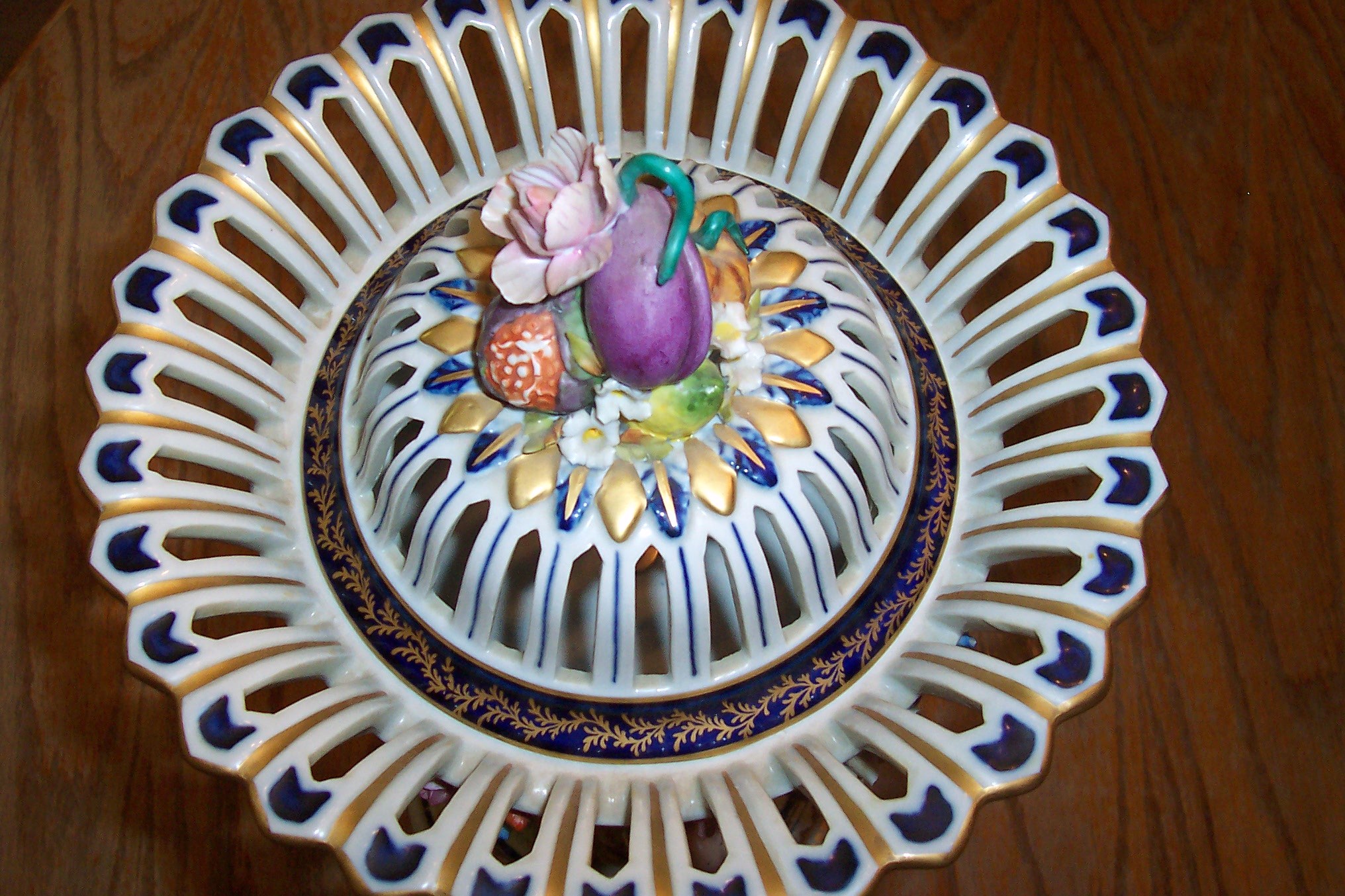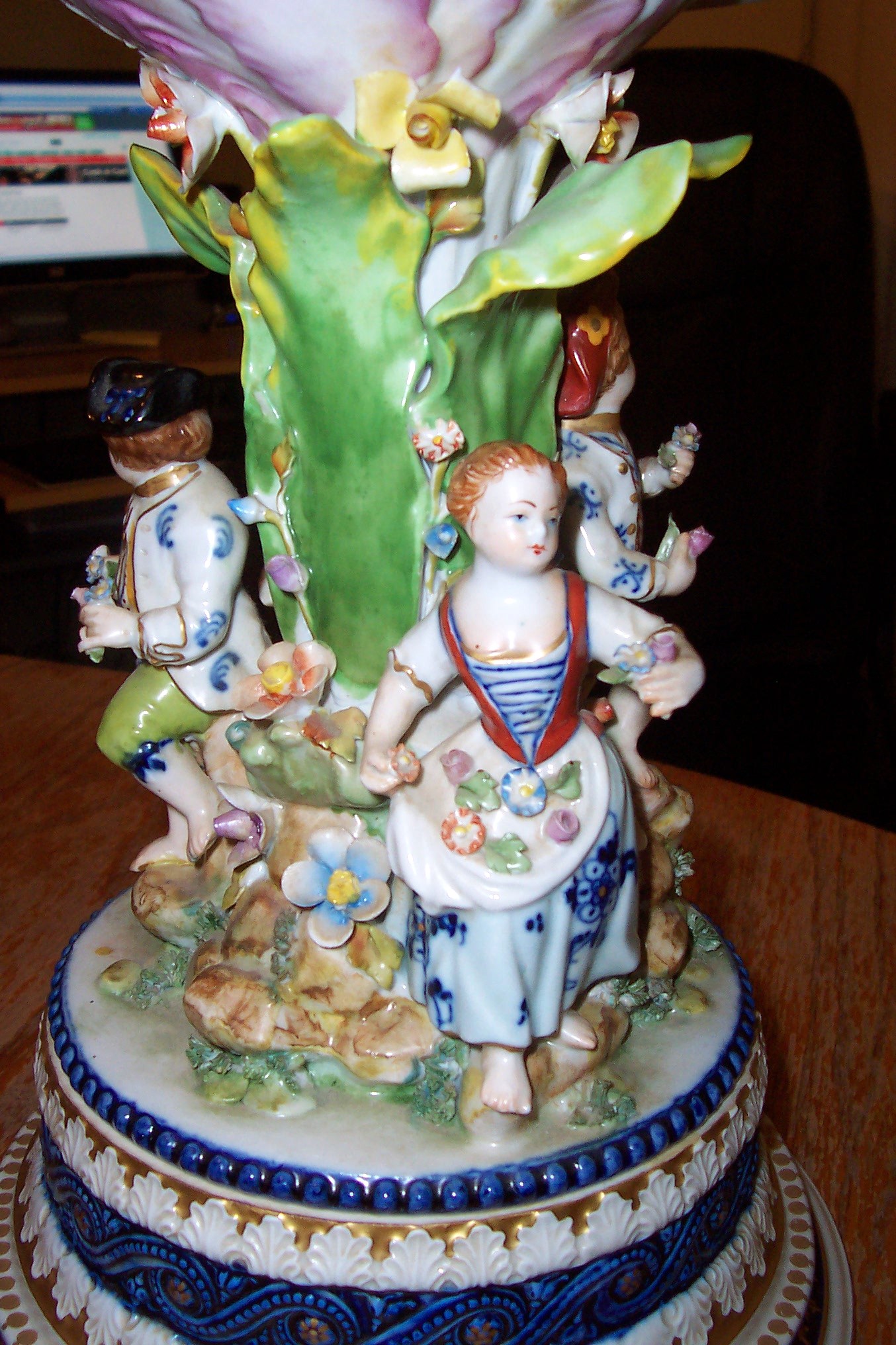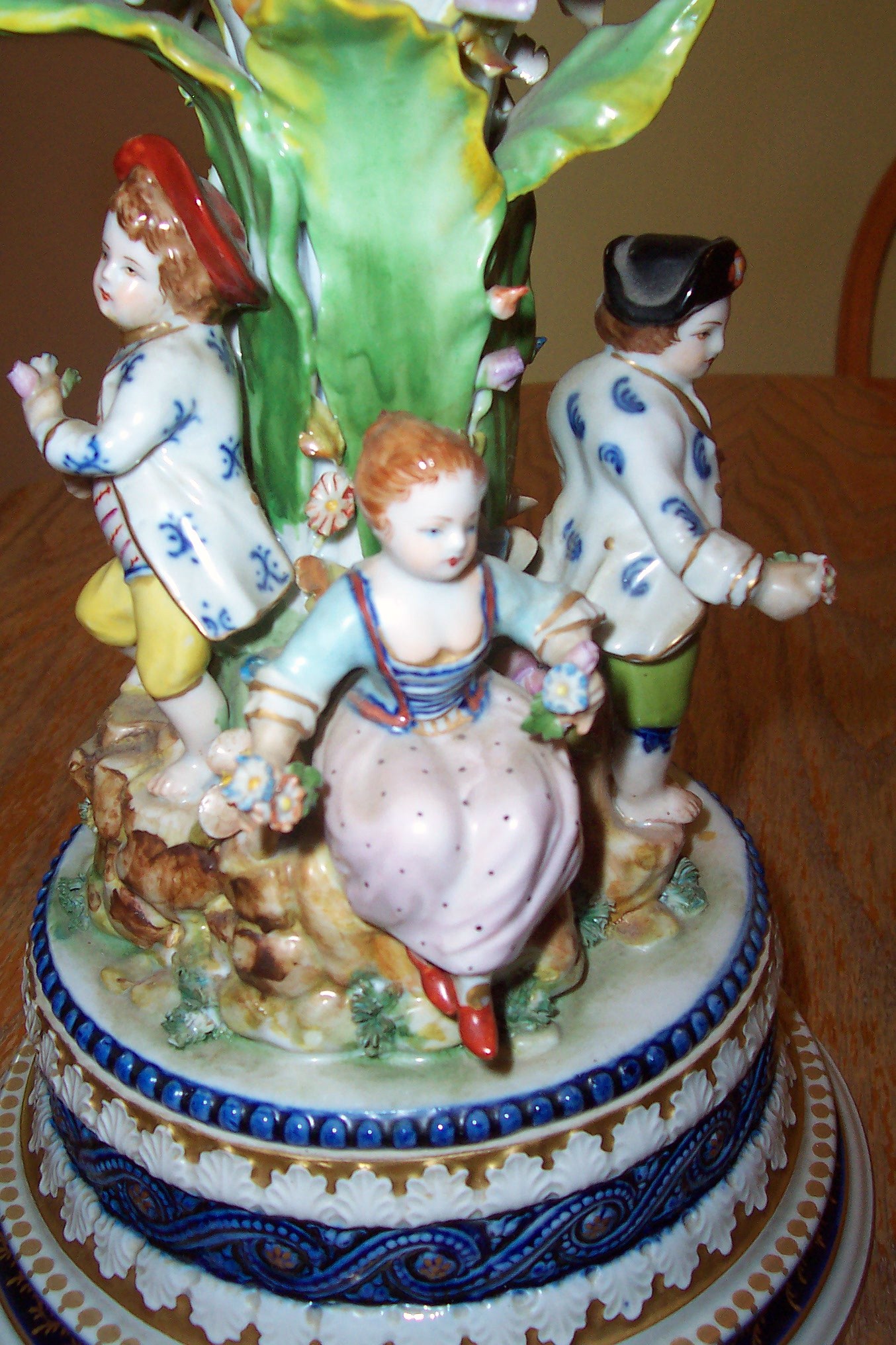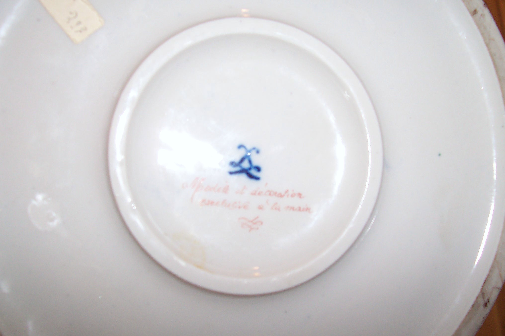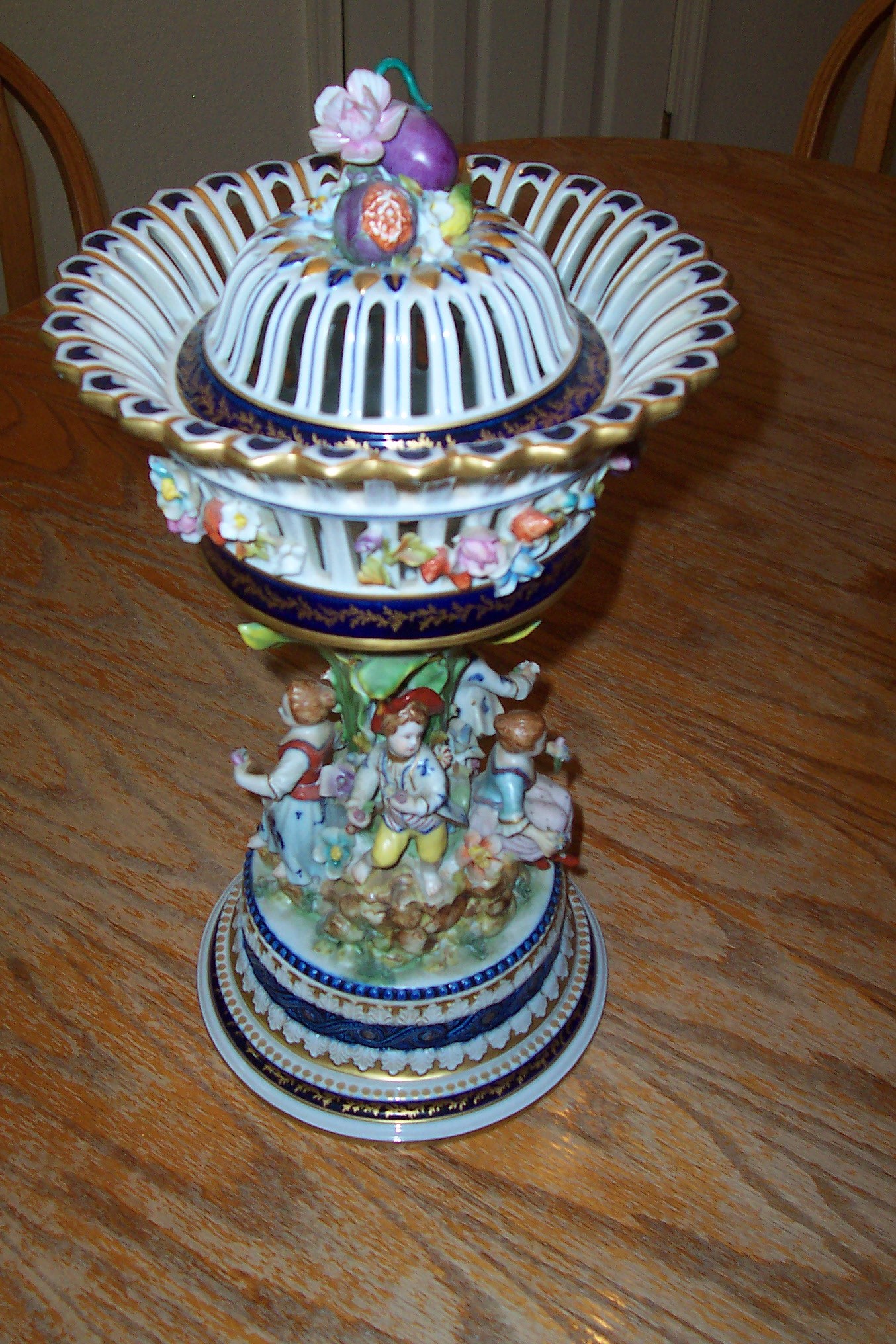 Beautiful figurines and flower petals all over the stand. Hand painted. Removable, vented cover. Intricate detail in the painting. Excellent Condition. Inscription on the bottom says created by hand (in French), along with double intertwined L's marking the Sevres period.