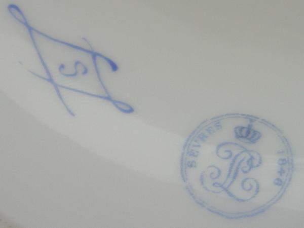 <p>Sorry to tell you, but based on the images this piece is not Sevres, it's a fake, and a fairly recent one at that. Sevres used a date code within the interlocking L's mark, the letter "S" would be for 1771, the 1846 mark is fake as well. These have been cropping up on ebay with stories much like you've been told. They appear to have been made in China. Due to copyright and design protection laws no American or European company would attempt to fake a well known companies trademark.</p><p> </p><p>Lovejoy </p>
