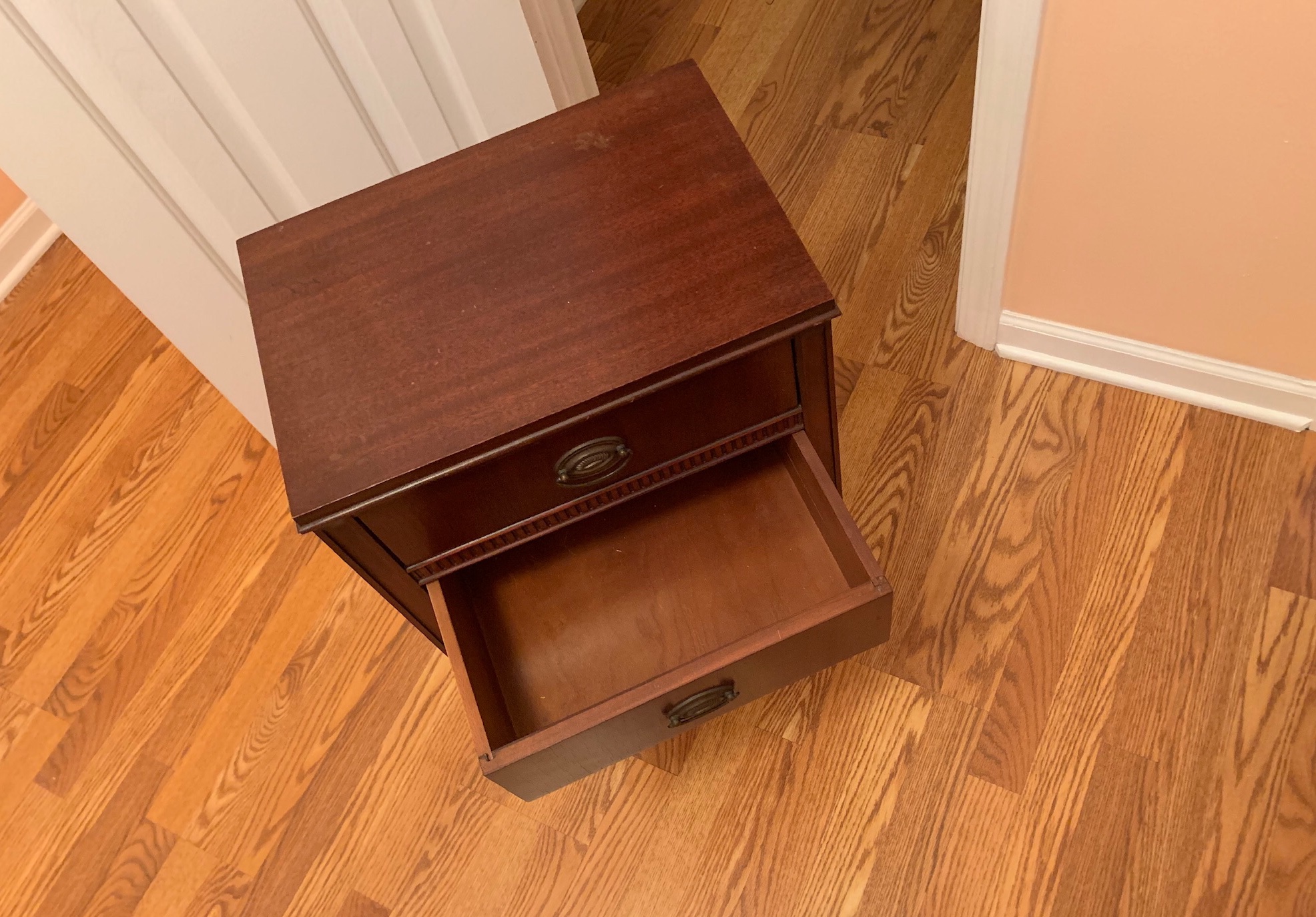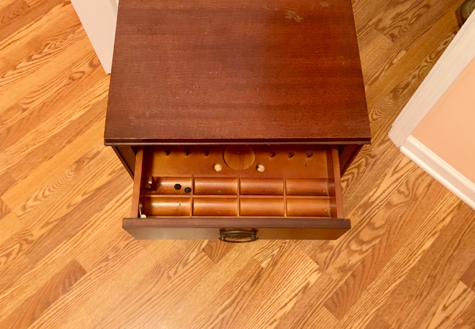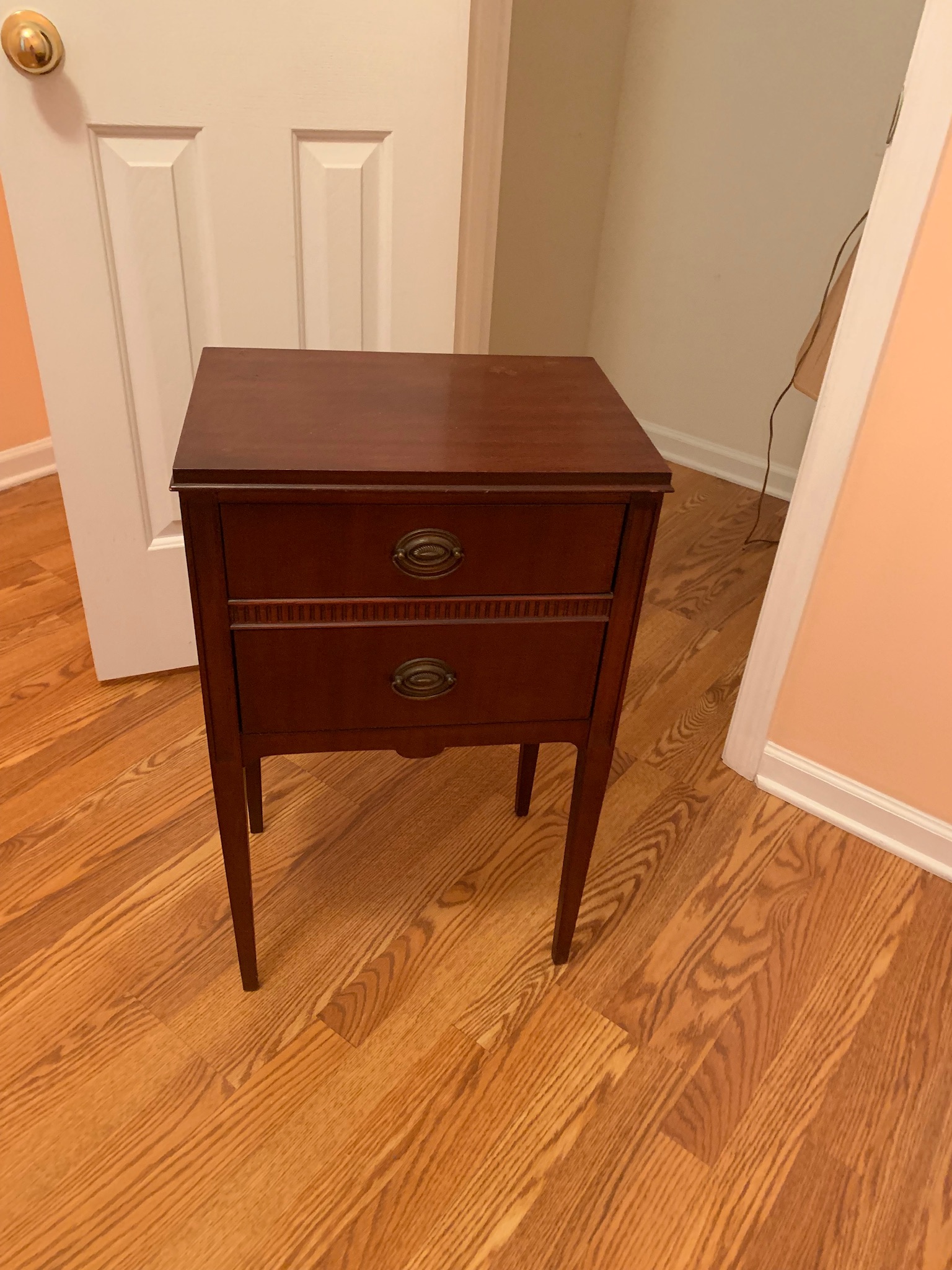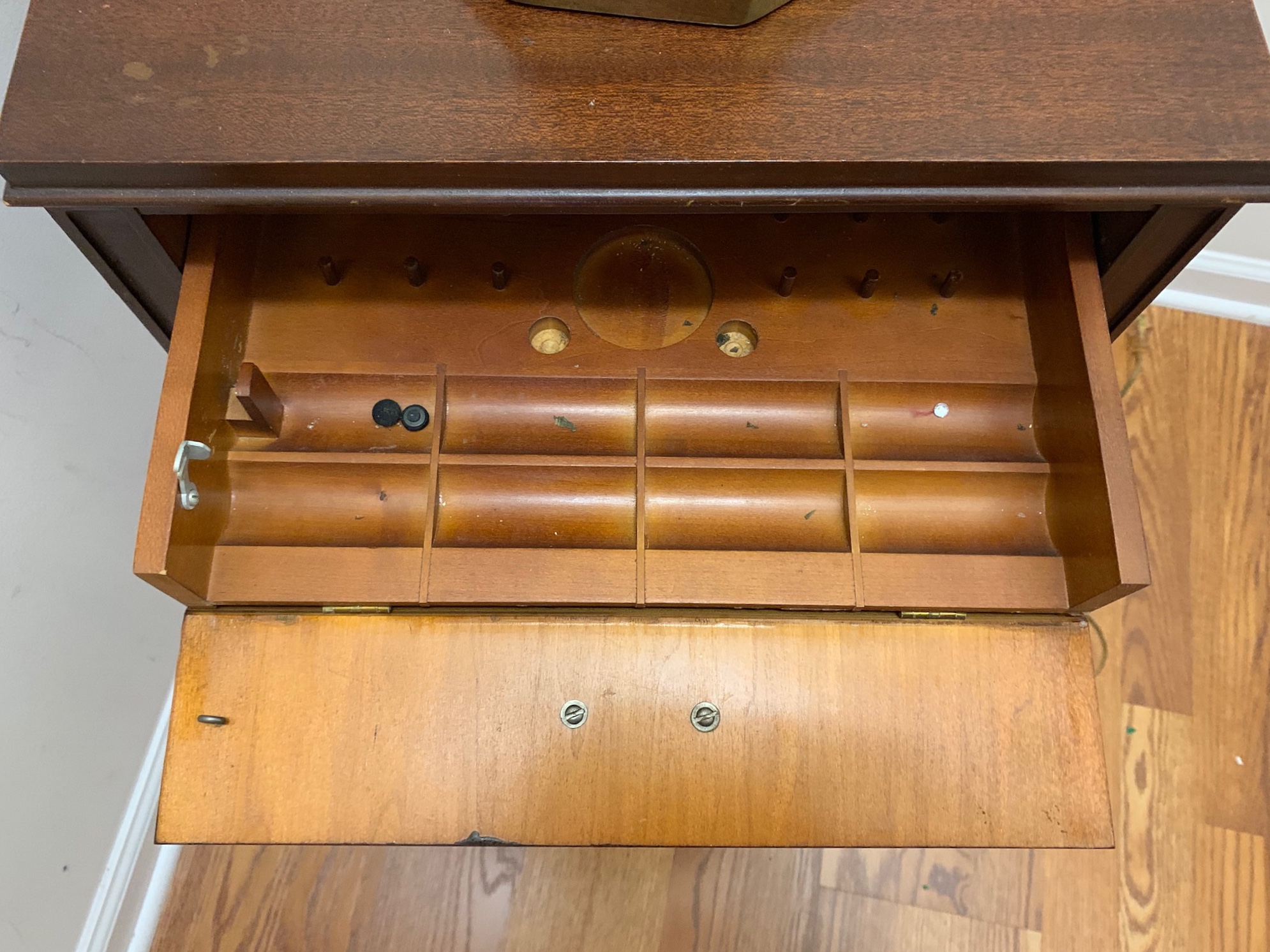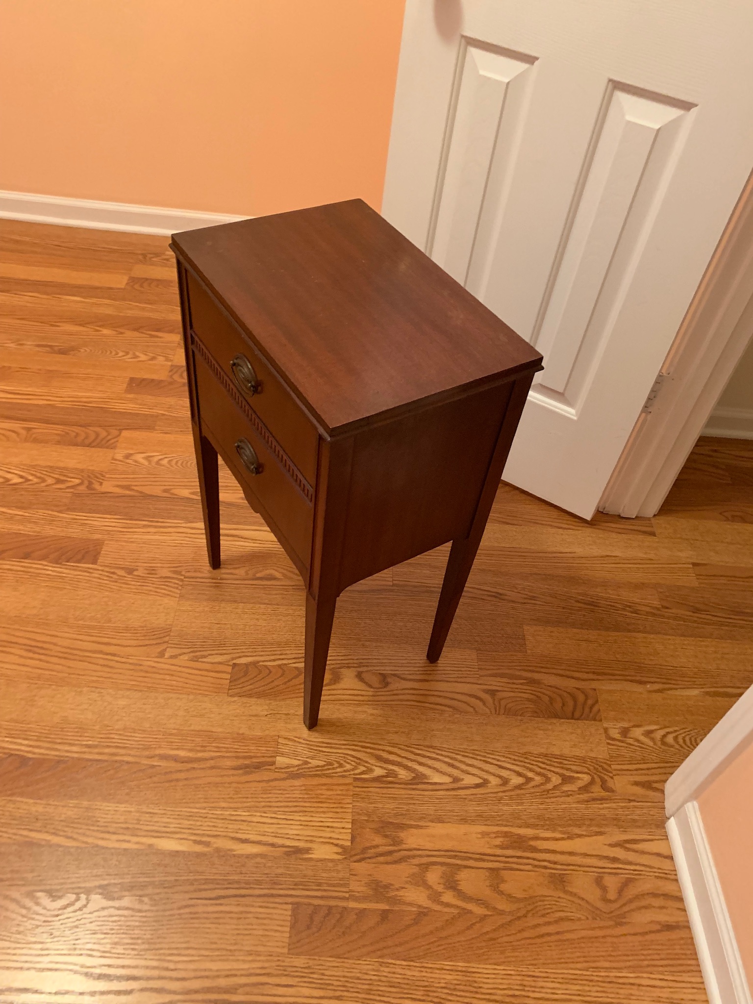Sewing cabinet belonging to my Mom. She doesn’t remember where she acquired it. It has two drawers. Top drawer is fitted with slots for spools of thread. But curiously also the front of that drawer unlatches and folds forward. I have searched internet and can’t find anything similar. No furniture maker markings on bottom or inside drawers. Size 29” tall, 17” wide and 13” deep. We just want to determine possible age and maker and what it is actually called.