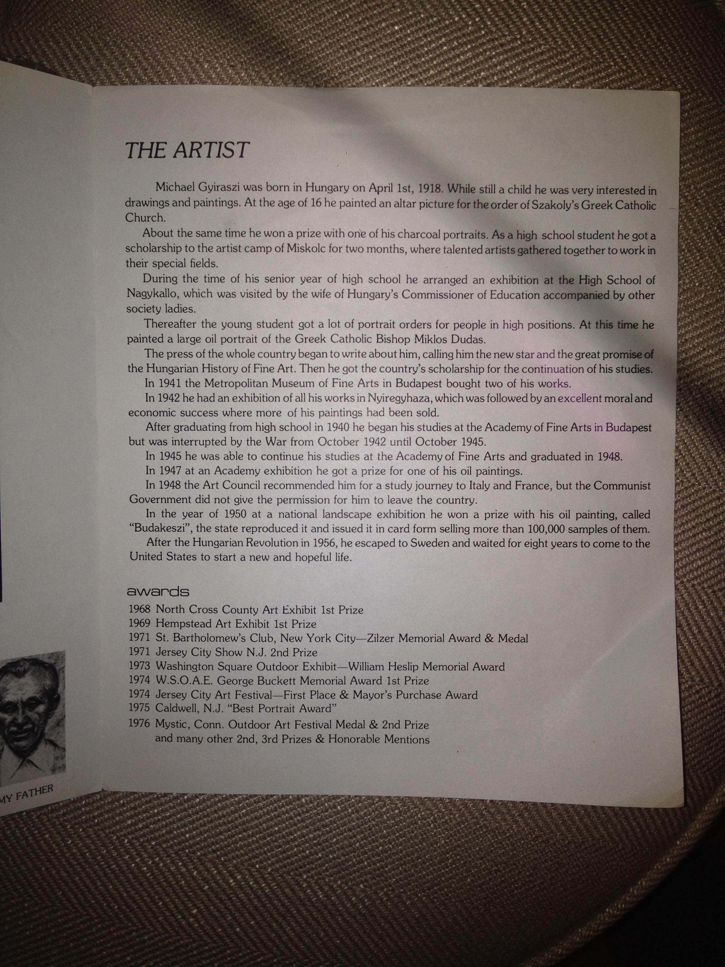 Oil painting done by, Michael Gyiraszi - Vadnay.  Born in Hungary on April 1, 1918. After the Hungarian revolution in 1956, he escaped to Sweden and waited for eight years to come to the United States. Winner of several awards and prizes. Exhibitions at several locations including Carnegie International Center, New York City and manufacturers of Hanover trust, Madison Ave., New York City.