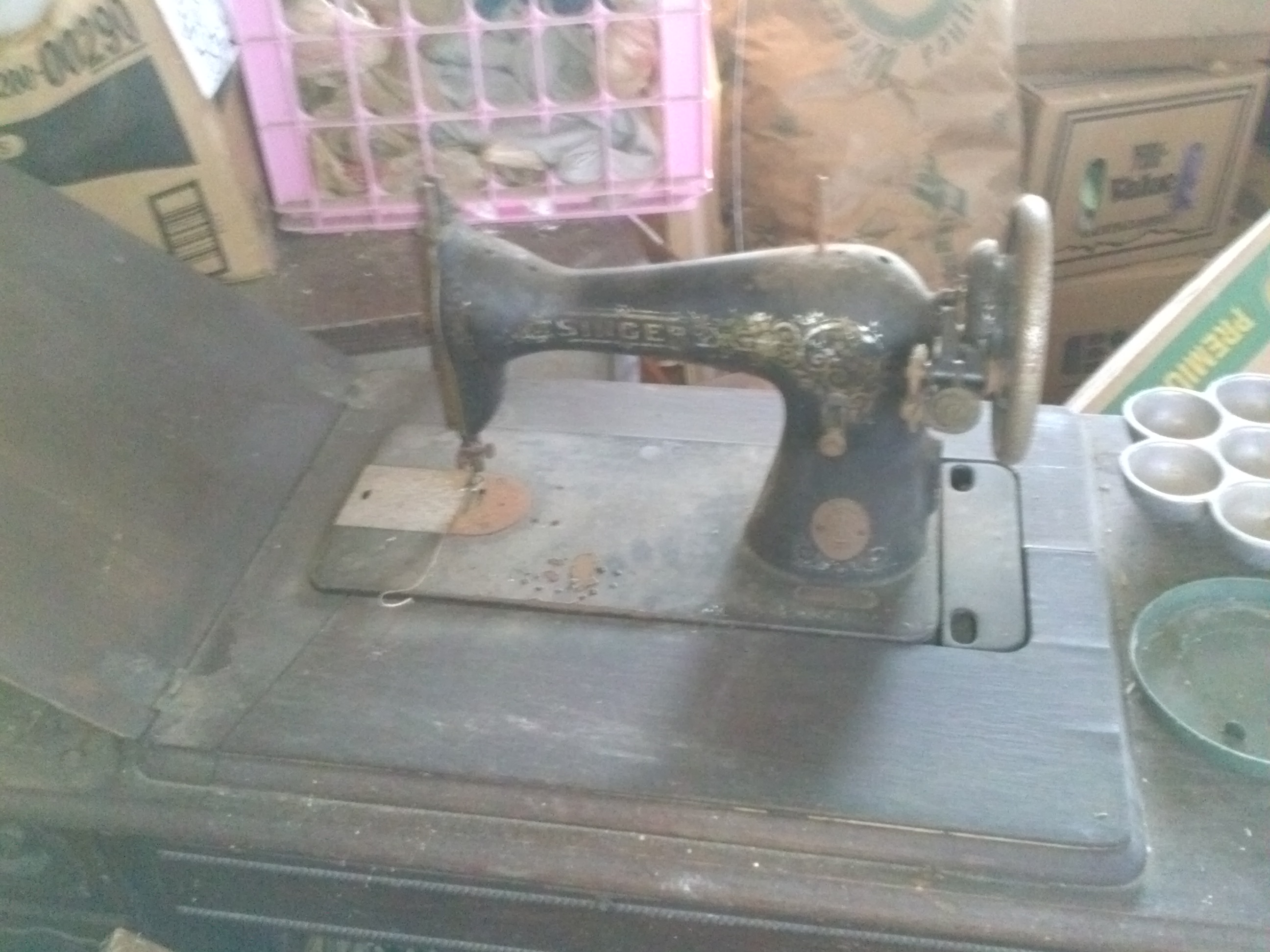 singer sewing machine not sure if it works but we belive all the parts are there. wood could use a little work.
