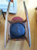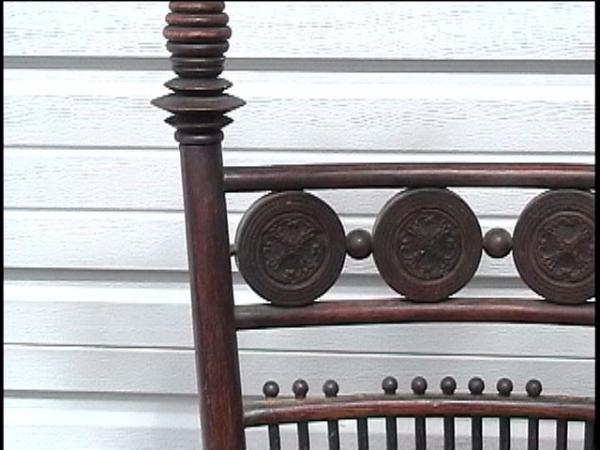 Unsure about the wood type but looks like redwood where it is hand carved where the seat goes.It has odd shaped square nails that look handmade.From the floor to the top of the finials is 40" .From the top of the seat to the top of the finials is 26 1/2" .It is about 20" wide at the seat.