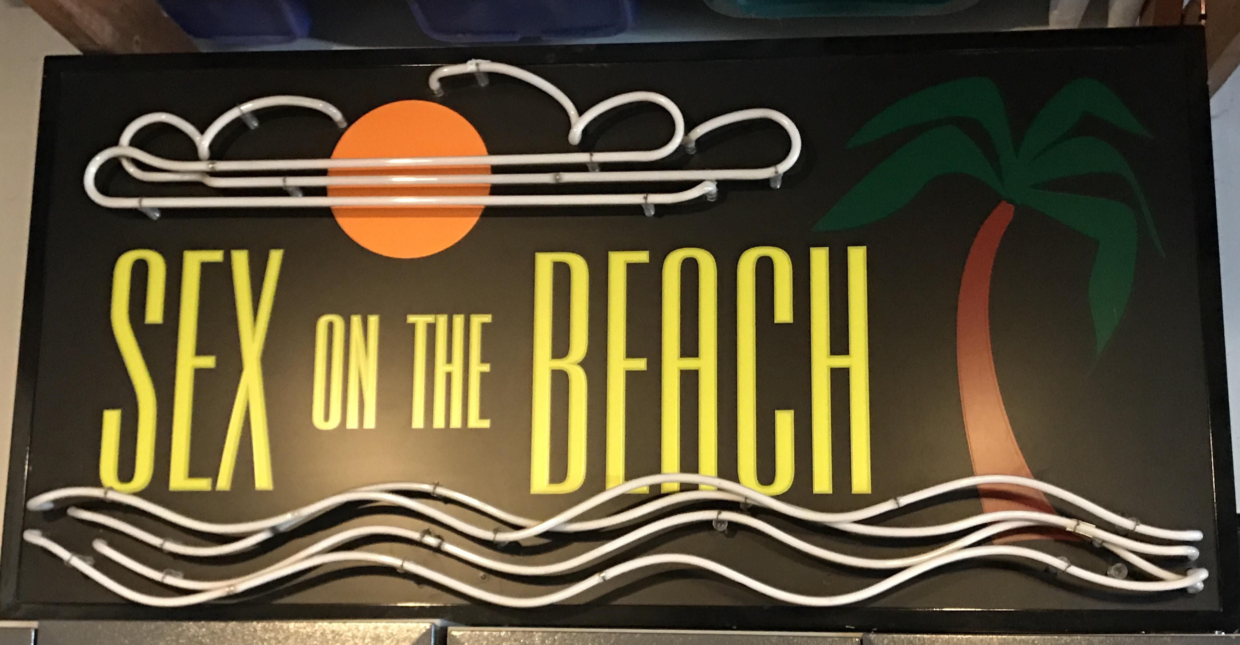 Hi I have a one of kind vintage neon "sex on the beach" neon sign. It is approx, 5 ft tall by 3 ft wide. It is 100% in full working condition. As seen in the picture the bottom blue lights or the waves, switch between each neon bulb to simulate waves.