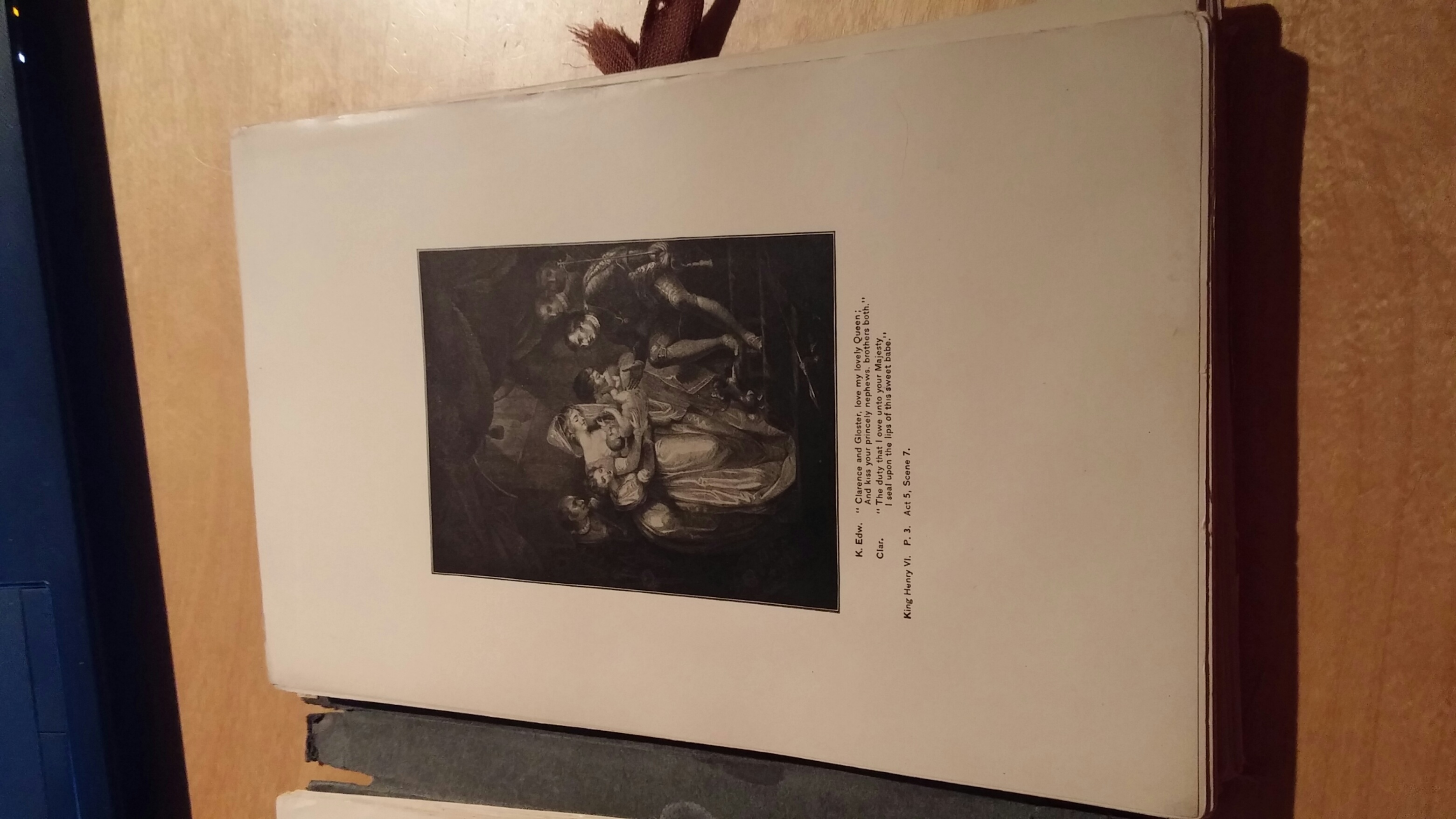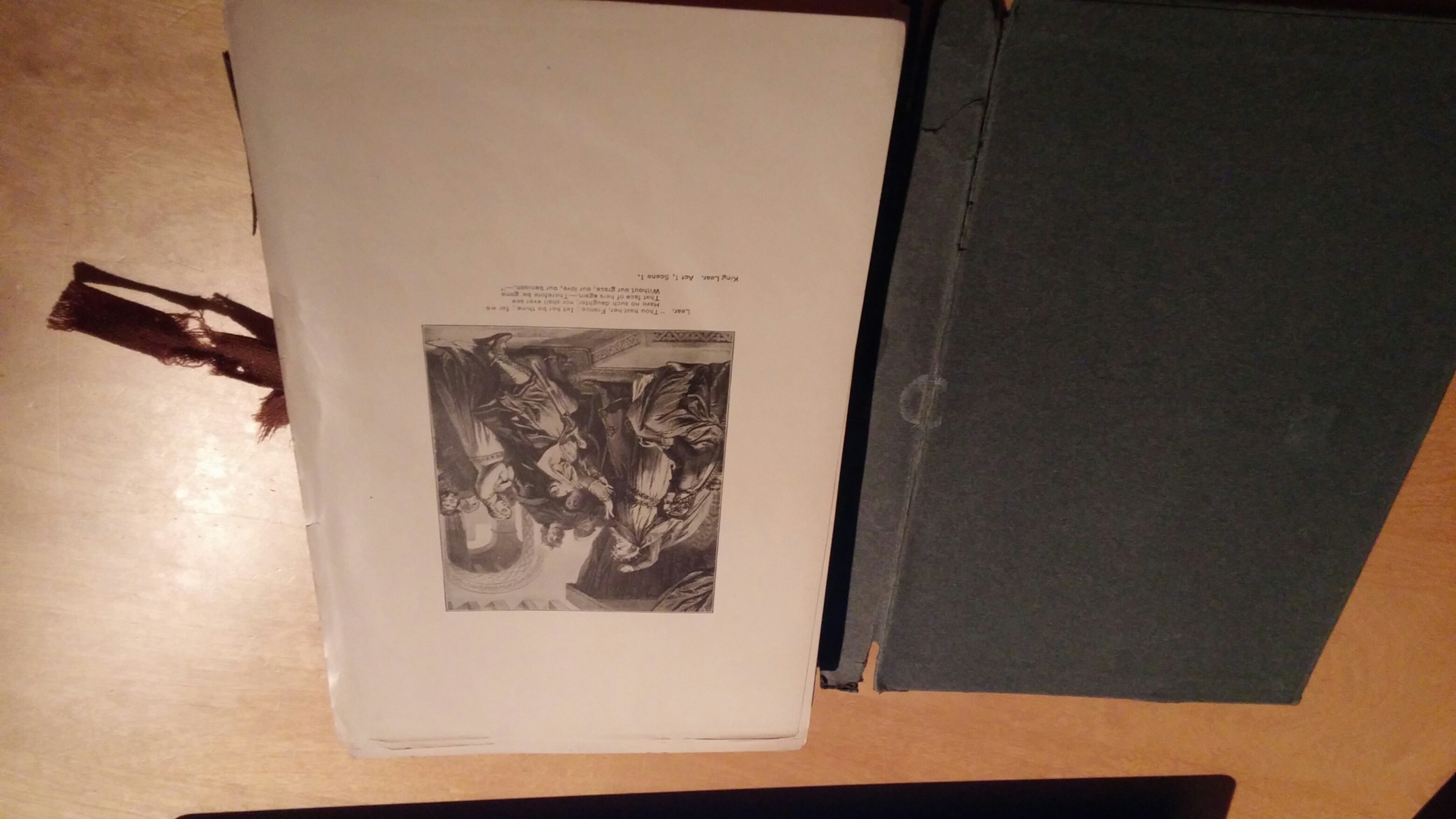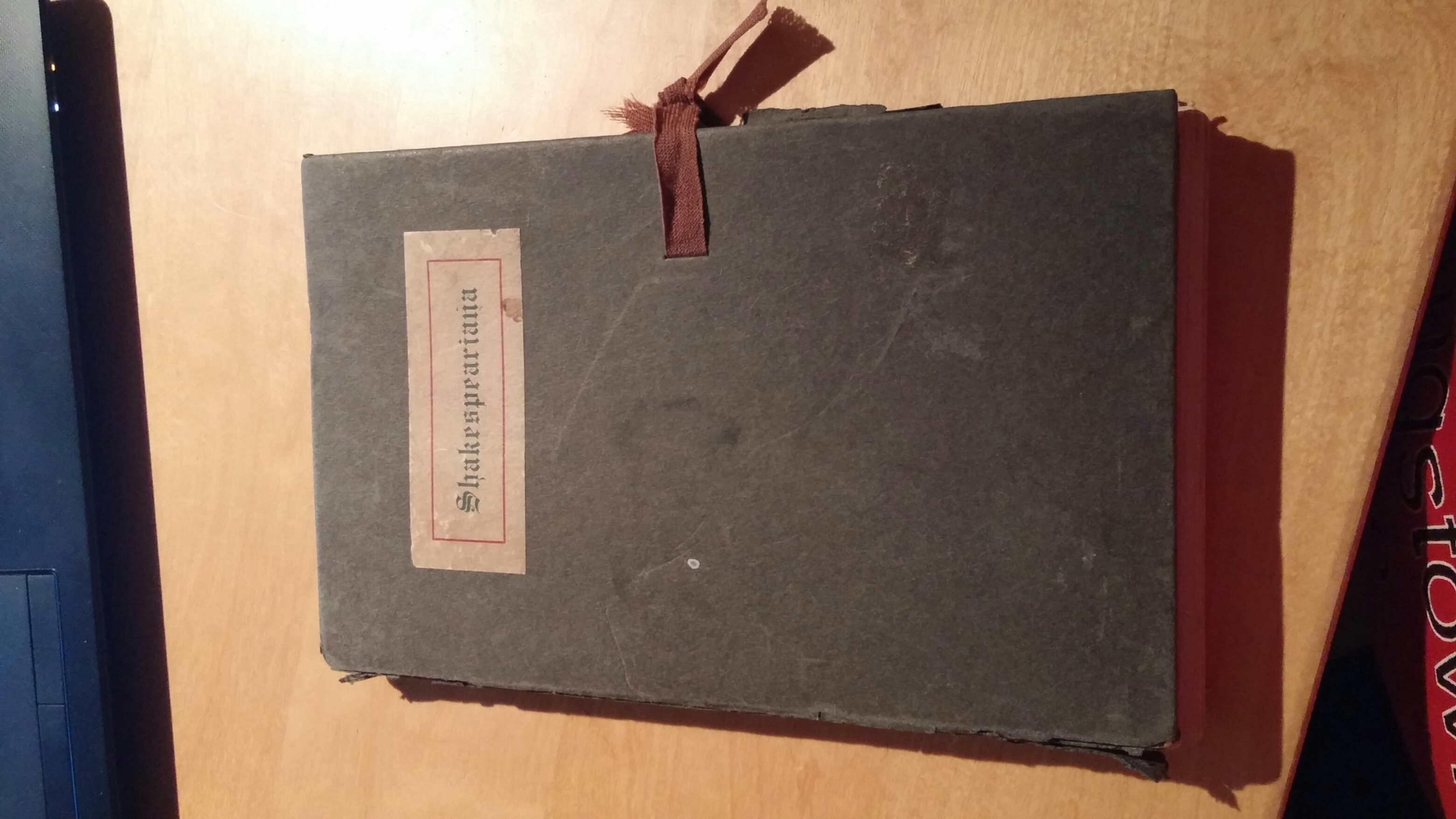 This book has a cover that is not fixed to the pages, it ties closed. The cover is in rough shape. The label on outside of the book says Shakespeariana. Inside all of the pages depict a picture from a Shakespeare play. It lists Play, act and scene that the picture and statement comes from. A few are just the prints of characters from play, it is listed on the print. There are 145 pages.