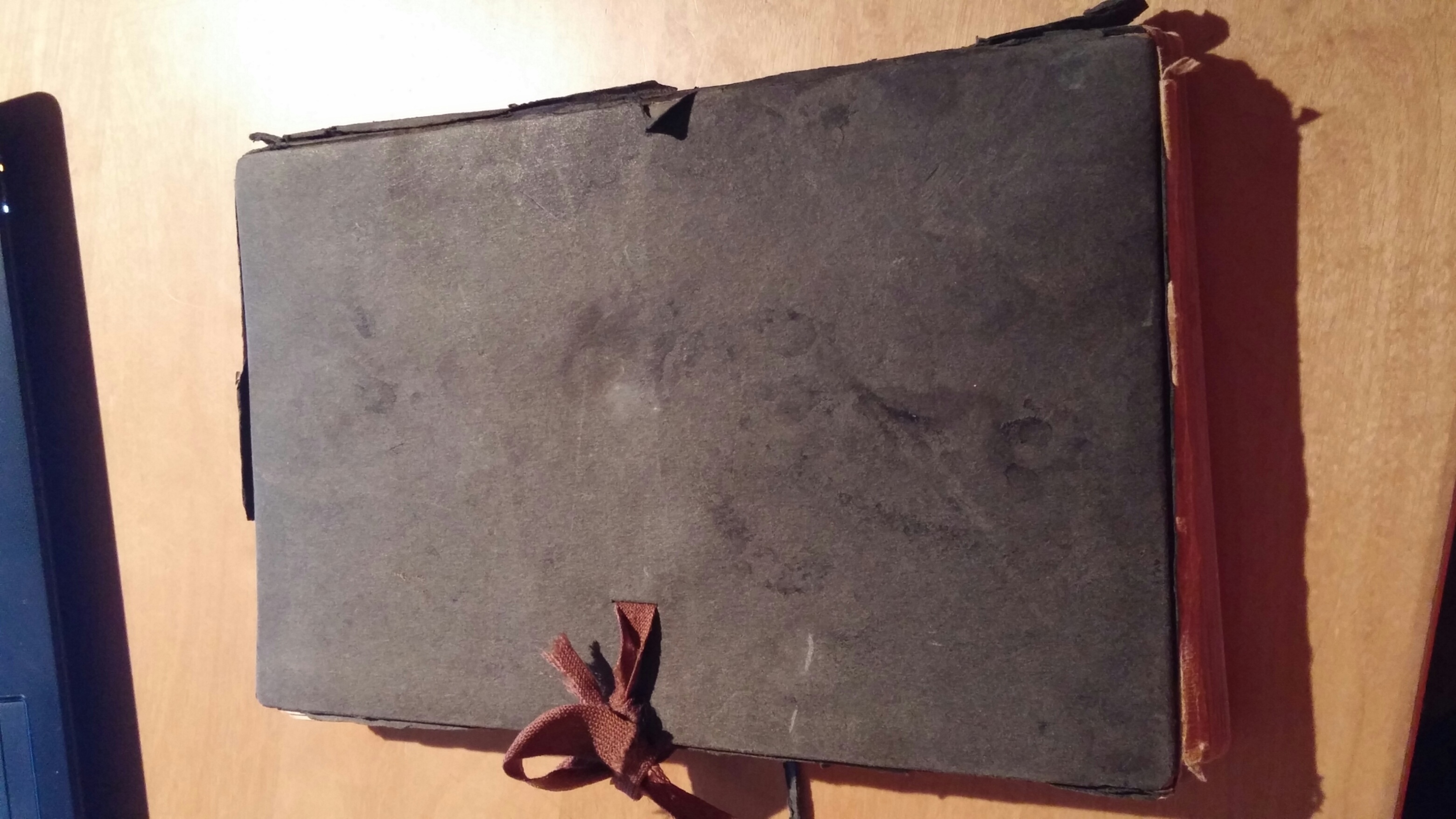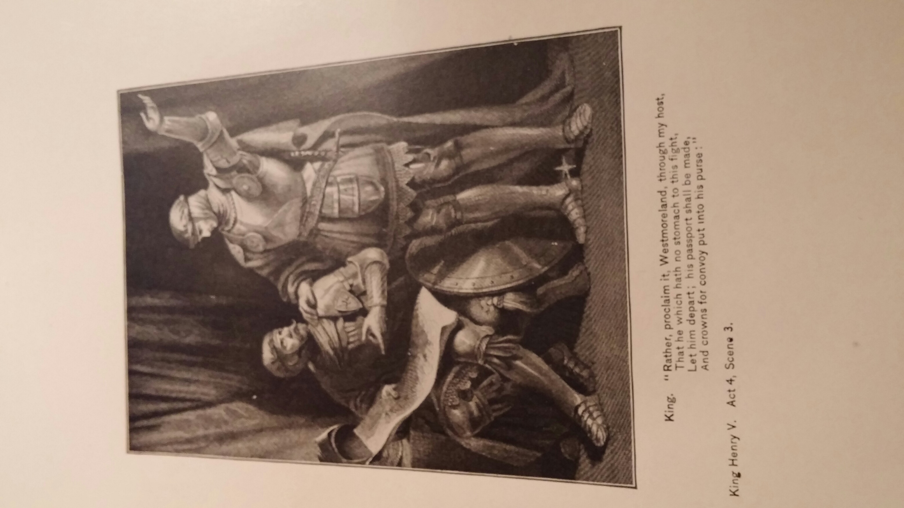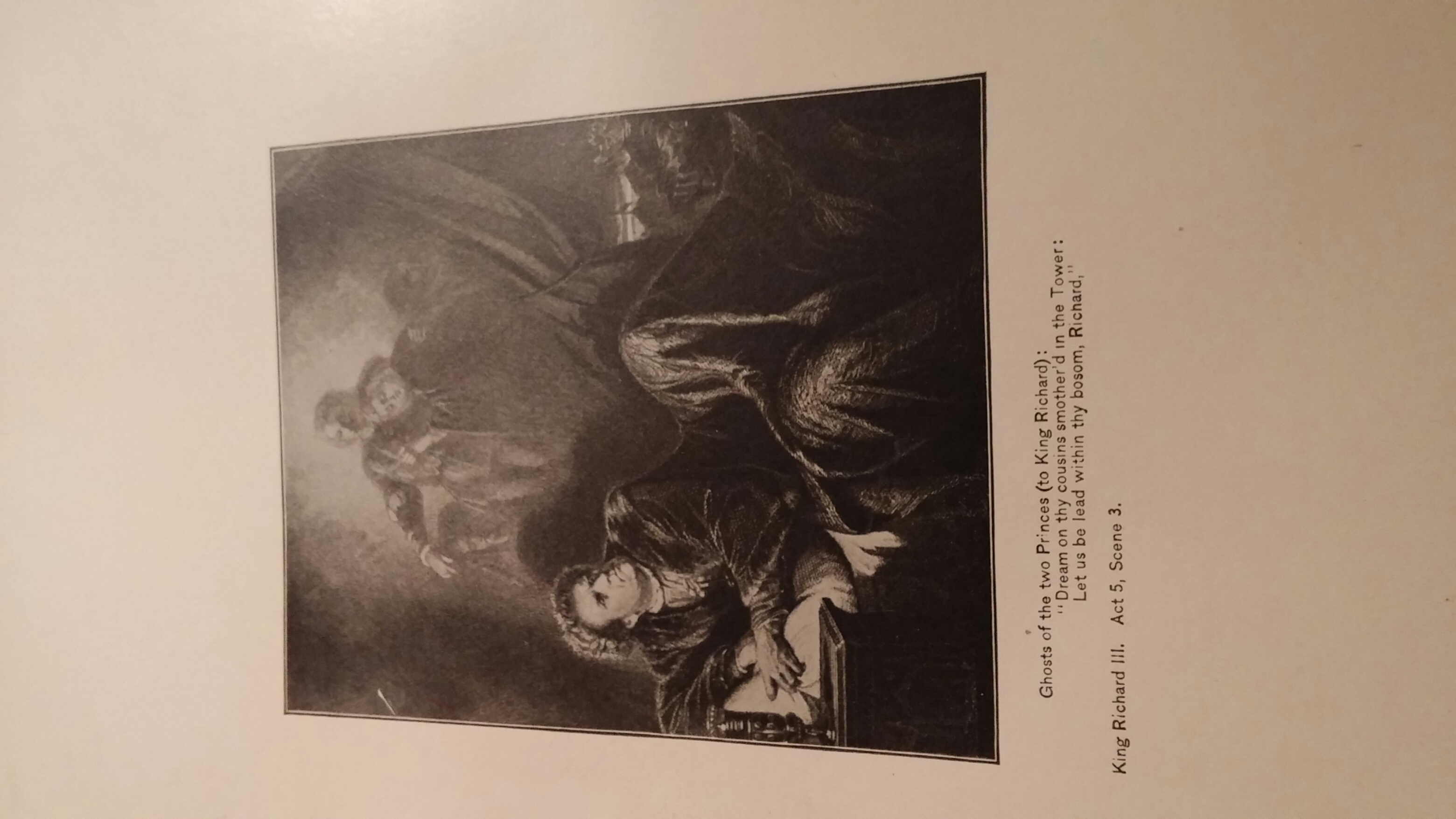 This book has a cover that is not fixed to the pages, it ties closed. The cover is in rough shape. The label on outside of the book says Shakespeariana. Inside all of the pages depict a picture from a Shakespeare play. It lists Play, act and scene that the picture and statement comes from. A few are just the prints of characters from play, it is listed on the print. There are 145 pages.