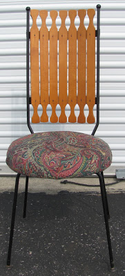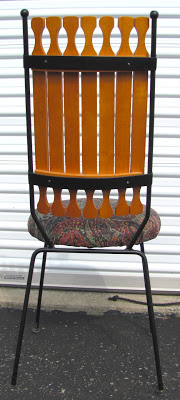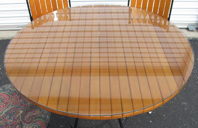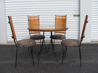 It has a wooden tabletop with black iron looking legs and chairs have the same black iron legs, wooden backs with white and blue leather seats. I curious how much these pieces are worth. The table and chairs in pics are not my set by an exact match minus the seat covering which I described mine above. Any info on tho set would be greatly appreciated.