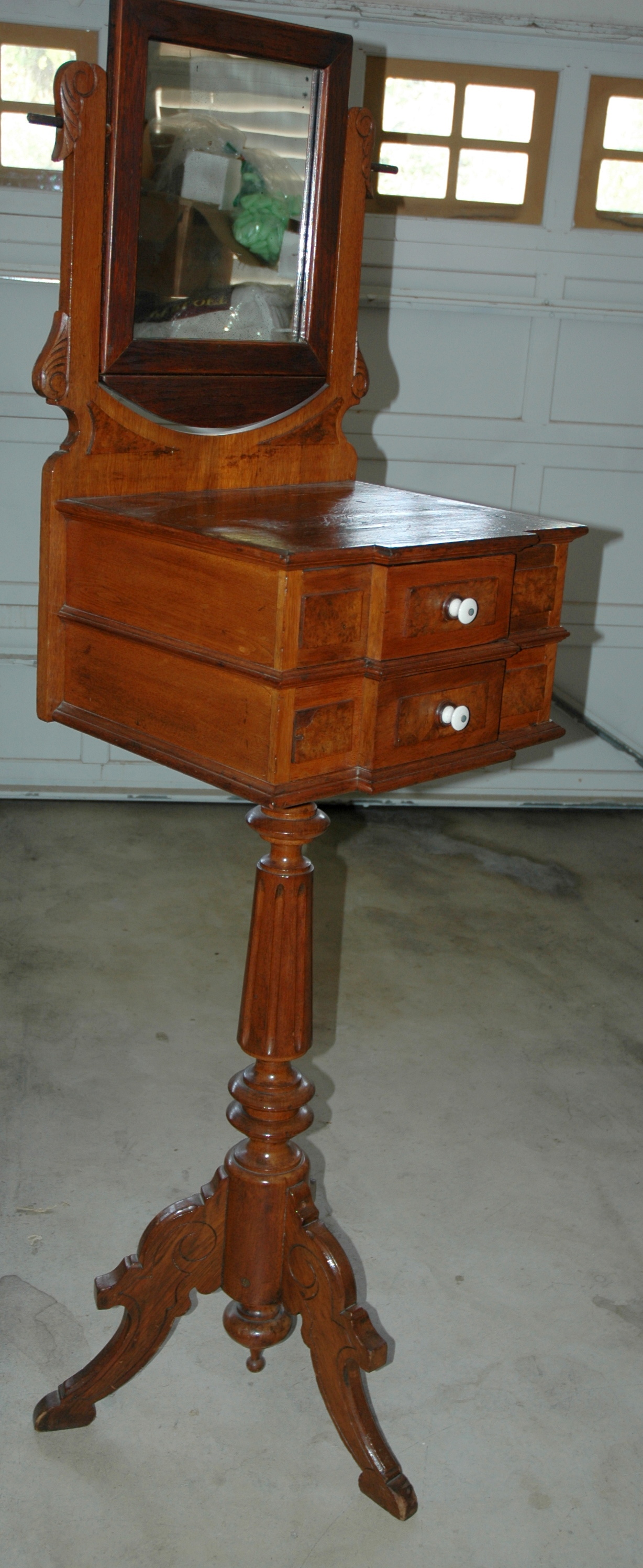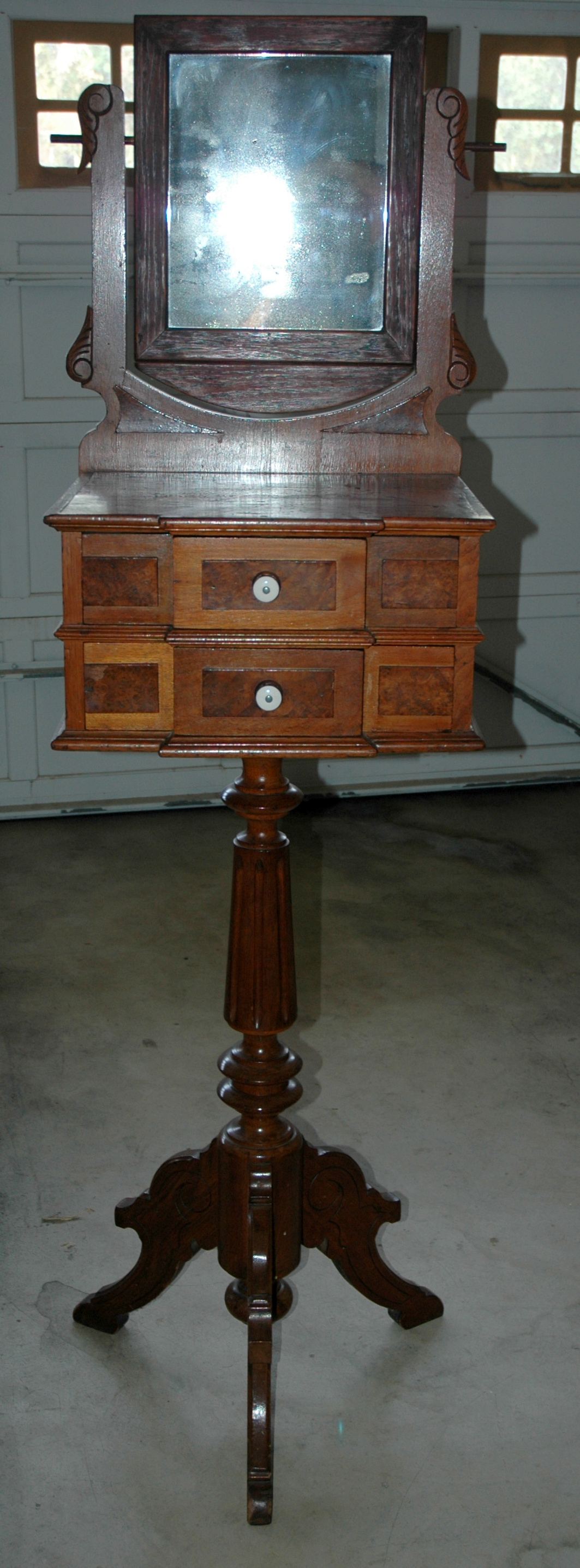 Mirror adjusts for height of man. Suspect that large bowl would sit on top surface and man would shave in mirror.