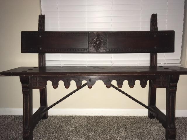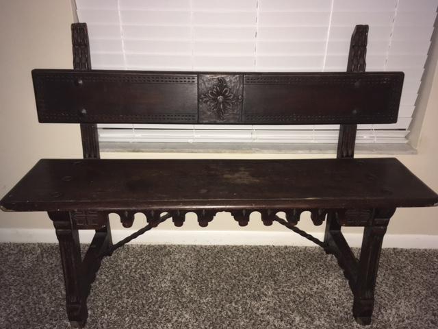Dark wood bench/church pew with engravings. two crosses on legs and a metal flower on bench back as shown in photos. Rods under church pew are metal and are twisted. I think the plate found under the bottom that states the maker says A-4758 as an item number but can not find anything online.