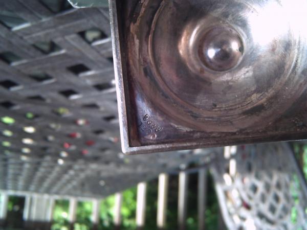 In each corner on the bottom is stamped: 1) EPNS 1200 2) Wm A Rogers 3) Sheffield Reproduction 4) two "marks". The lid latch is separated from the lid. Absolutely no dents or scratches. It has not been cleaned (not sure if I should).