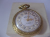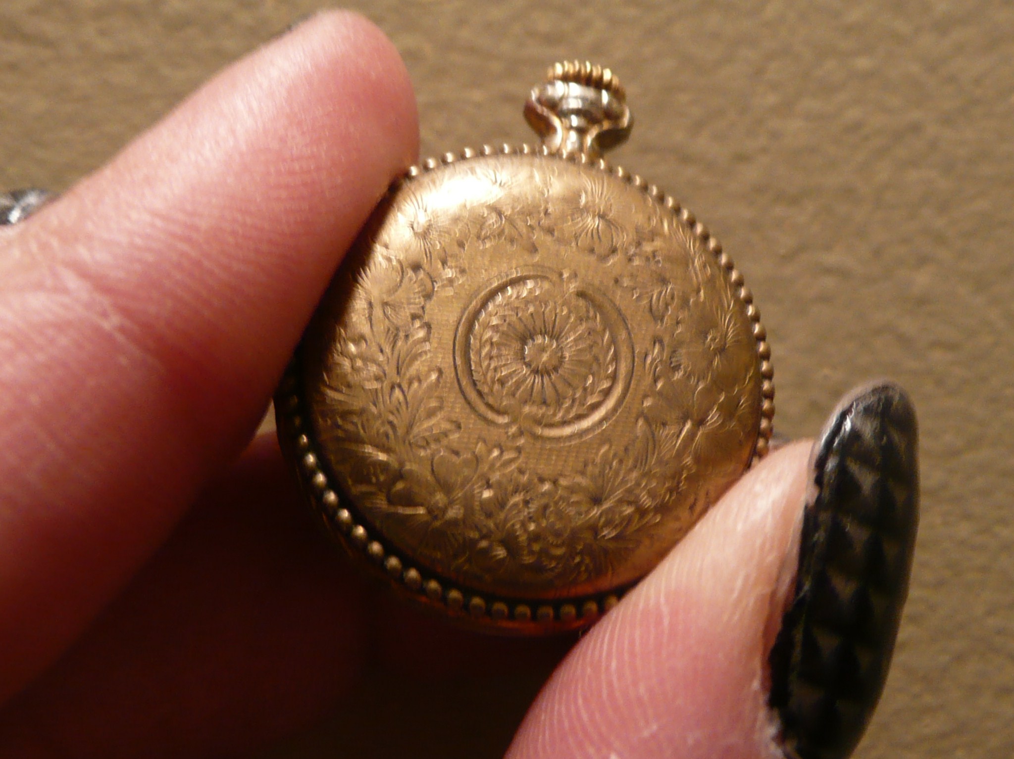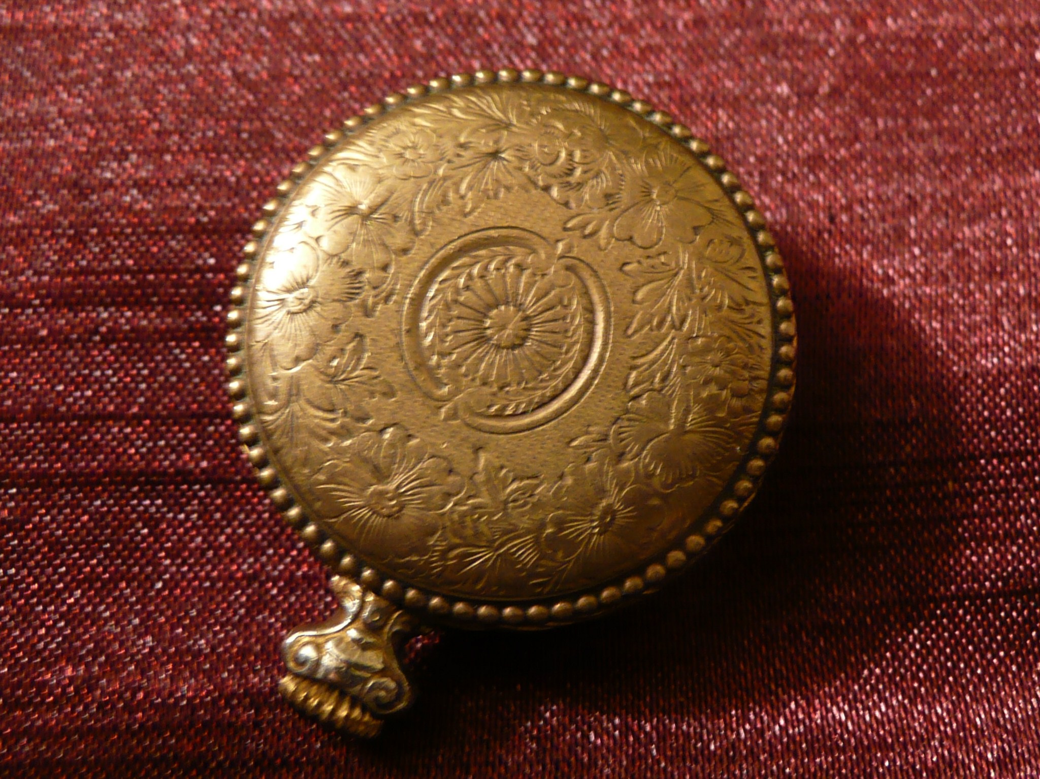 Gold tone Flower engraved  Ladies Pendant pocket watch. It is about the size of a quater with a gold tolne face also It is a wind up time piece that still works. I have had it since i was a child and really don't know if it was from my family or just something little i liked. It is sealed around the middle with a white seal. there is a hairline crack in the crystal cover only visible fron the right angle or with light. Roman numeral markings for time keeping. I know it is older than 1990 I have had that long.