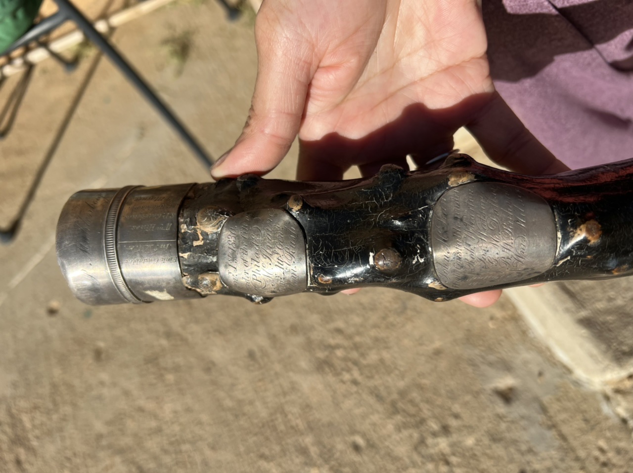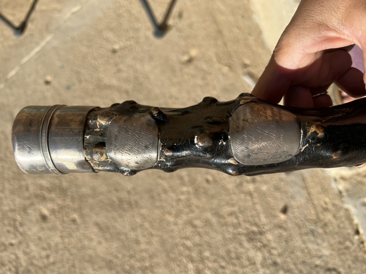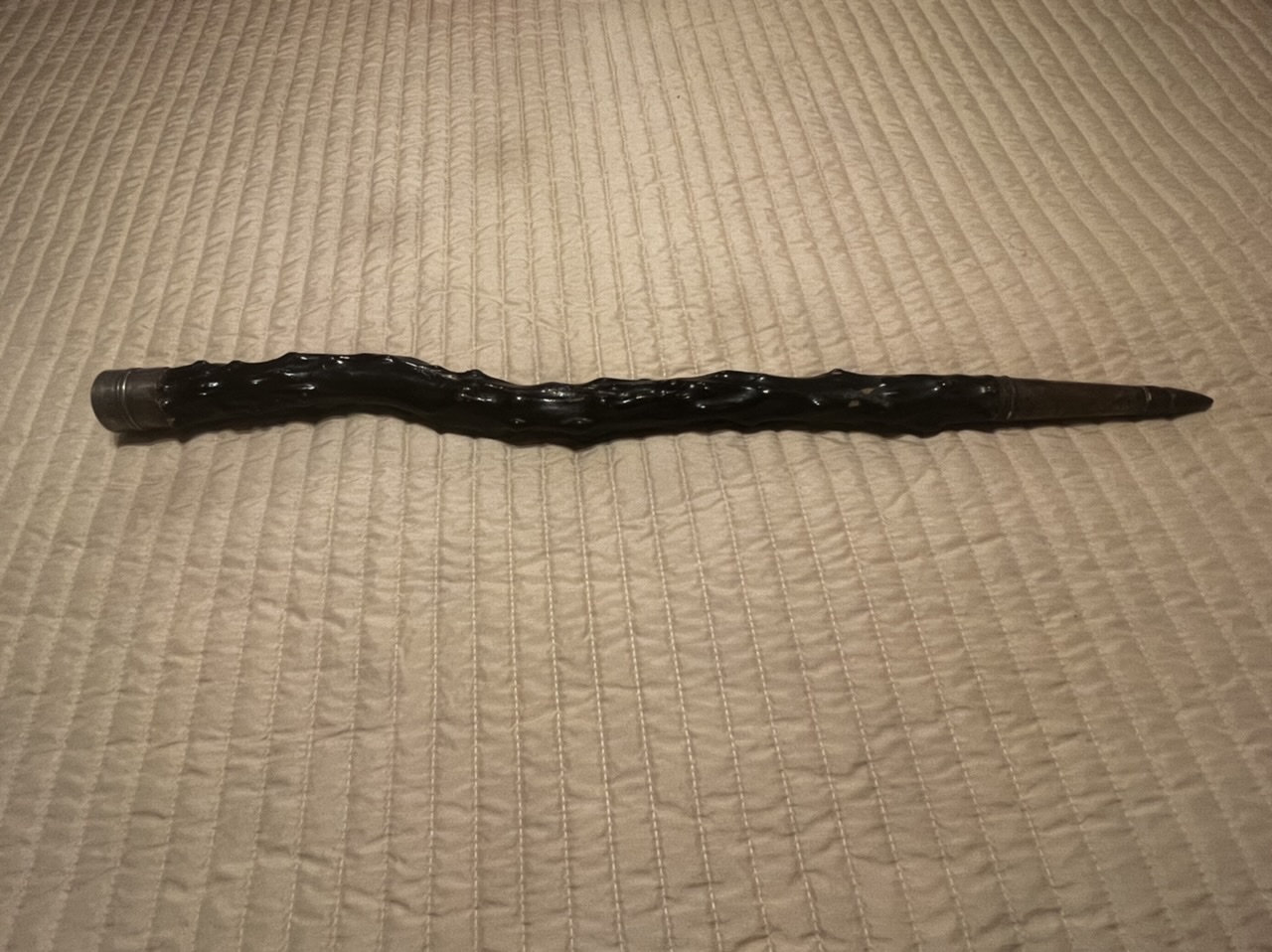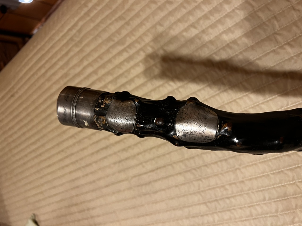 This shillelagh is a very interesting piece. It has names and dates from the 1800s on it. There are many names on this piece from that era. High constables, attorney generals, bailiffs, of Philadelphia and New York. Dates of deaths and a mention of a widow. Names like John McLean, Wm Hines, gen. P muhlenberg and many more. It’s about three feet tall I believe it has silver cap, name plates and tip. It’s a knotty wood shaft.
