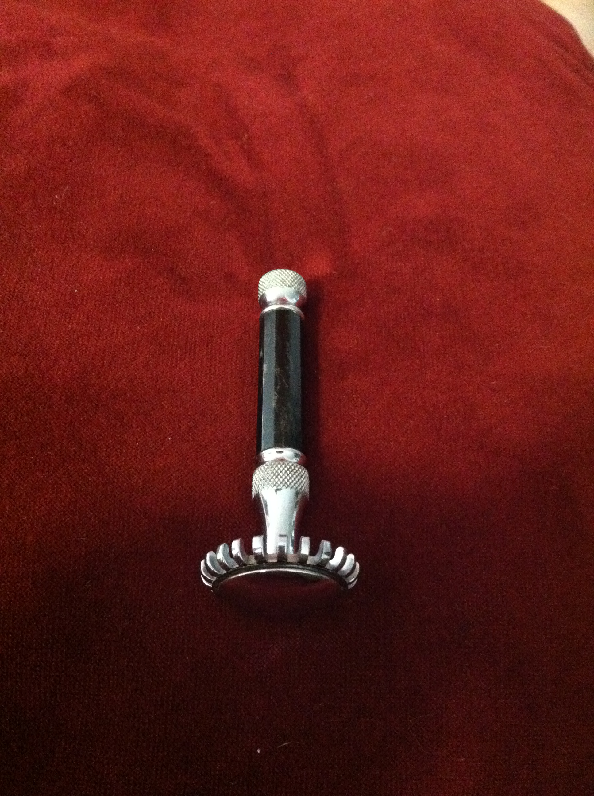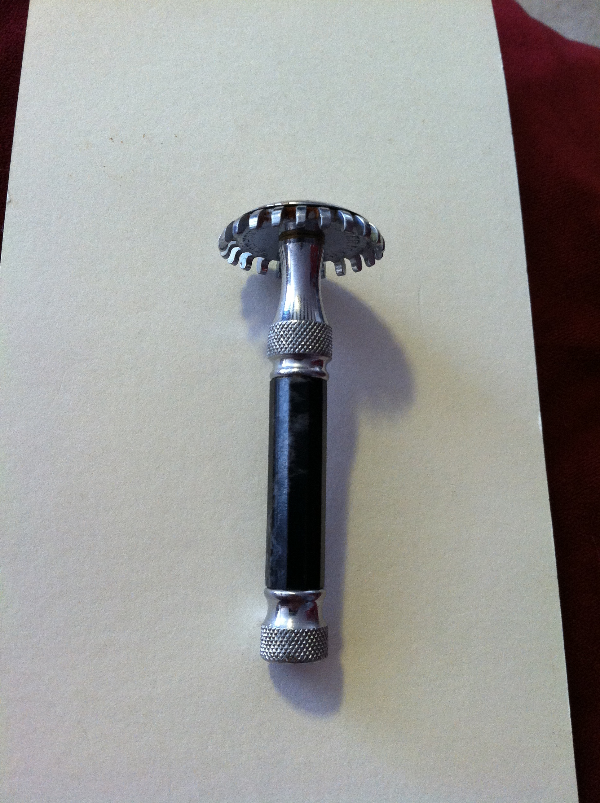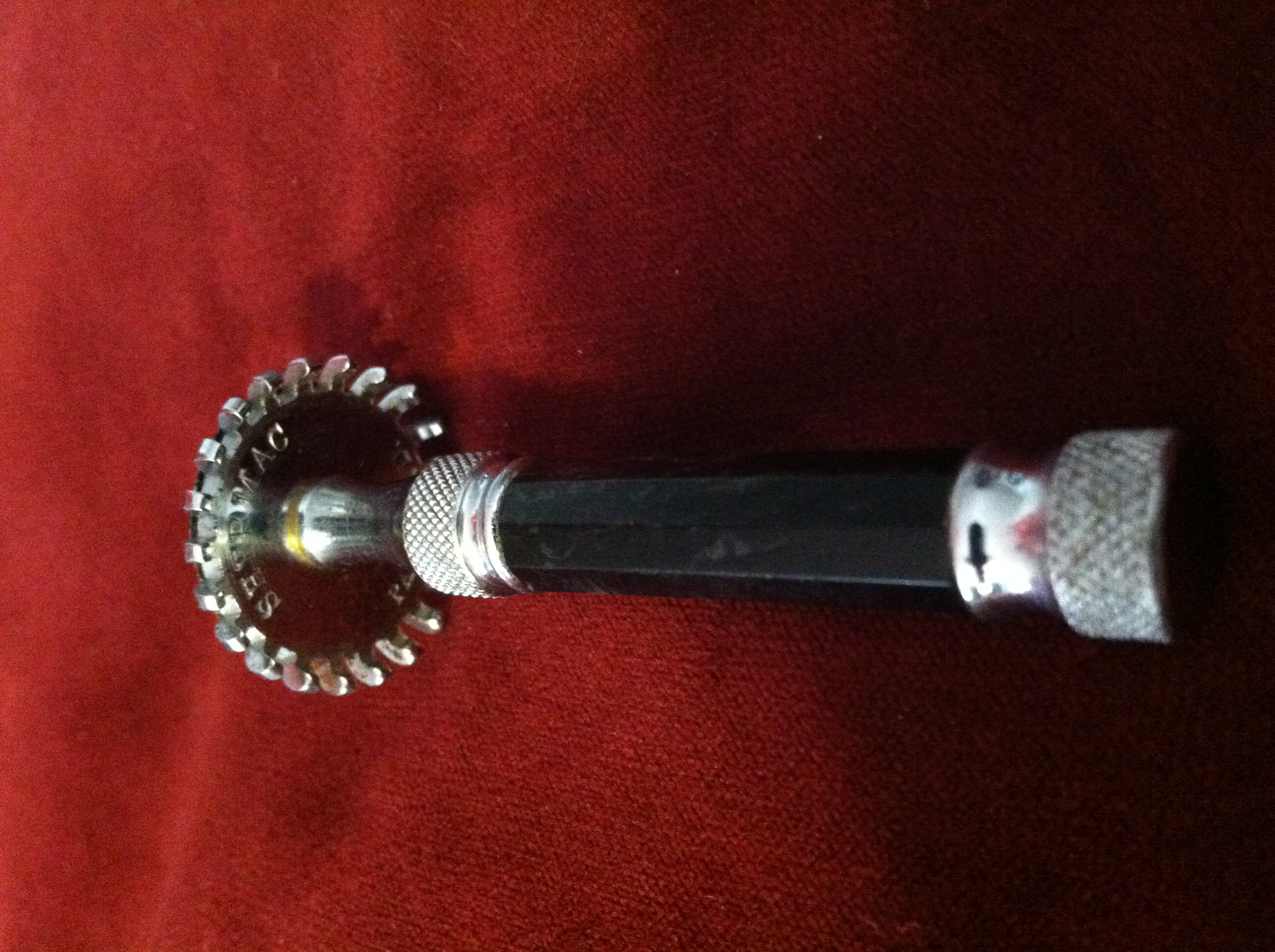 It is a vintage shermac round ladies under arm safety razor with a black pearlized handle. It has one razor blade on it but the blade is very rusted and has a chip out of it. The razor itself seems to be in great condition.