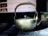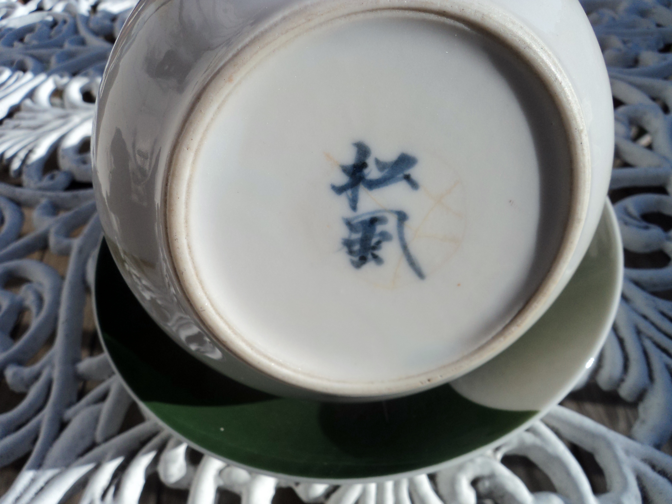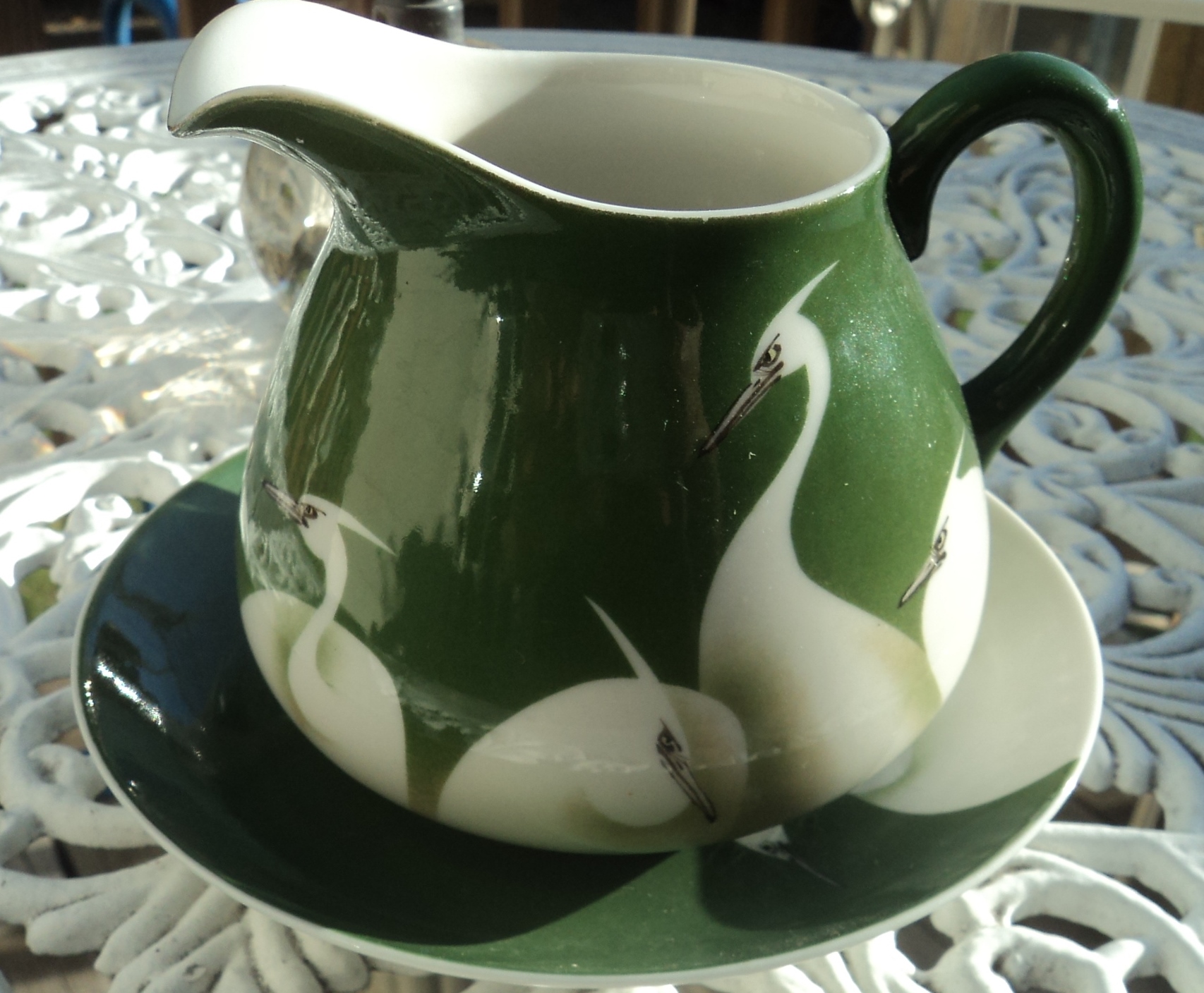 Japanese Heron Green Creamer with Plate, Estimated 1900's during Meiji Period. Marked