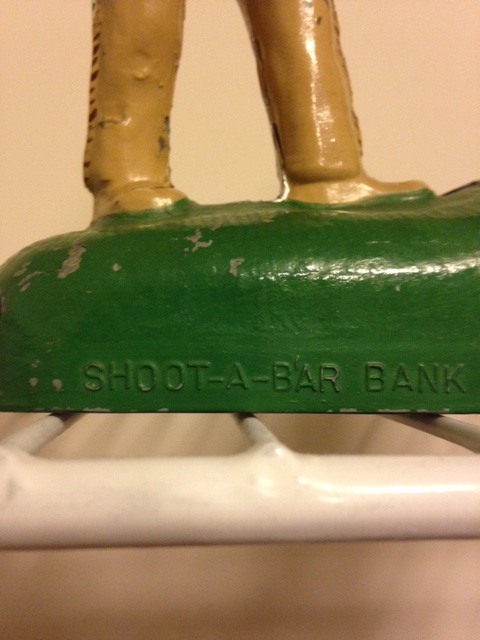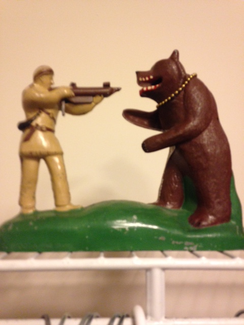 Shoot-a-b'ar penny bank in excellent condition with the exception of the spring not locking into place, however the spring will fire a penny/coin into the bears mouth.