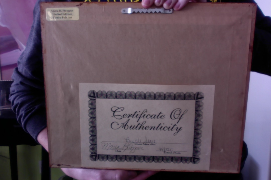 Print 44/500 by Maria D. Pfropper done in 1996. 9x7 in. Certificate of authenticity on back with signature and certificate number 441500. Artist is from Dryden, Michigan.