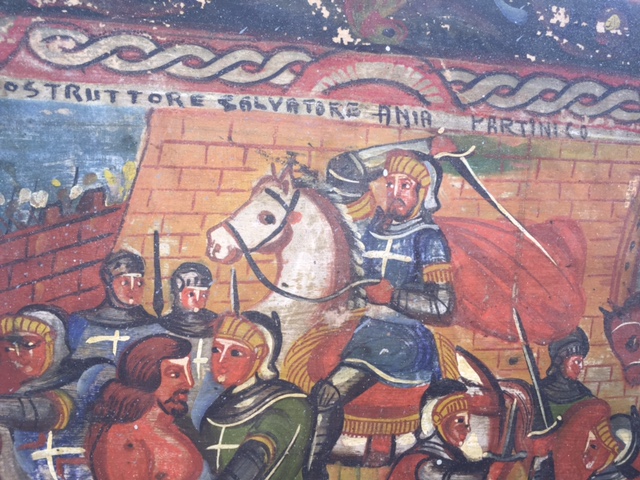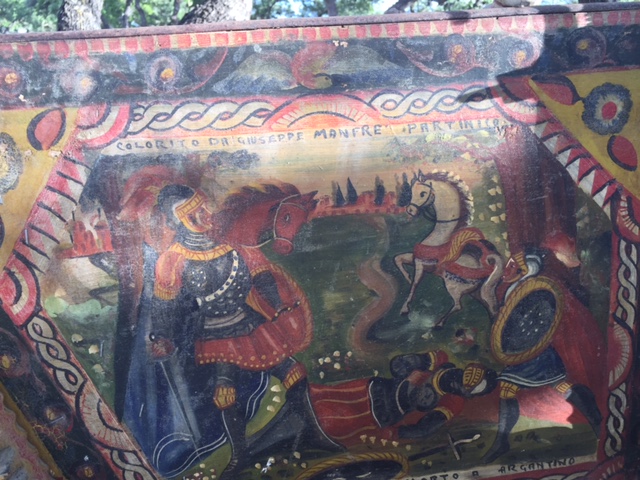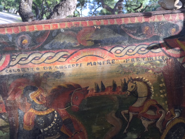 We purchased this item 30 years ago at an auction. This cart has been sitting in a barn most of the 30 years. The writing and the story on the photo is clear, I think it is the artist names. In my opinion, it is very old and I believe that there are worm holes in the wheels. The cart is in good condition. Please e-mail us at [email protected]