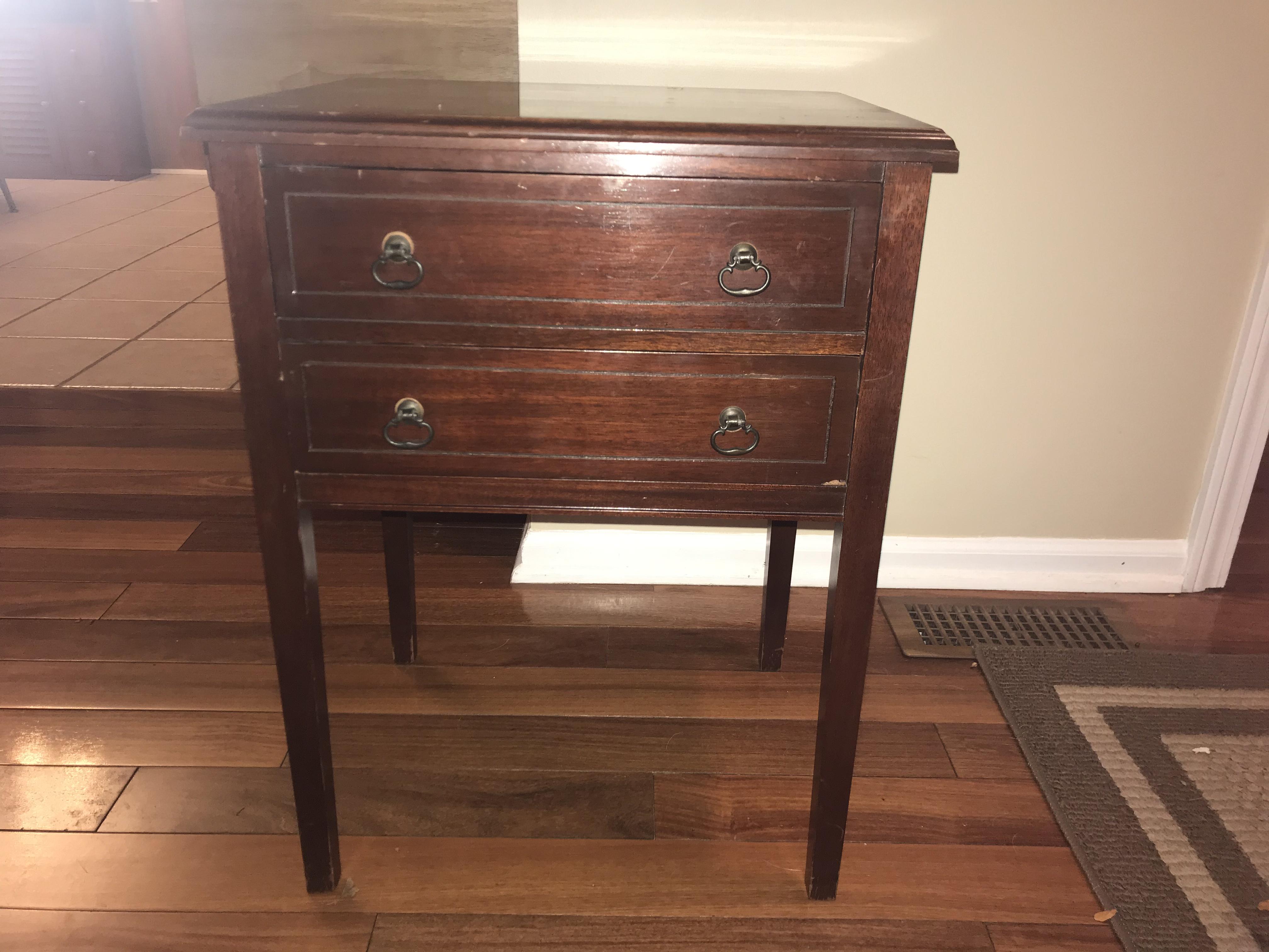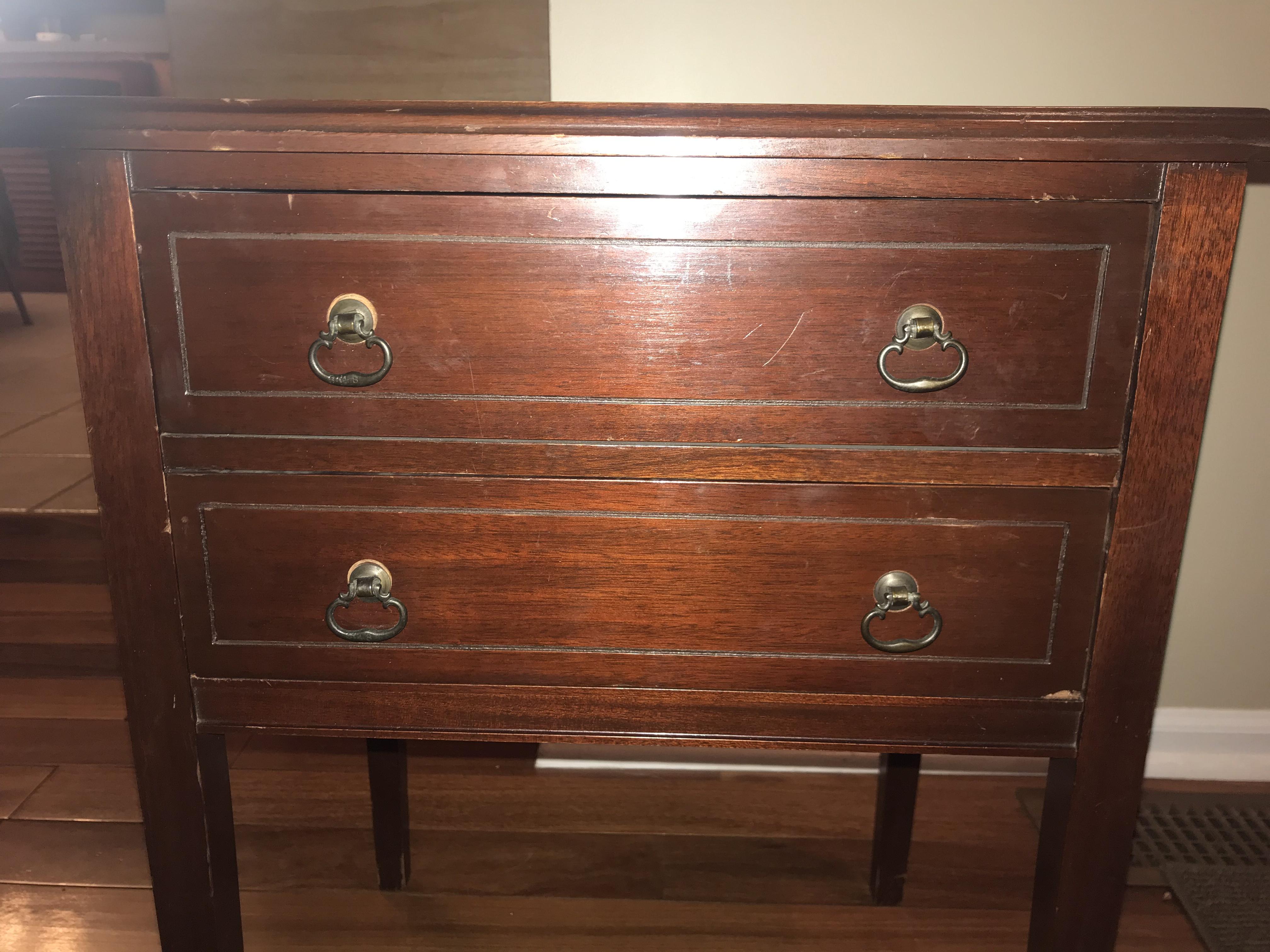 It's fairly modern, doubt it predates the late 1950's, It's designed after American Federal furniture for use as a beside or side table, probably once part of a matching suite...Not much value, under $50.00 at auction.