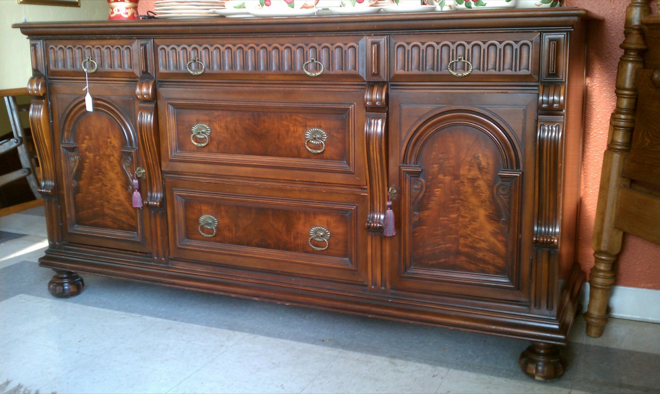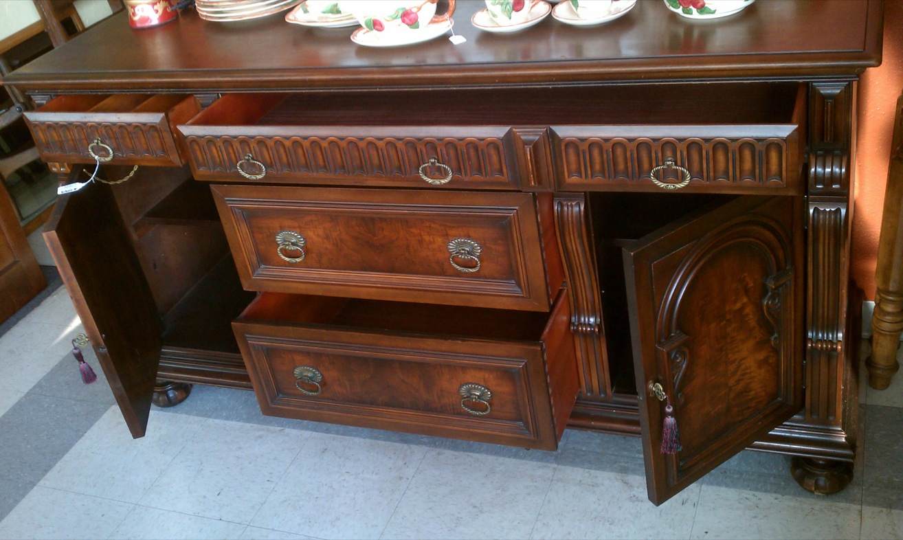 Fabulous Depression era piece. One long drawer top right, flatware drawer top left, two drawers middle, cabinet left and right. Original hardware including the tassels. Some scuffing at the flatware drawer. Overall extraordinary condition.
