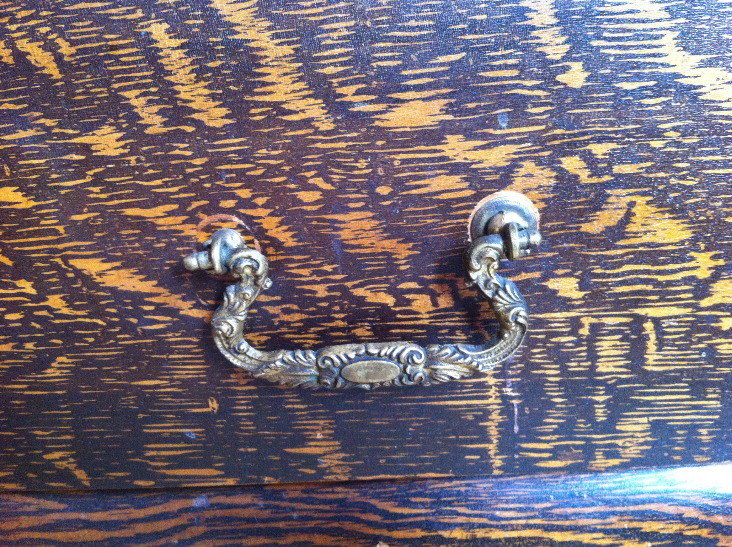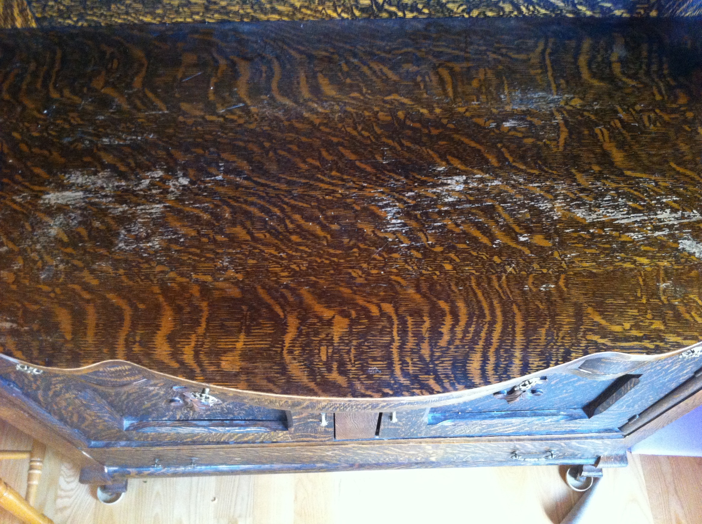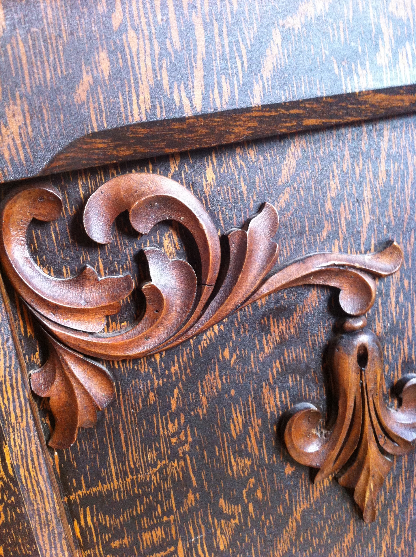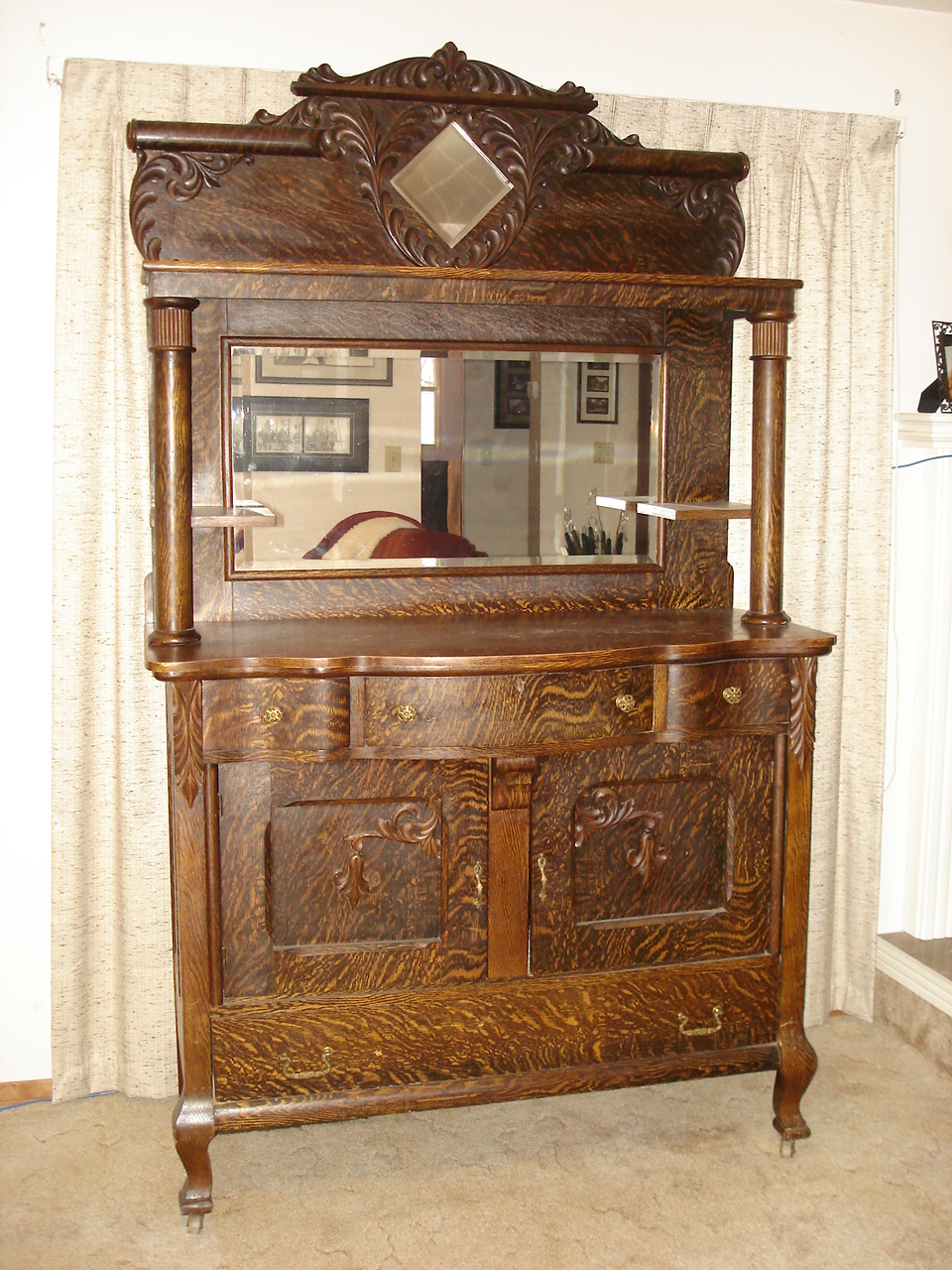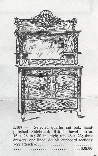 This item was purchased by a relative at an auction in Alberta, Canada, around 1967, for $50 CAD. I don't know if this is actual quarter sawn oak or some type of veneer. There is some wear to the finish on top, as well as pieces of scrollwork that have come off and either been lost or glued back on. Some of the hardware on the lower drawer pulls is missing, as well as a screw out of one of the cabinet handles. I believe any keys are lost. The closest thing I have been able to find to this piece is an etching from an 1897 catalog. I have heard that many pieces similar to this and of the same estimated age were mass-produced by machine. I am mostly interested in any history, but am also curious about the estimated value.