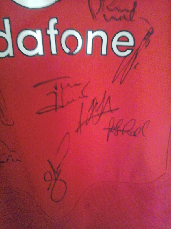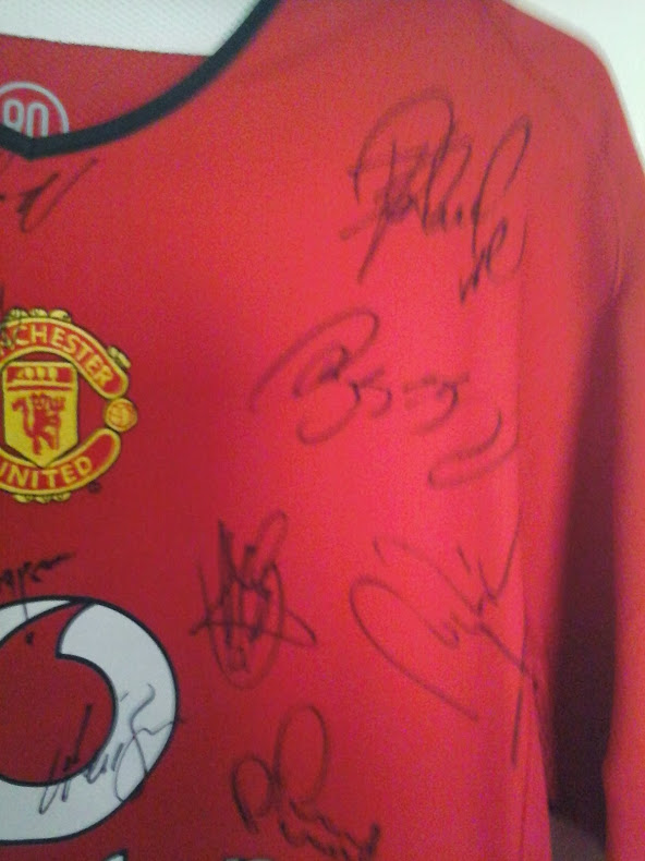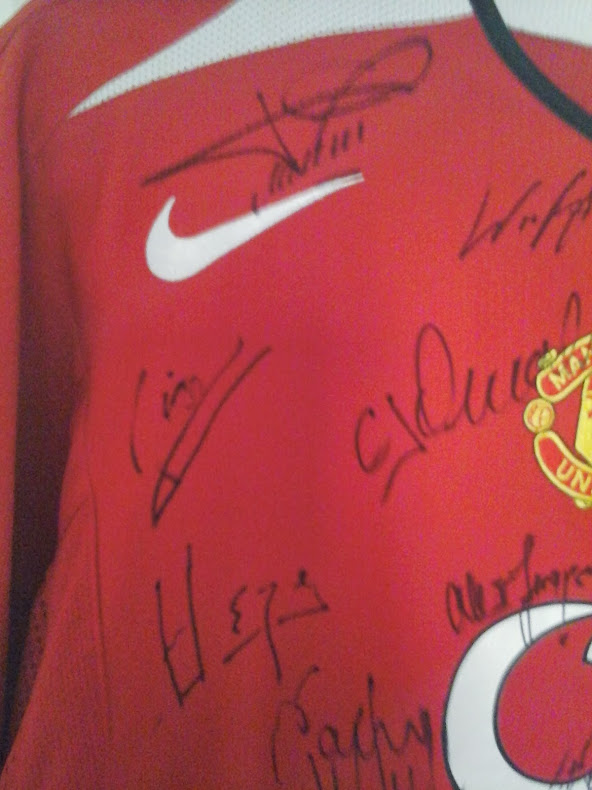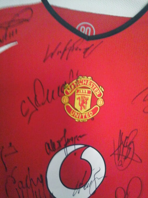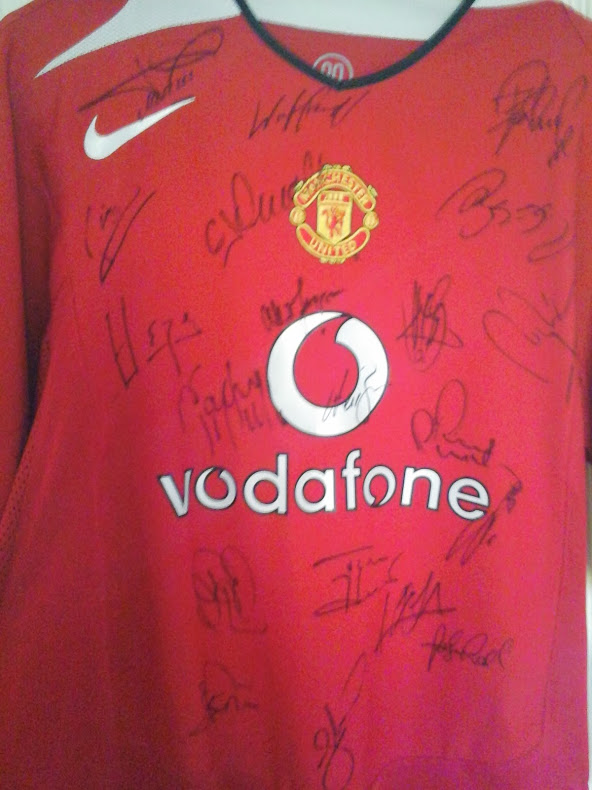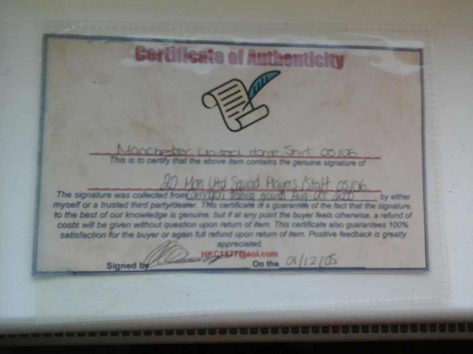 Here is my signed 05/06 Manchester United shirt. I acquired this as a gift around 7 years ago. It comes with a certificate of authentication. Signatures on the Shirt are: Louis Saha, Wayne Rooney, Quinton Fortune, Rio Ferdinand, Cristiano Ronaldo, Ryan Giggs, Gabriel Heinze, Sir Alex Ferguson, Ruud van Nistelrooy, Roy Keane, Gary Neville, Wes Brown, Paul Scholes, Ji Sung Park, Tim Howard, Ole Gunnar Solskjaer, Alan Smith, John O'Shea, Edwin Van der Sar and Mikael Silvestre. First and foremost I would like to know for sure if it is genuine. Also I would like a valuation on this item. Any help would be greatly appreciated. Thanks in advance, Richard Allison