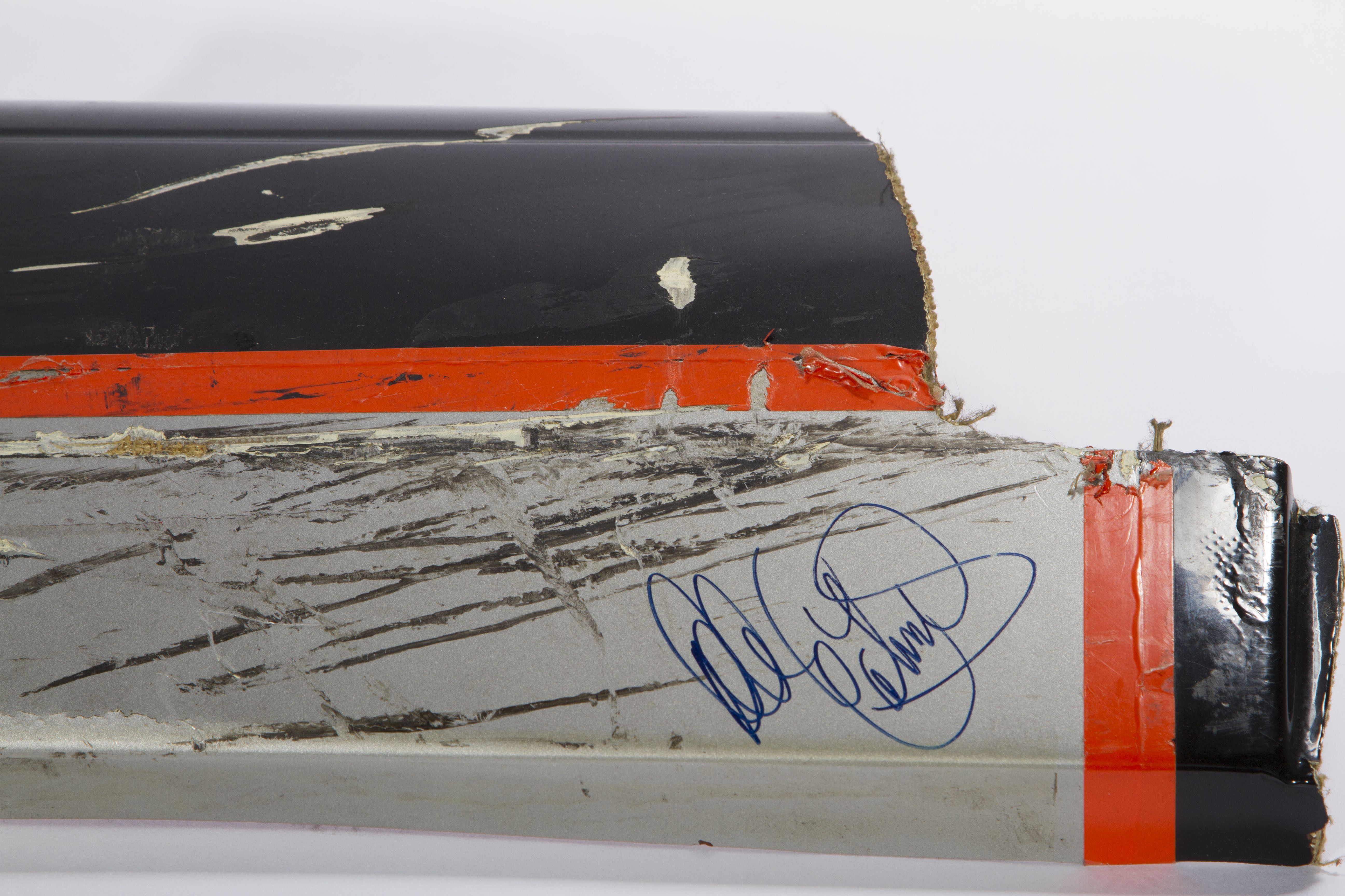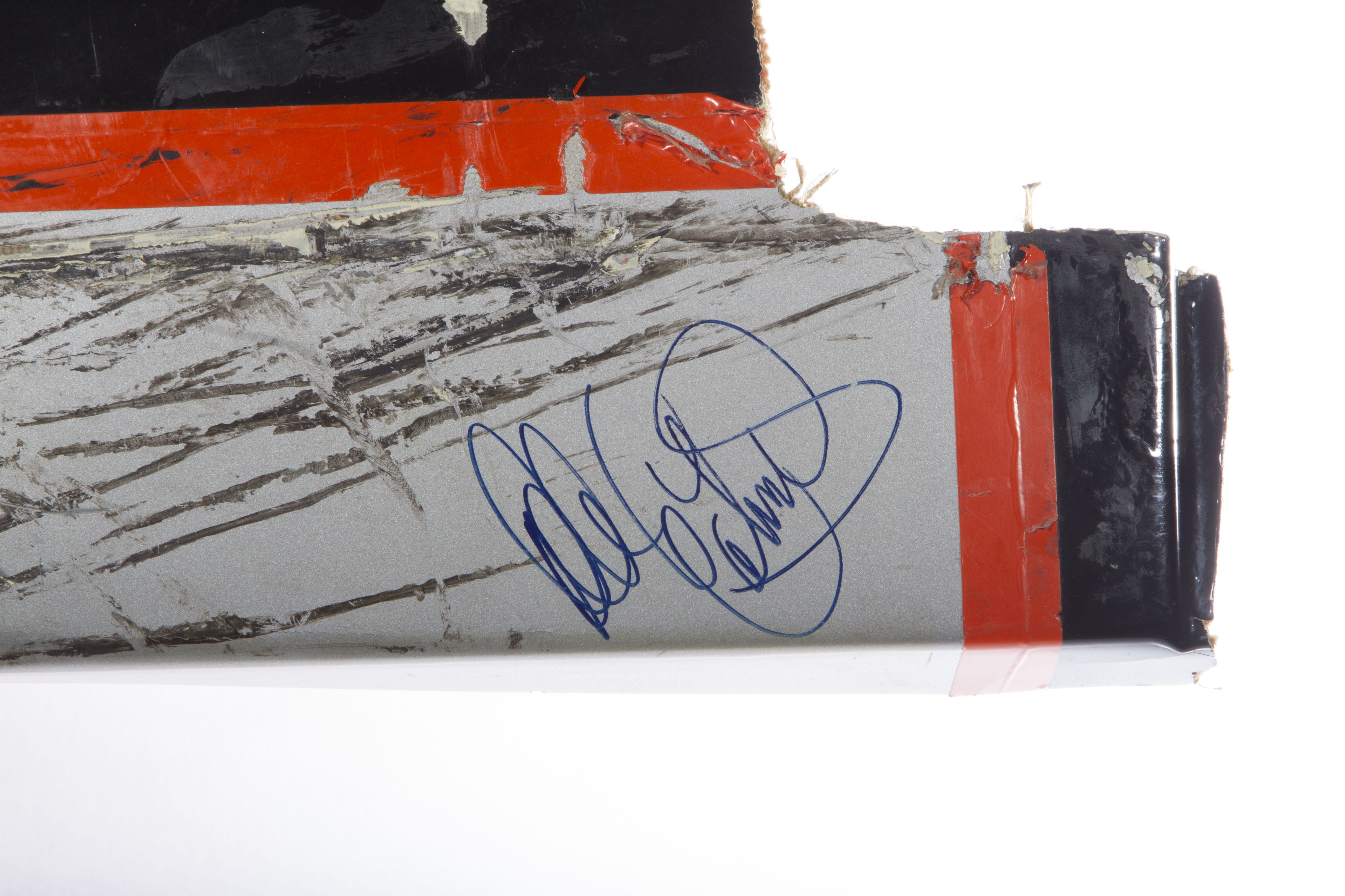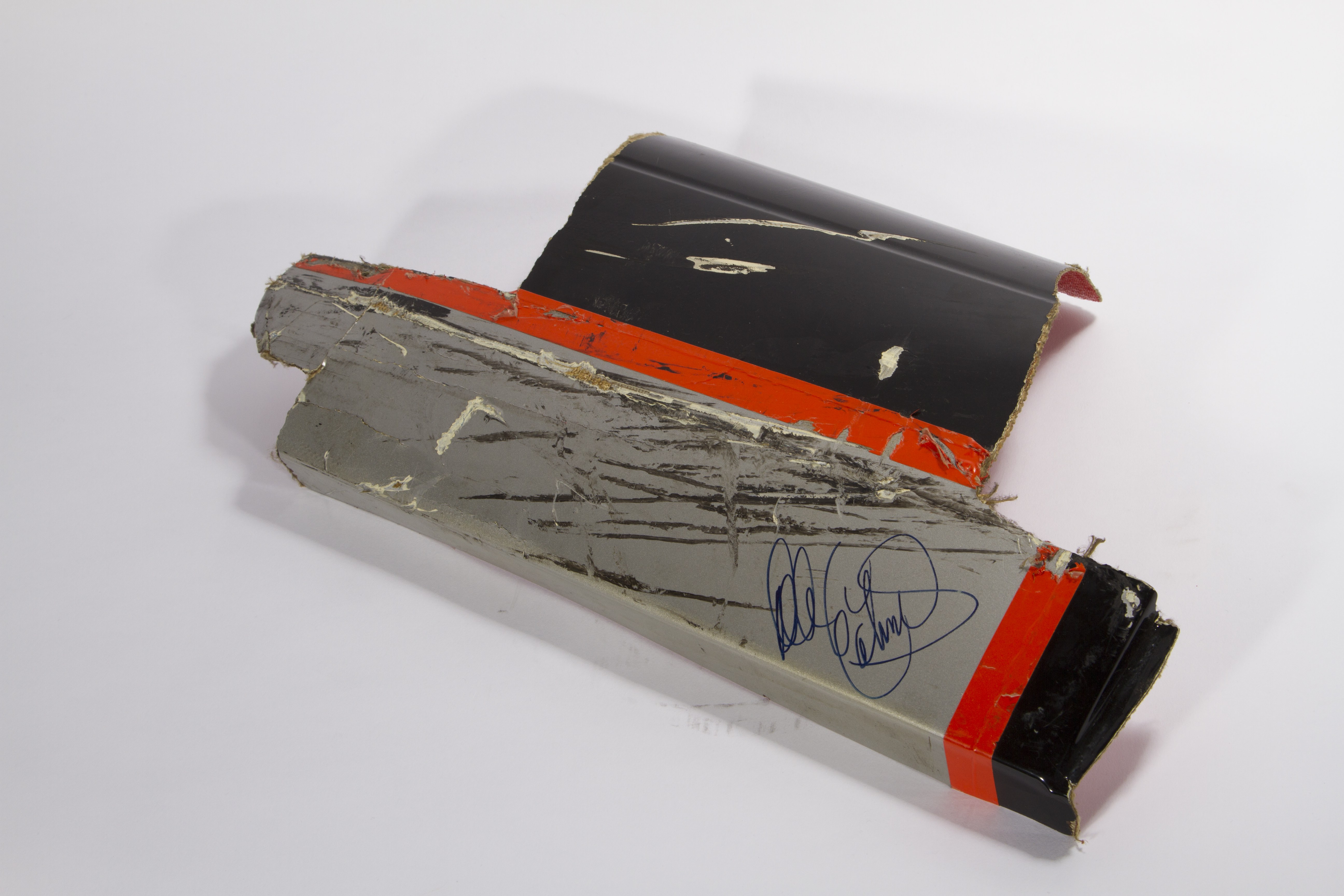 This is a piece of Dale Earnhardt Sr.'s car that was signed and given to my father. Gordon hit Earnhardt in the rear which caused the piece to rip. A member of his pit crew (Danny "Chocolate" Myers) pulled the piece from his car during a pit-stop. This was the race in Bristol, TN. It was later signed by Mr. Earnhardt and given to my father for playing a major role in a film production that was taking place at the races.
