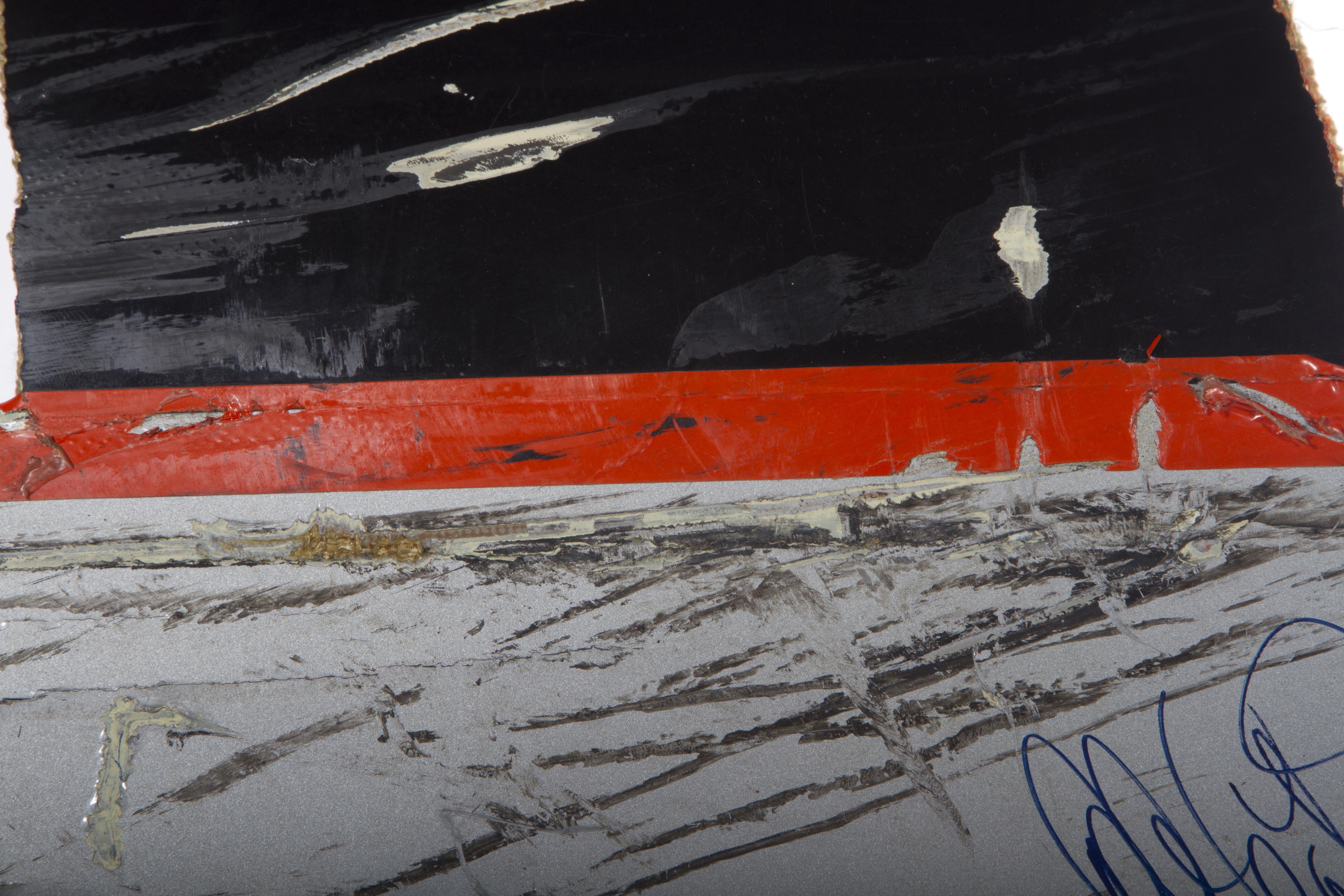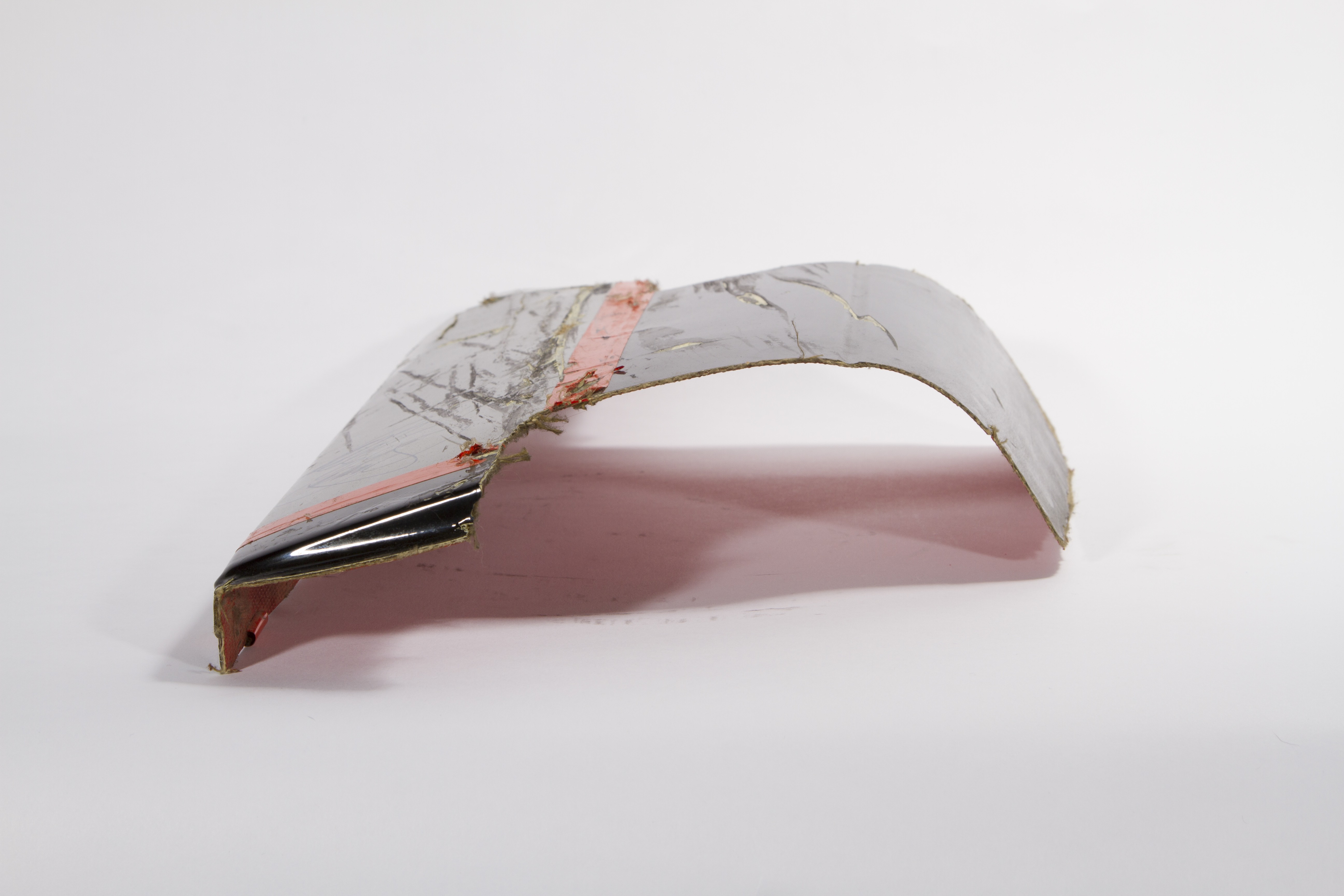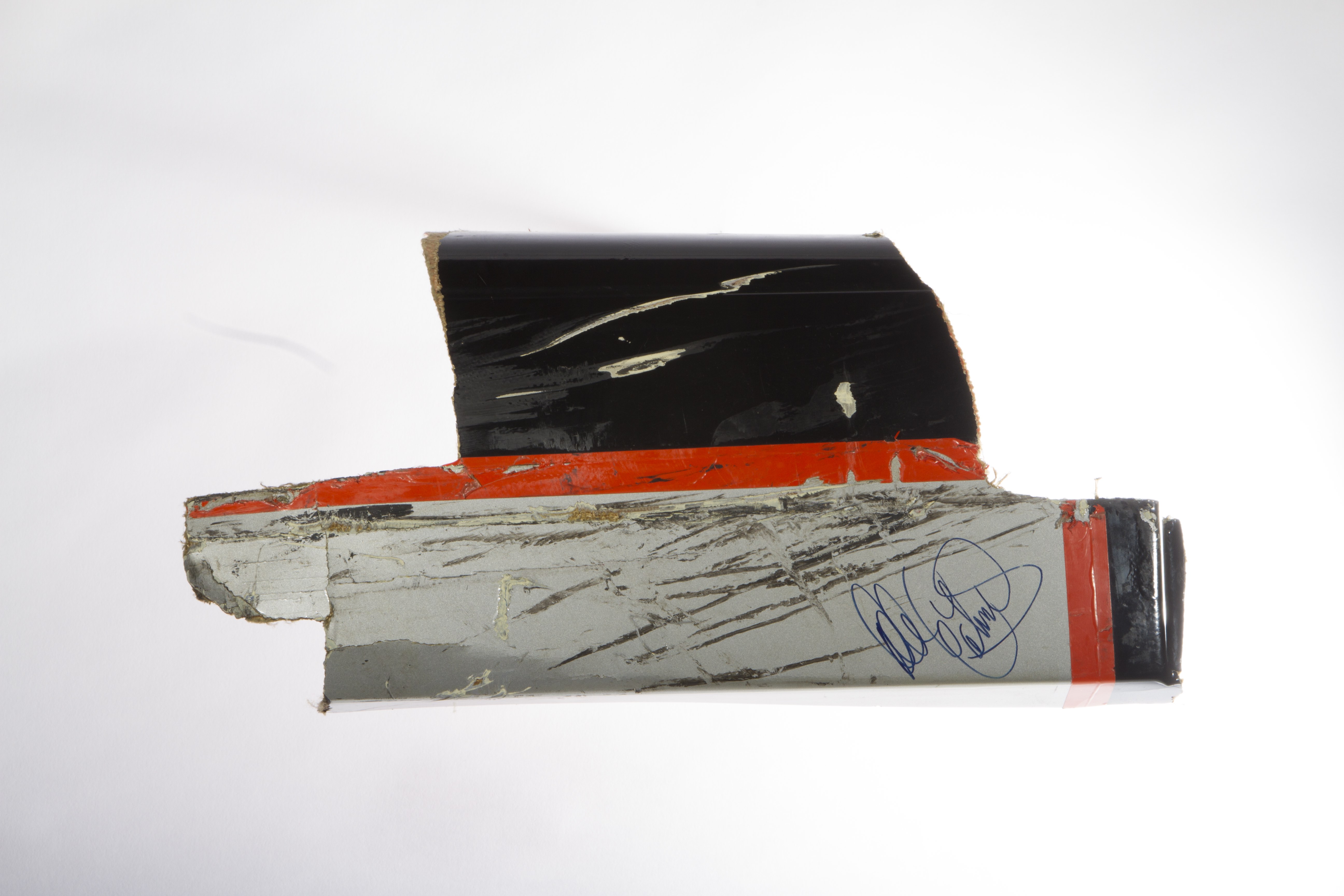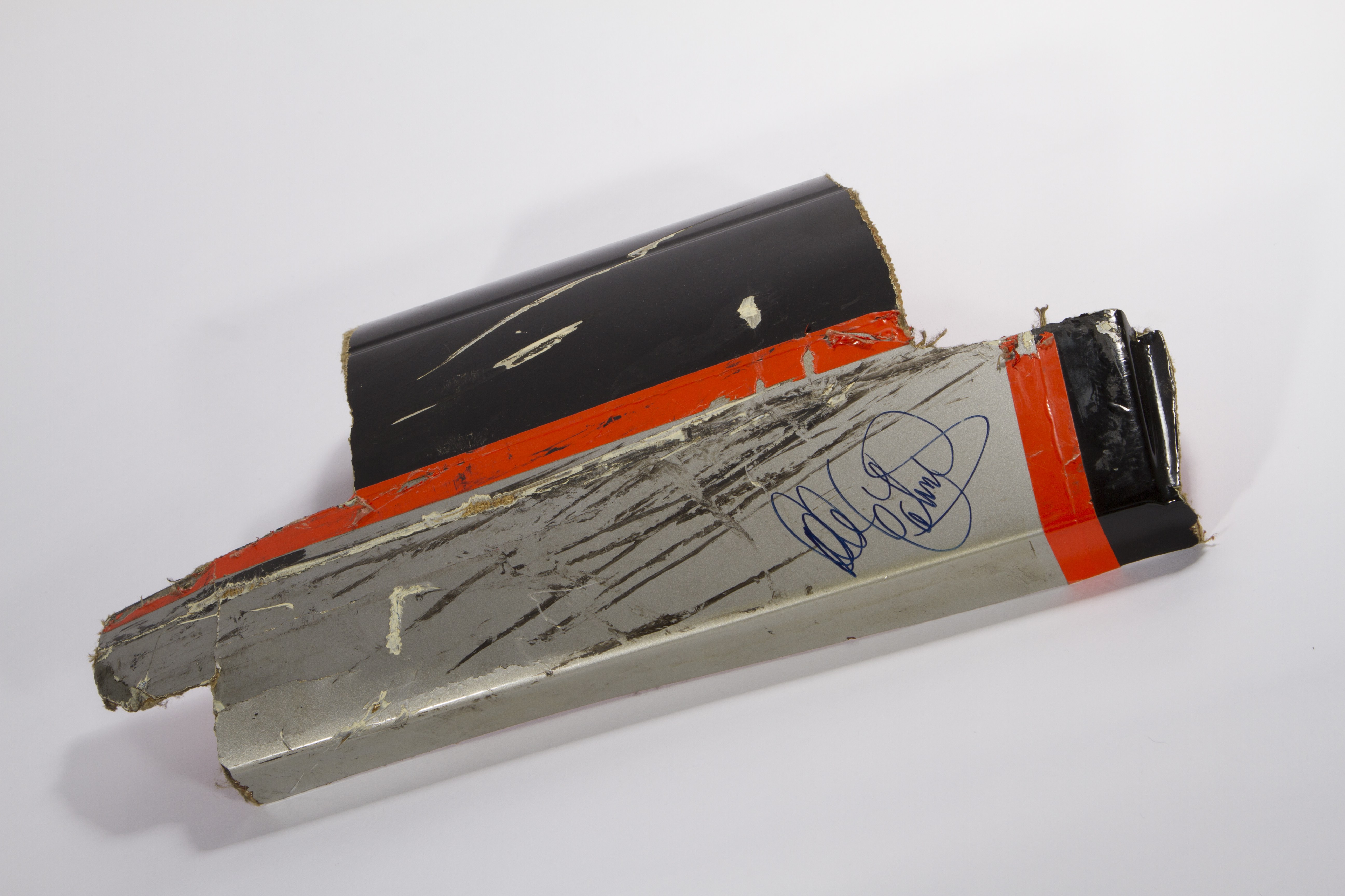 This is a piece of Dale Earnhardt Sr.'s car that was signed and given to my father. Gordon hit Earnhardt in the rear which caused the piece to rip. A member of his pit crew (Danny "Chocolate" Myers) pulled the piece from his car during a pit-stop. This was the race in Bristol, TN. It was later signed by Mr. Earnhardt and given to my father for playing a major role in a film production that was taking place at the races.