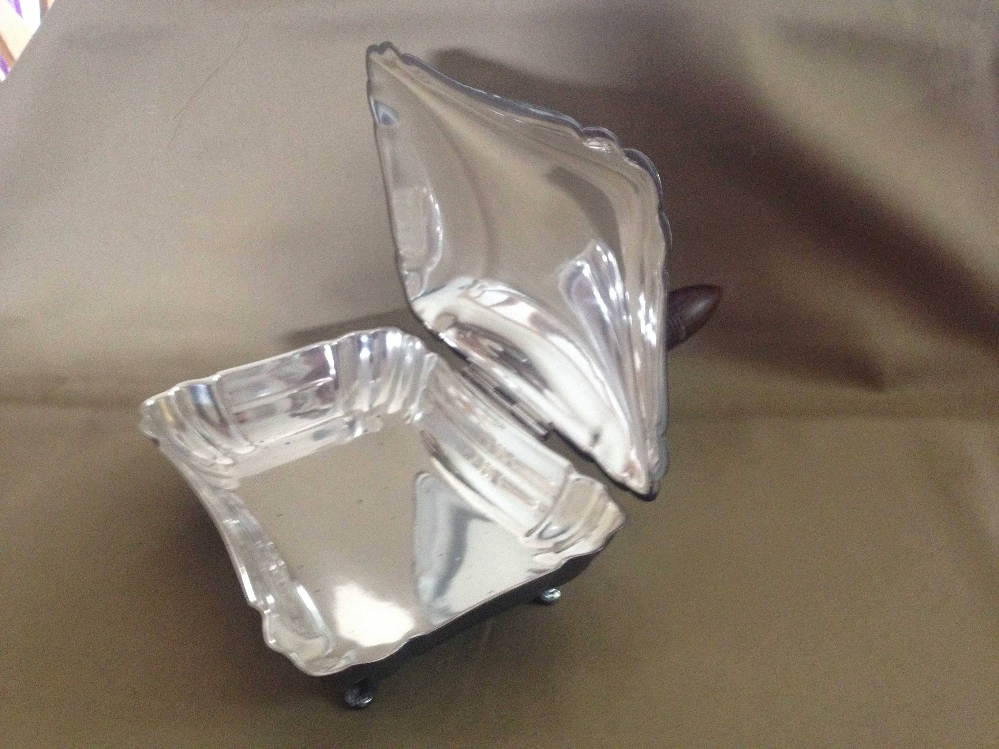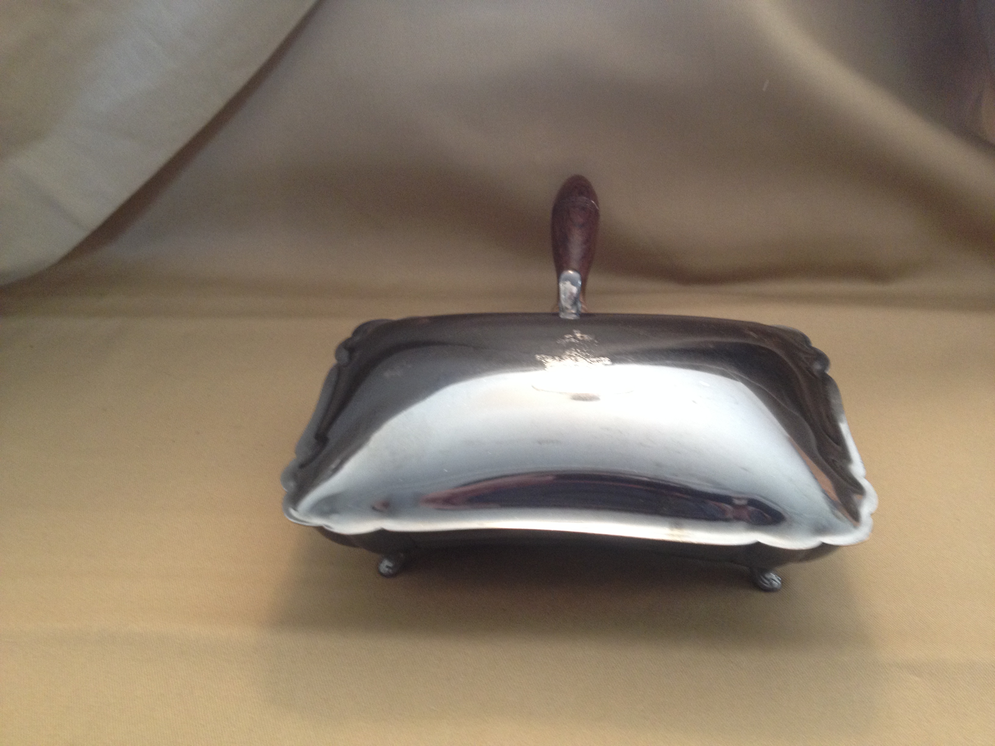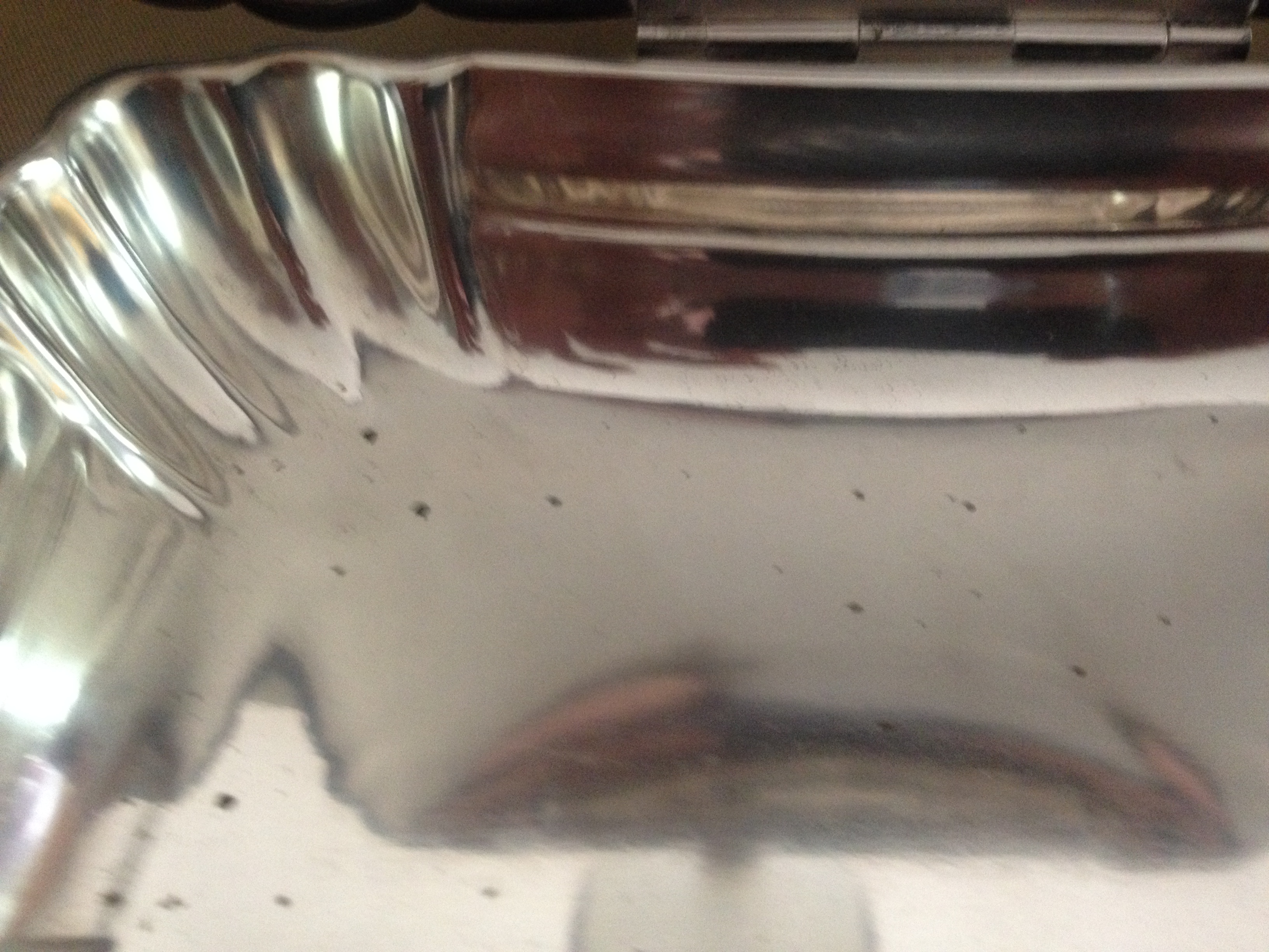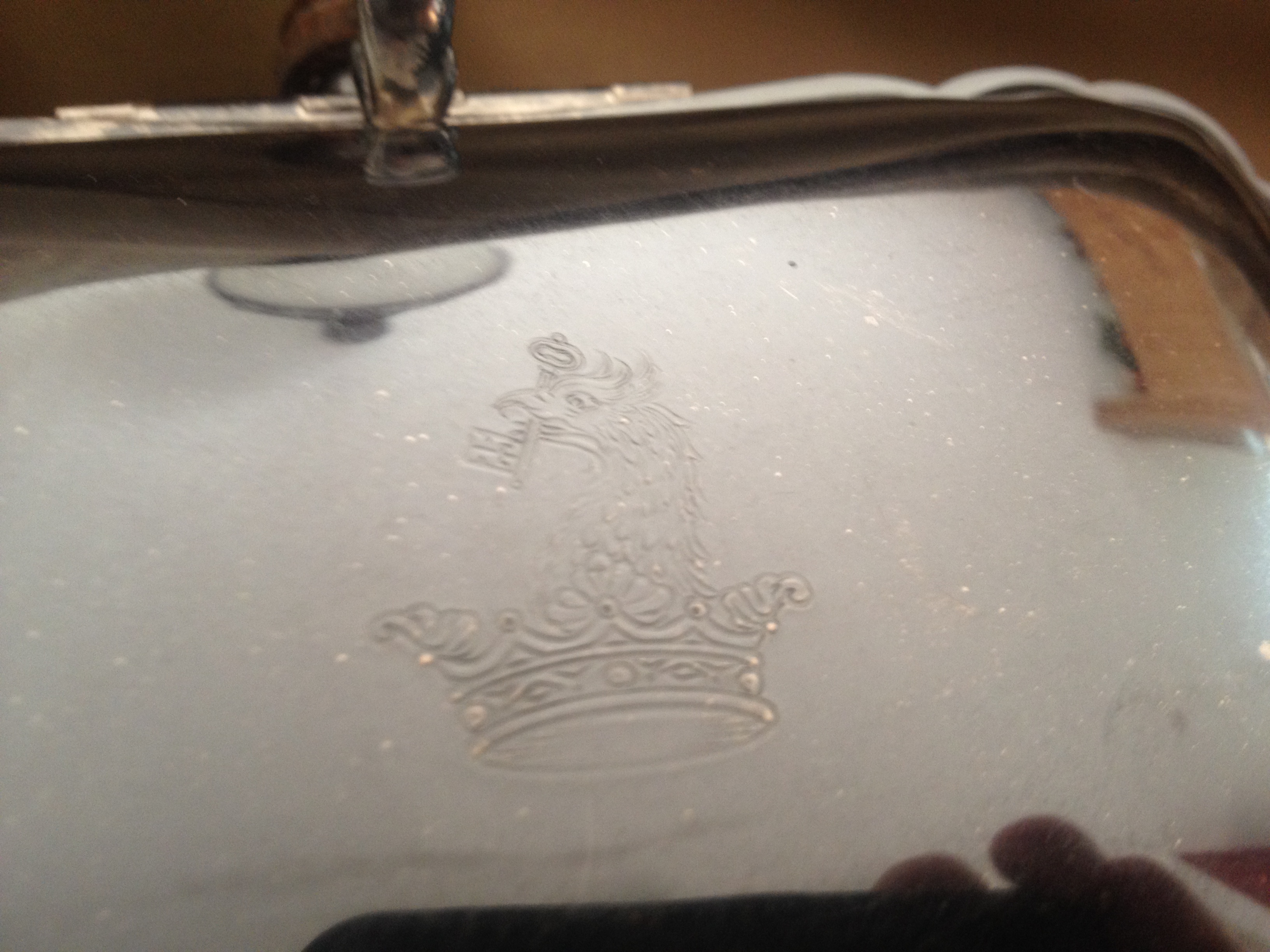 Silverplate silent butler I found at a Goodwill store. It has a few rough marks or blemishes that I tried to detail in the pictures. There are some spots that wouldn't come off on the inside of it too. It has been polished recently and I don't know if that's a good thing or not. Also, I've been trying to figure out if the etching on the top is relevant to any value it may have. The etching is a rooster head coming up through a crown and has a key in its mouth/beak. The handle looks to be in good shape and it's not loose or broken in any way.