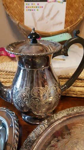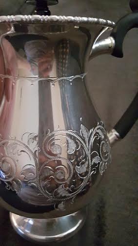 silver tea set hand engraved from cooper brothers sheffield england, tea pot has a black handle and the numbers 1650 on the bottom