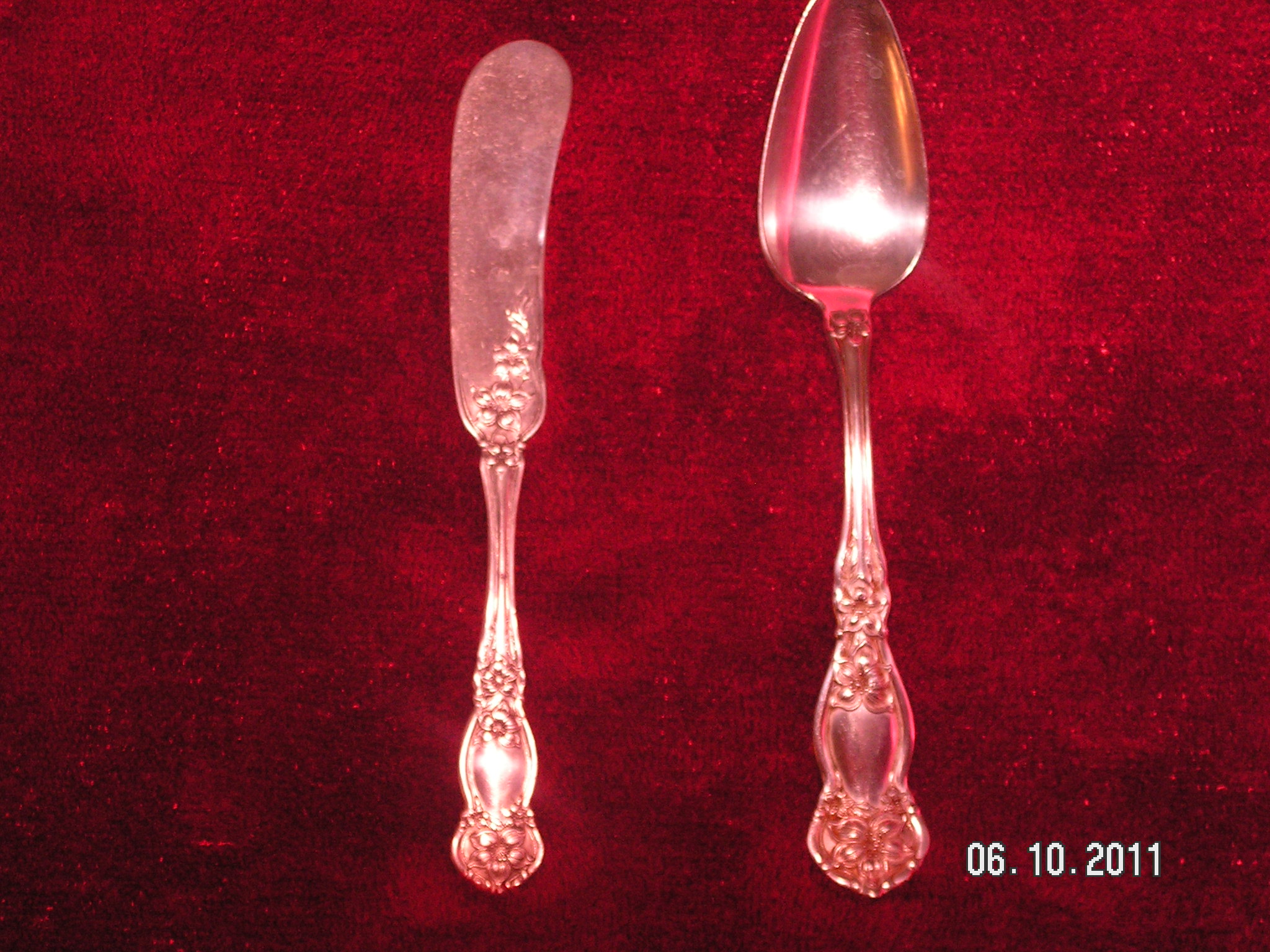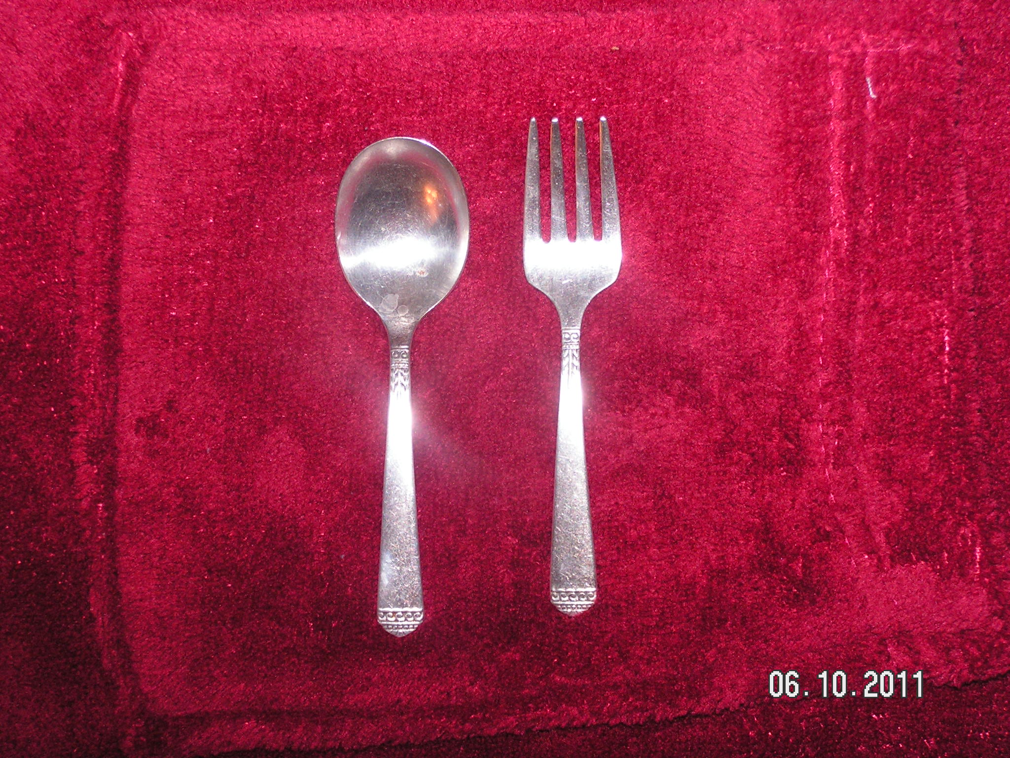 1 set of Baby spoon and fork. One baby fork. One baby spoon. spoon and spreader. Two spoons of same set. one fork. One what looks like a shovel???? PAN AM 1901, spoon. All items are in fair condition except PAN AM spoon I would list as good. Would take reasonable offers at my own discretion to the lot or items seperatly.