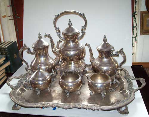 Set includes 7 pieces: tea pot, coffee pot, teapot w/ warmer, waste cup, sugar bowl w/lid, creamer, and tray
