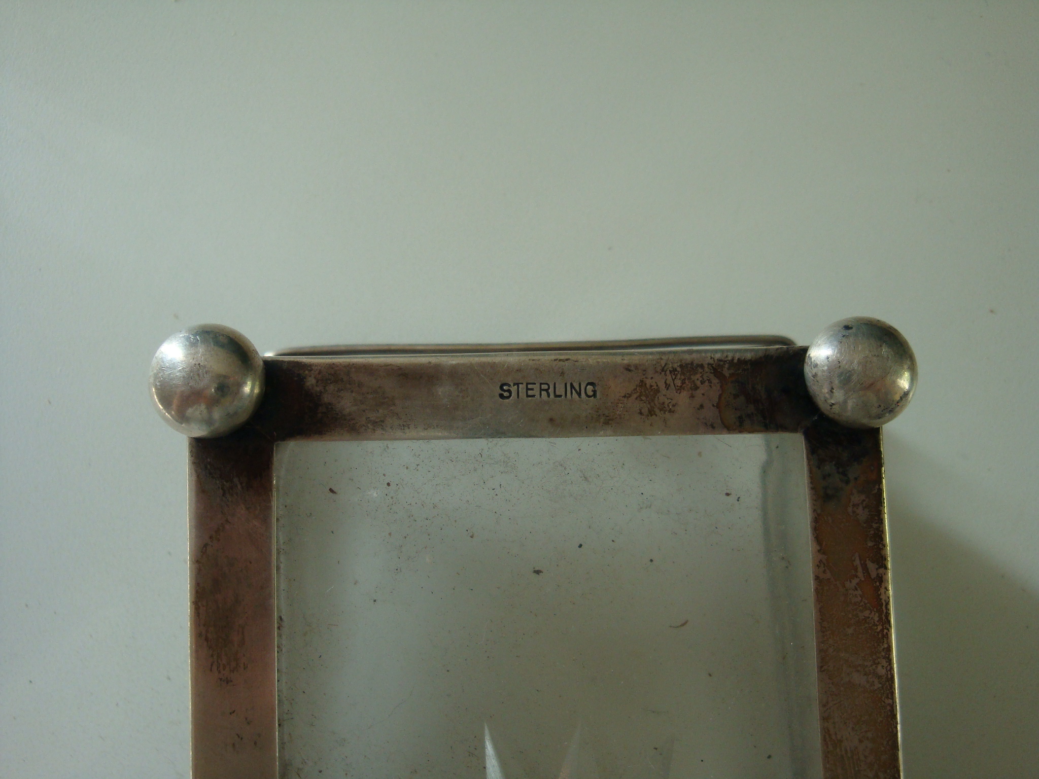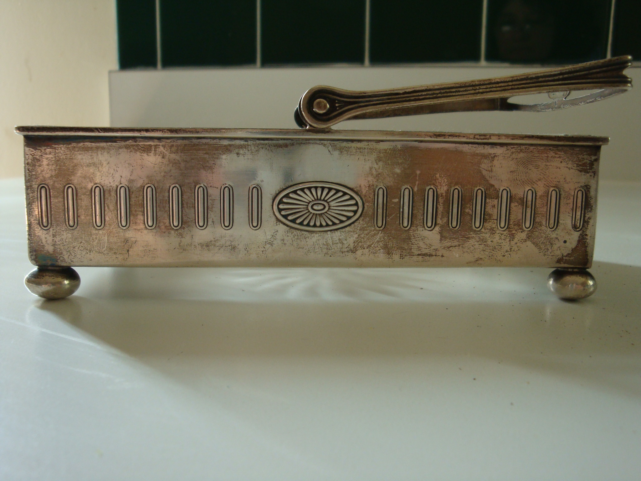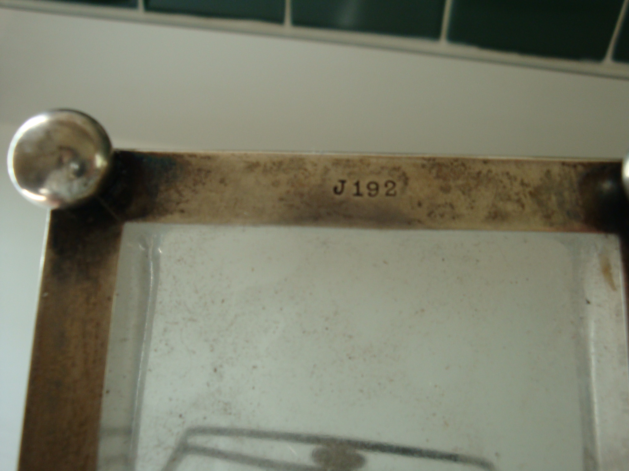 glass rectangle bowl surround by silver with a handle. marking underneath J196 silver