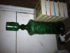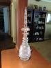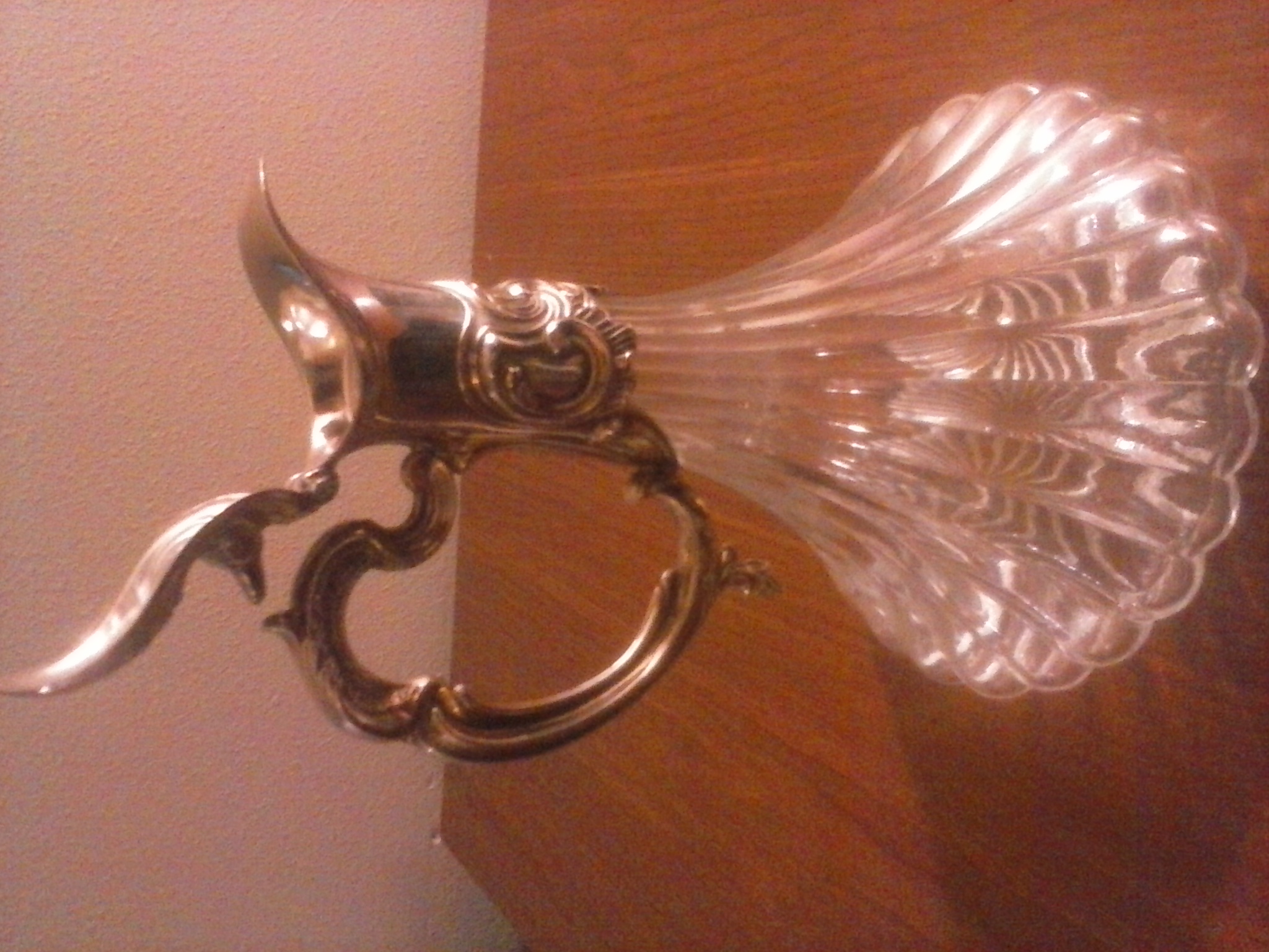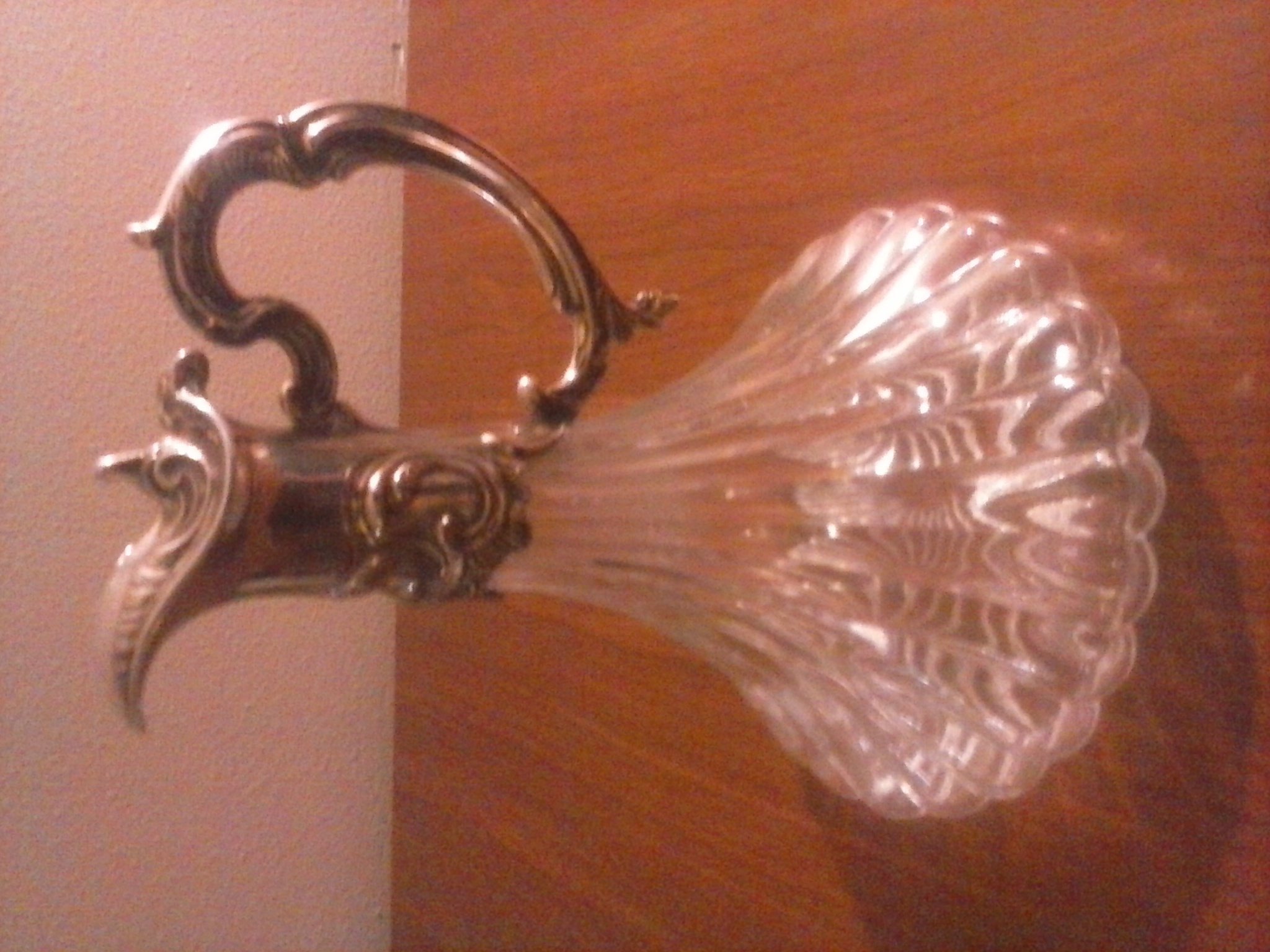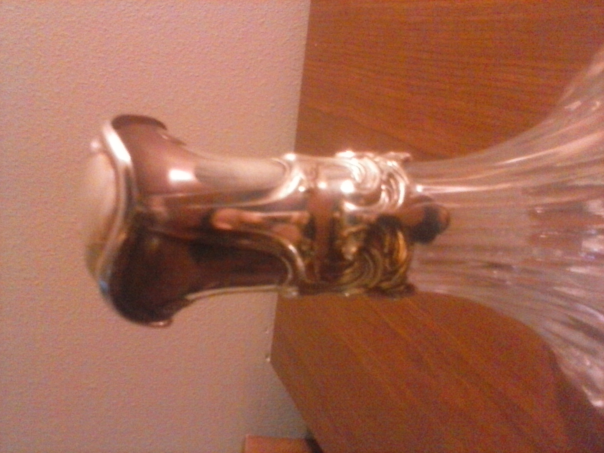 It has a silver top and lid to it and is either glass or Crystal not sure