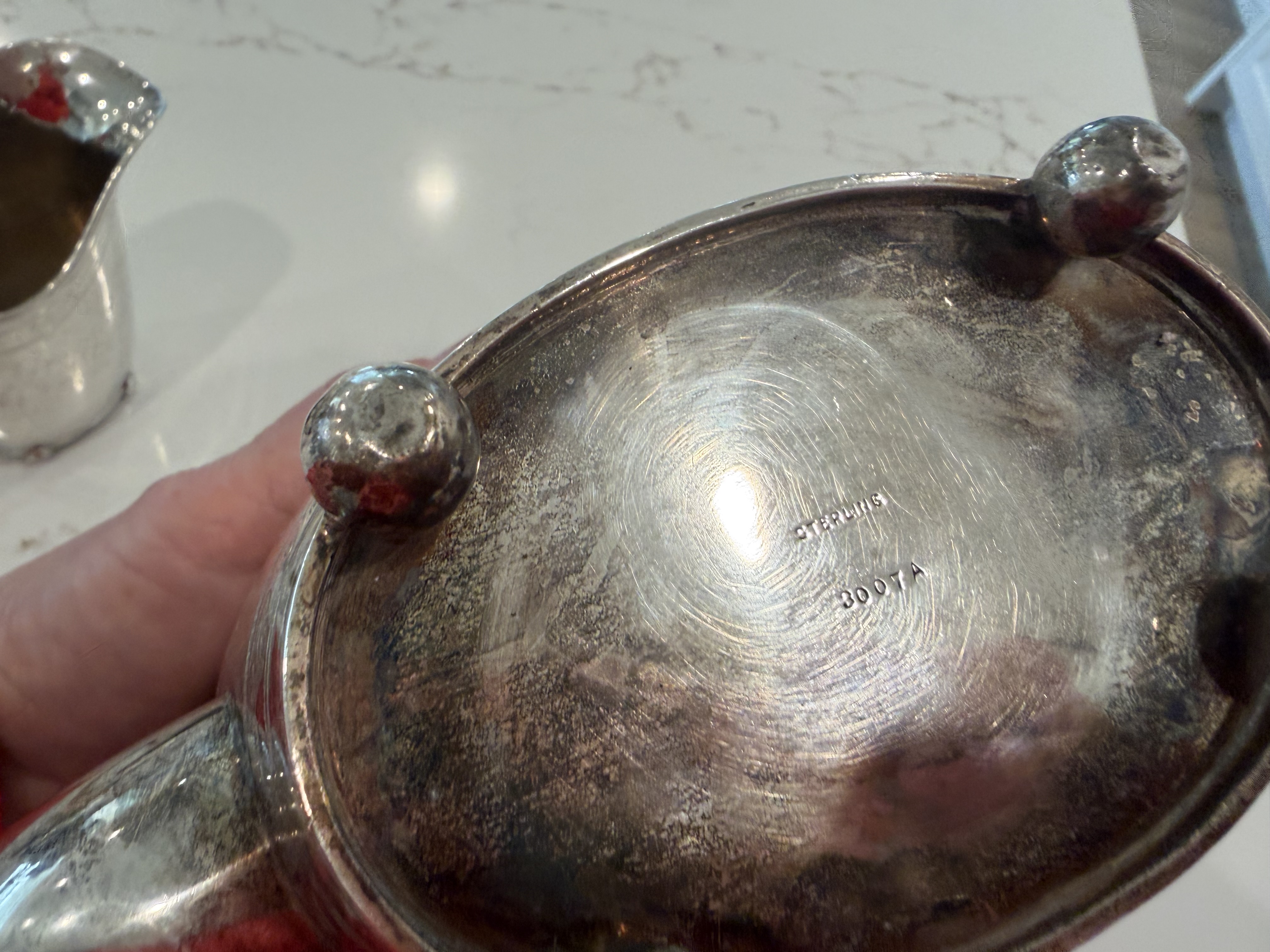 Physical Description: This is a three-piece silver tea set consisting of a teapot, creamer, and sugar bowl, all featuring elegant ivory handles. The teapot is marked "STERLING 3007 A," the creamer "STERLING 3007 B," and the sugar bowl "STERLING 3007 B." The set exhibits intricate floral engravings and is supported by four ball feet. The teapot has a decorative finial shaped like a pineapple, adding a touch of sophistication.