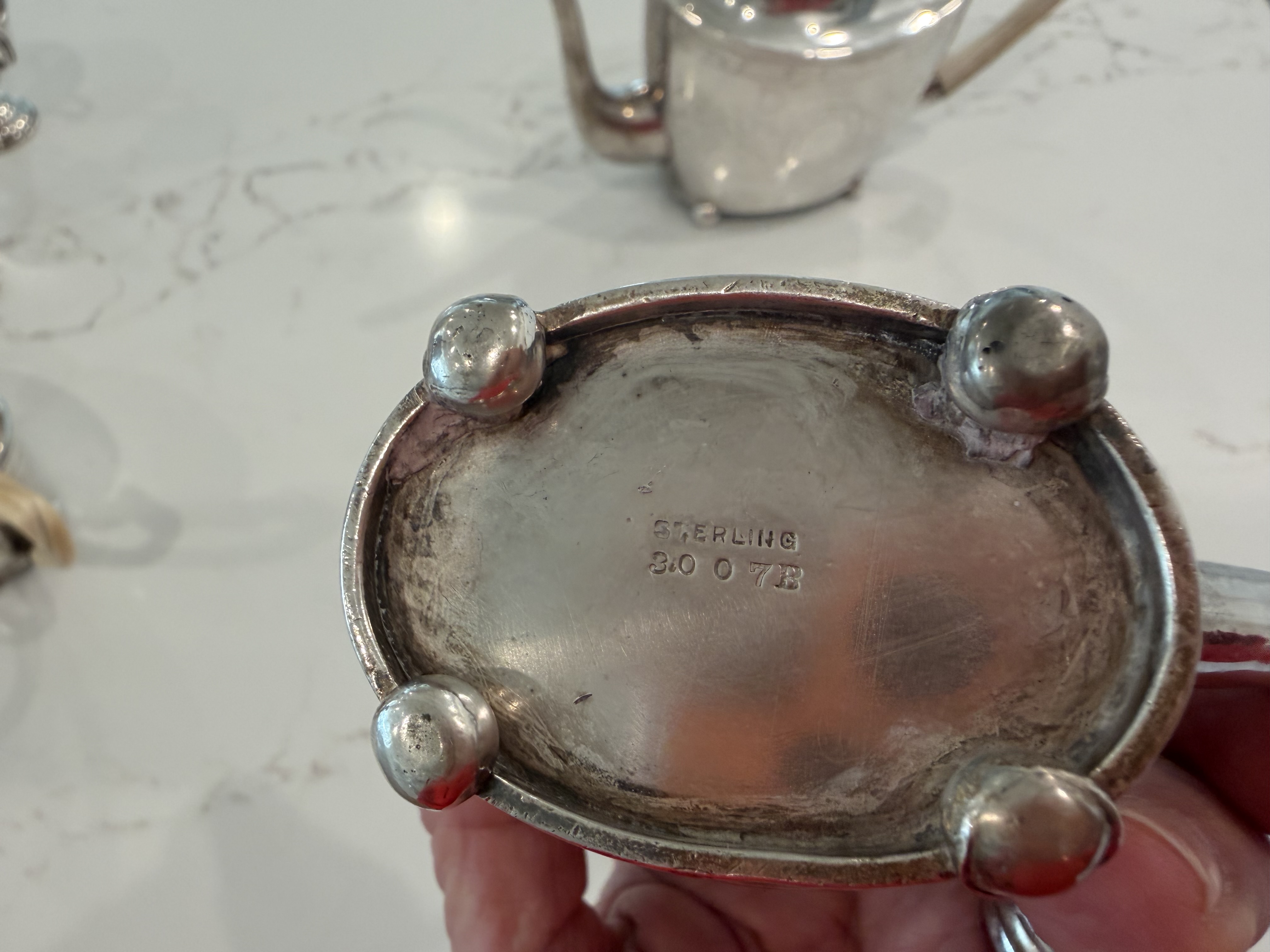 The maker of this tea set is likely a well-known silver manufacturer, as indicated by the "STERLING" mark. However, the specific manufacturer is not identified in the provided information. Many American silver manufacturers used similar markings, including Gorham, Reed & Barton, and others. Researching the specific mark could yield more precise identification.