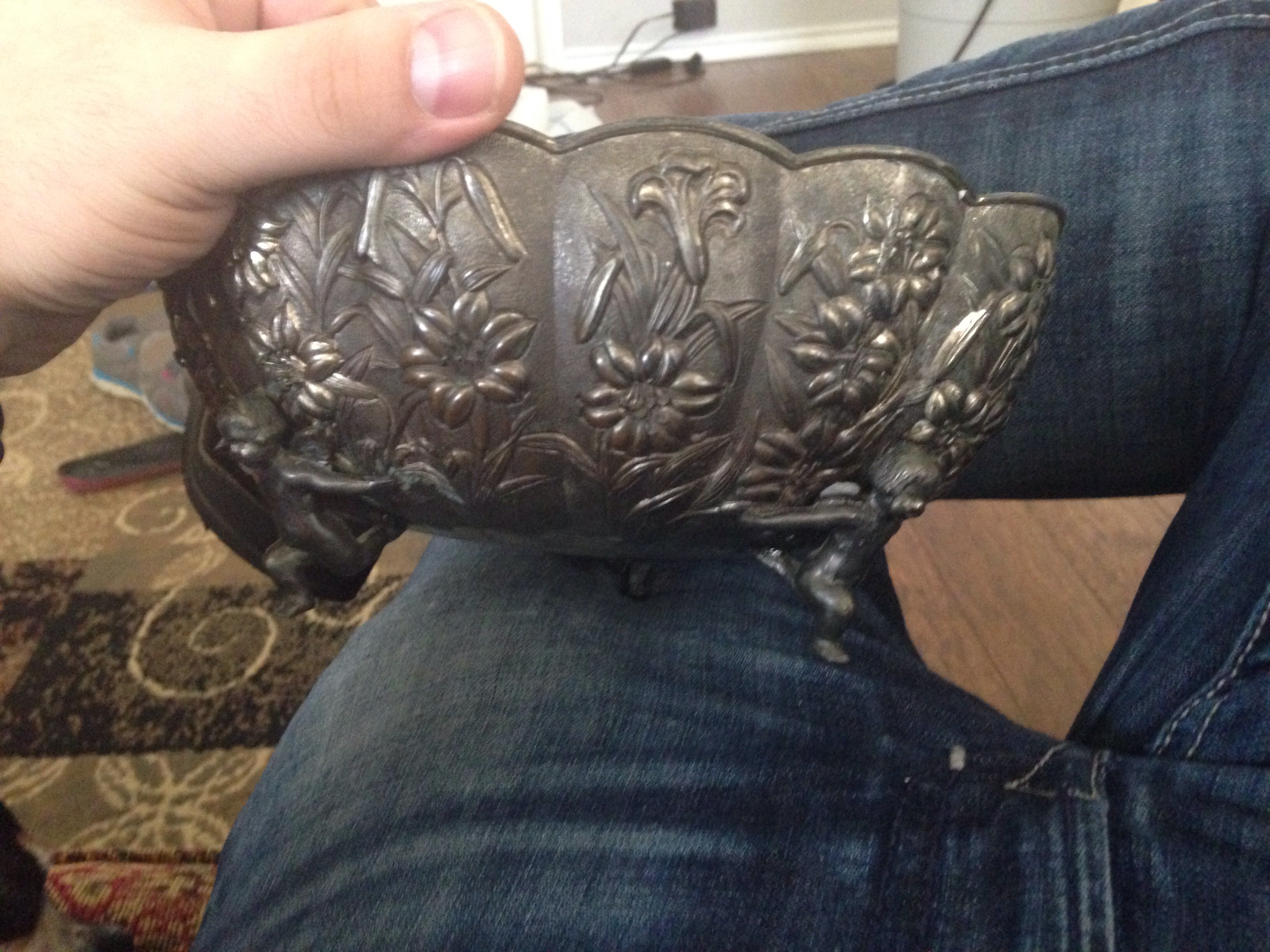 This is a silver, or possibly silver plated decorative bowl with a scalloped oval shape. It is supported by three cherubs, and has a mark that appears to be a star with a circle and cross inscribed within the star. There is also the letters "PAT".