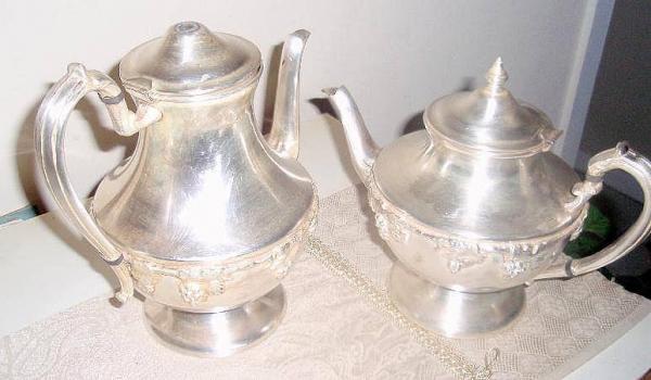 Teapot and Coffeepot, grapes and grapeleaves on a grapevine below center of each. Silver on Copper with Lehman Brothers Hallmark on each. Silver on Copper.No stains inside, very clean never used.