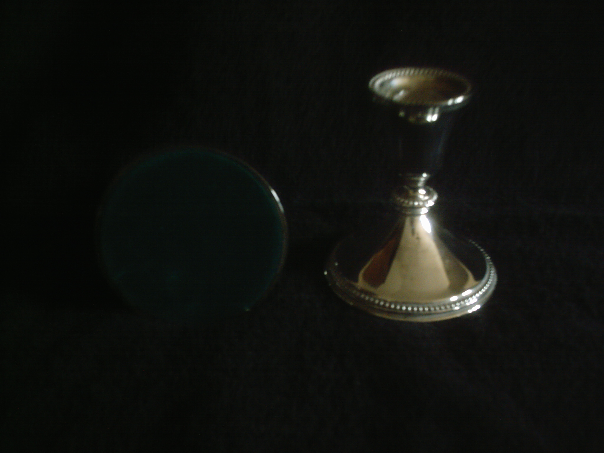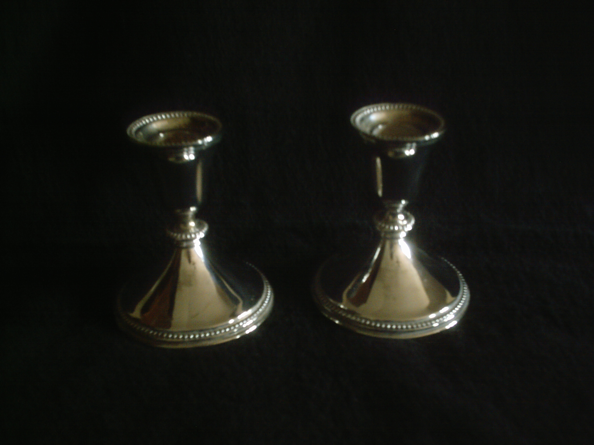 Pair of beautiful silver candle holders with a dot pattern. No markings identifying the maker of the pieces. The bottoms have removable green felt piece. I've searched and searched and can't seem to find another pair with the same pattern.