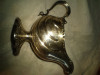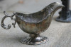 It is a cream or gravy pitcher, squared in design with a rounded handle with a ladies head on it. It has four feet, each with identical bearded man's head that is kingly looking. It is engraved with leaves and small flowers on two sides.