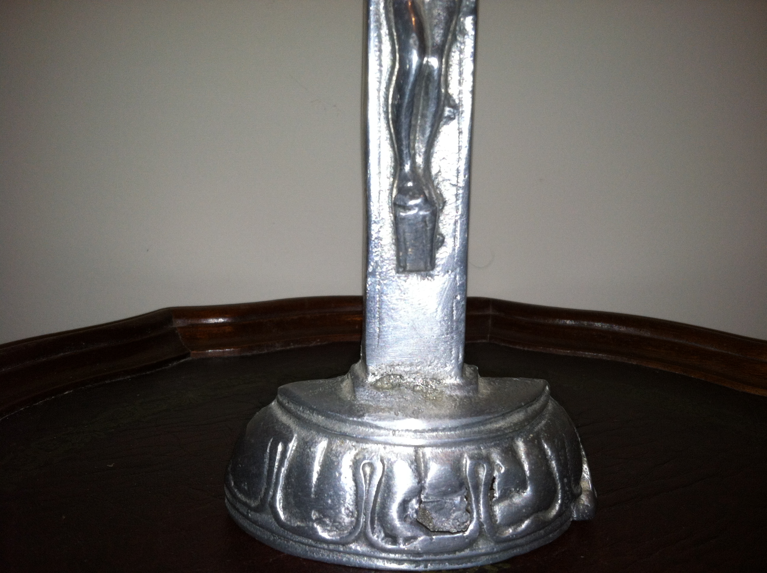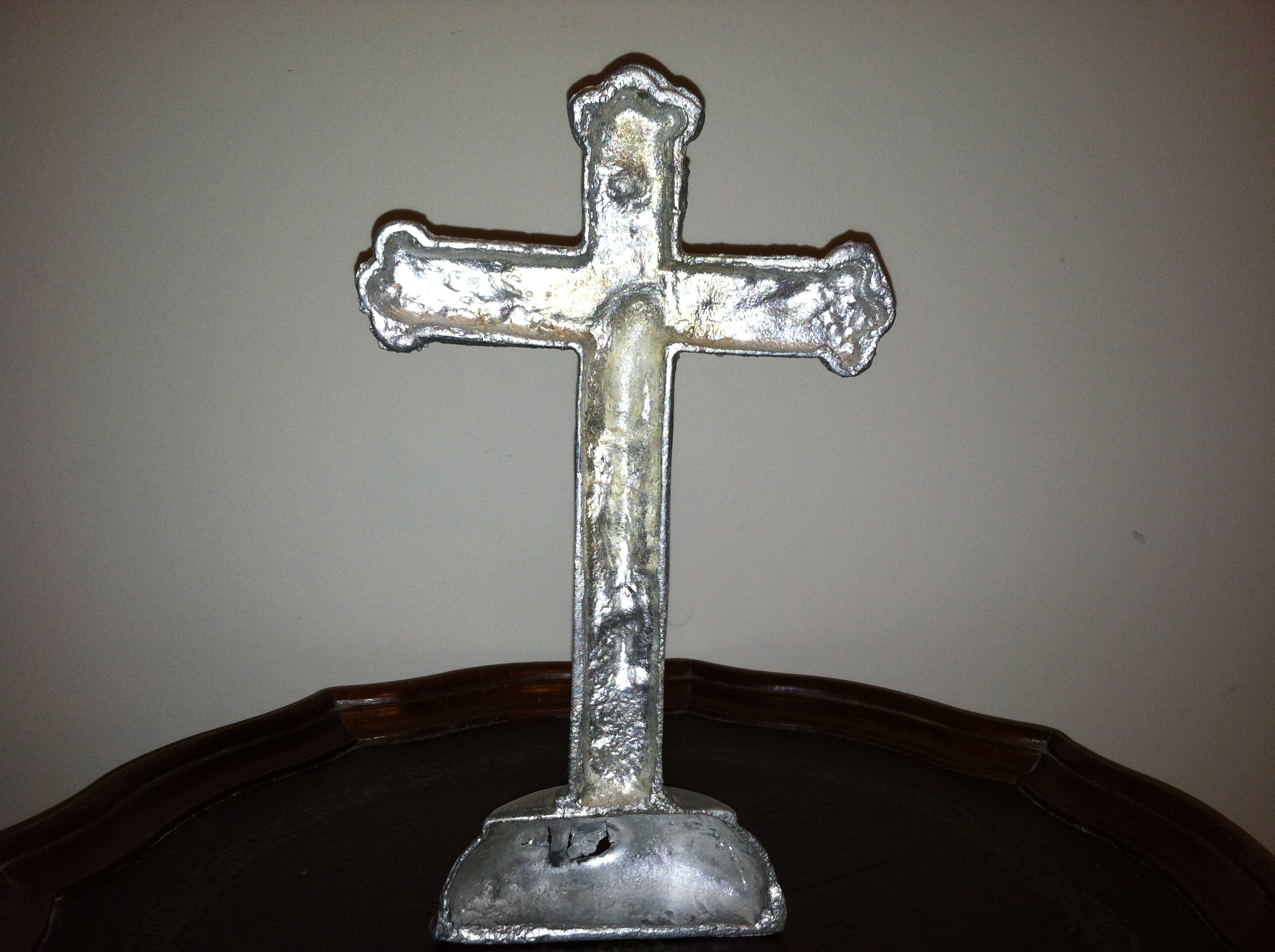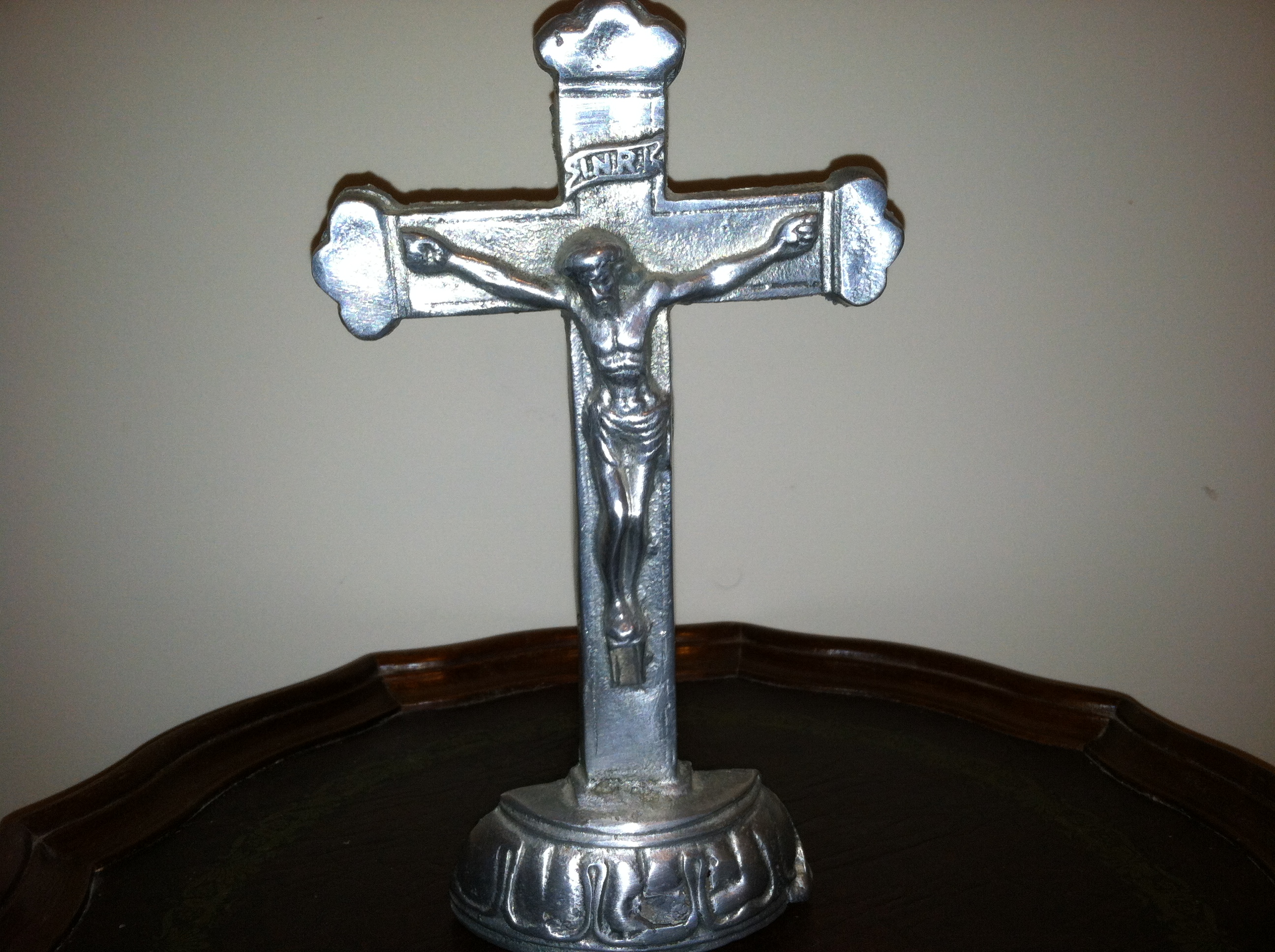 This is a very old "Silver Crucifix".... It has a base that allows it to stand on a table. It's H 8" x L 4" 1/2 ....