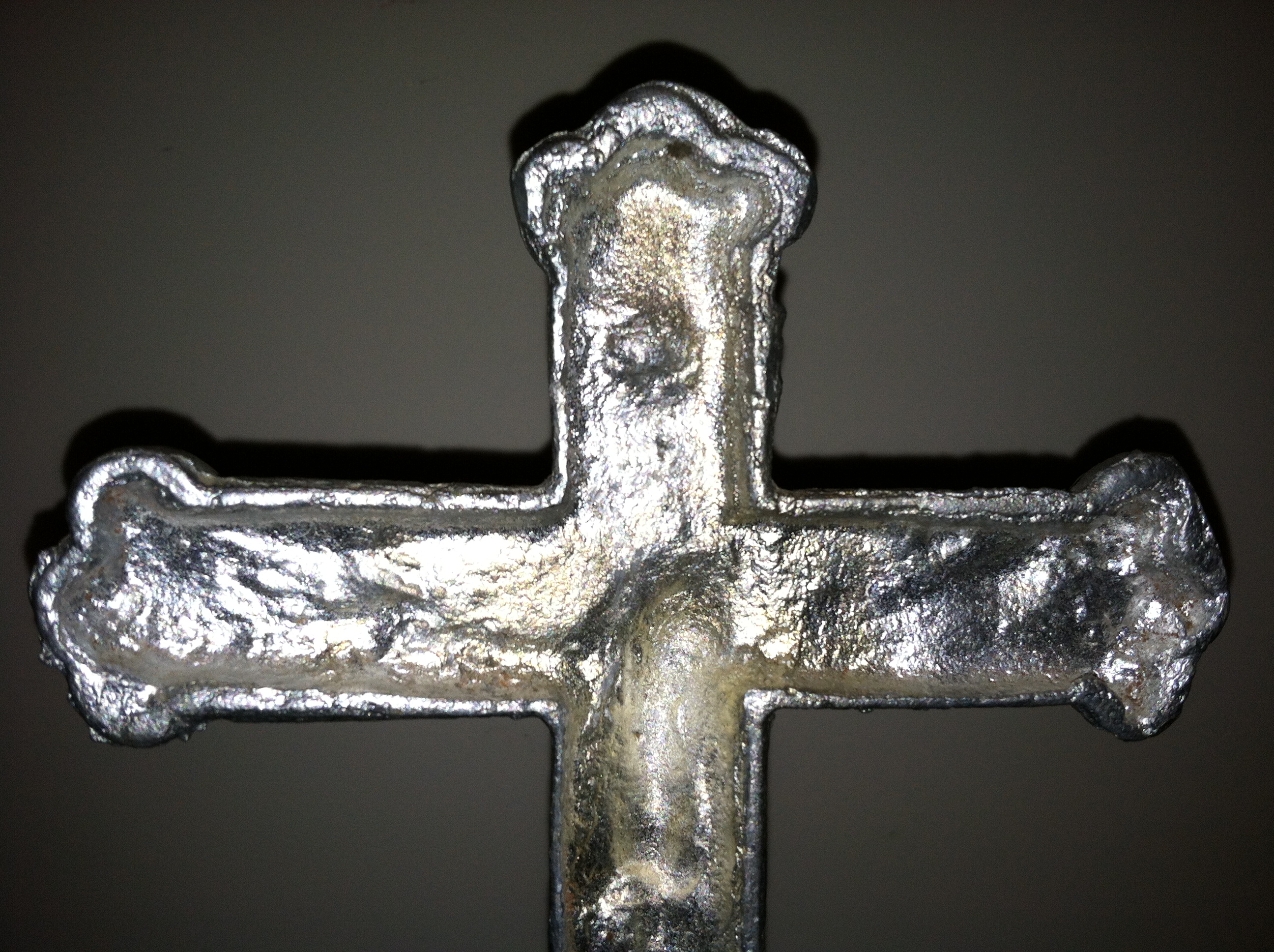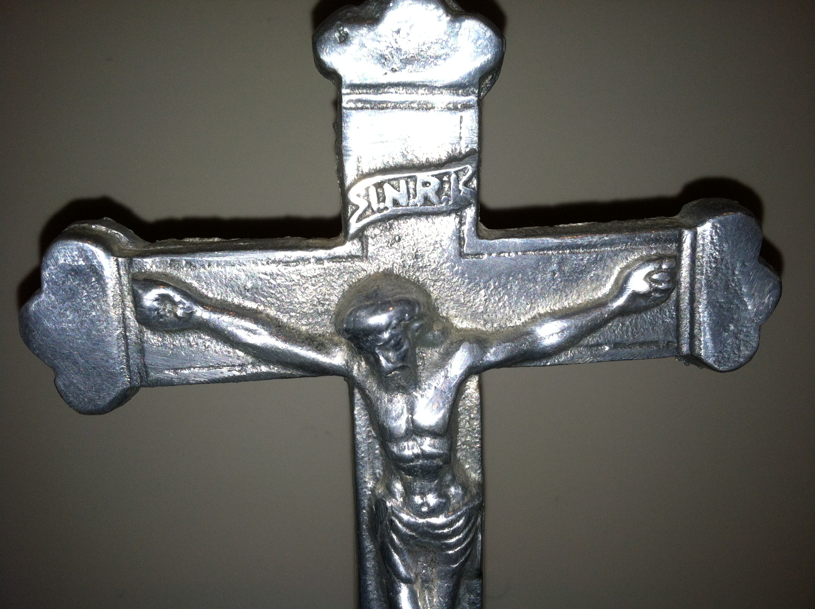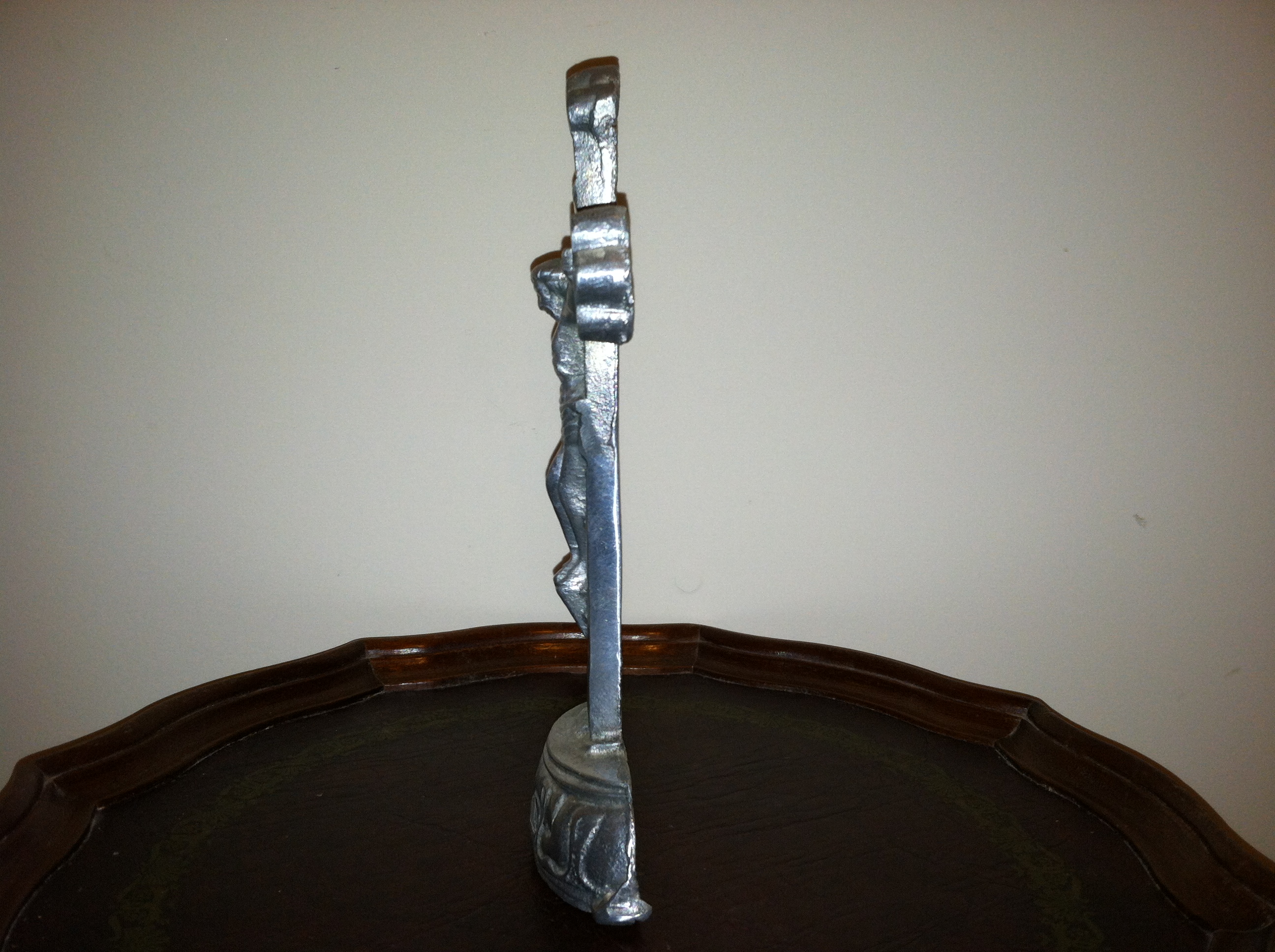 This is a very old "Silver Crucifix".... It has a base that allows it to stand on a table. It's H 8" x L 4" 1/2 ....