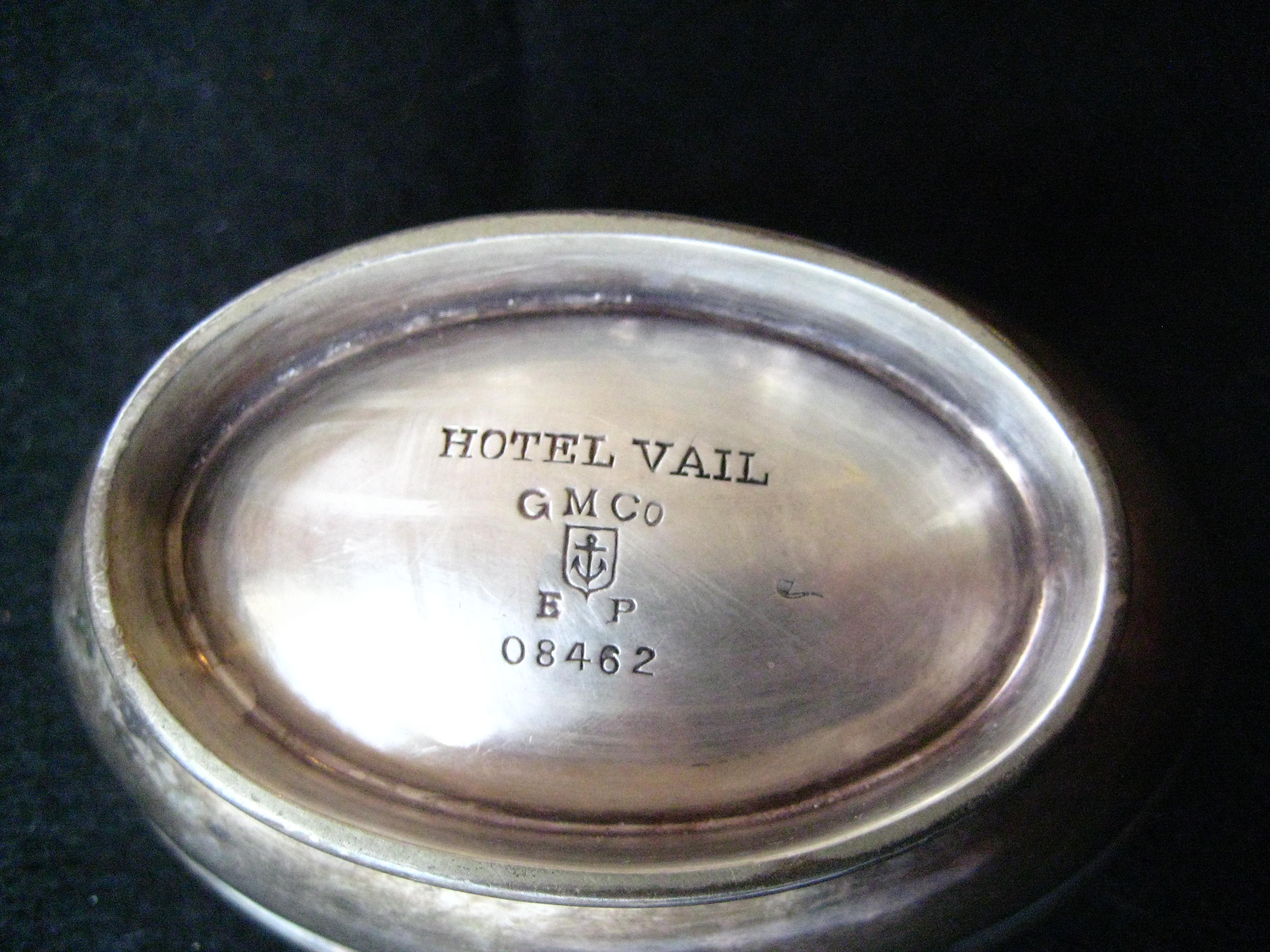 I have a silver pipe bowl from Hotel Vail in Pueblo Co. It belonged to my mother-in-law's brother. He and his new wife checked in at the hotel on their wedding and soon after died in a car accident. This piece has good clear stamps. Looks like this piece is from Gorham Manufacturing Co minted in 1911 if I am reading the stamps right. I would love to know the value of this item if possible.