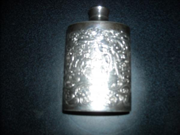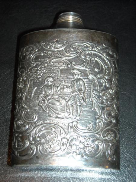 Flask includes screw cap. On the bottom of the flask starting from the top down... these are the markings. From left to right... (3 symbols) as follows.... an x inside a square, next a symbol that looks somewhat like an ampersand, then what looks like a dagger inside a square. Below that is an anchor with line, below that is a crown, below that is D.S.CO and below that is 1852