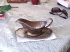 This Silver gravy boat was given to us at our wedding by our aunt in Argentina. She said it had been in the family for a while but I do not know how long. Because the silver is tarnished I assume it is made out of real silver, rather than plated with silver. It's quite heavy for its shape and size.