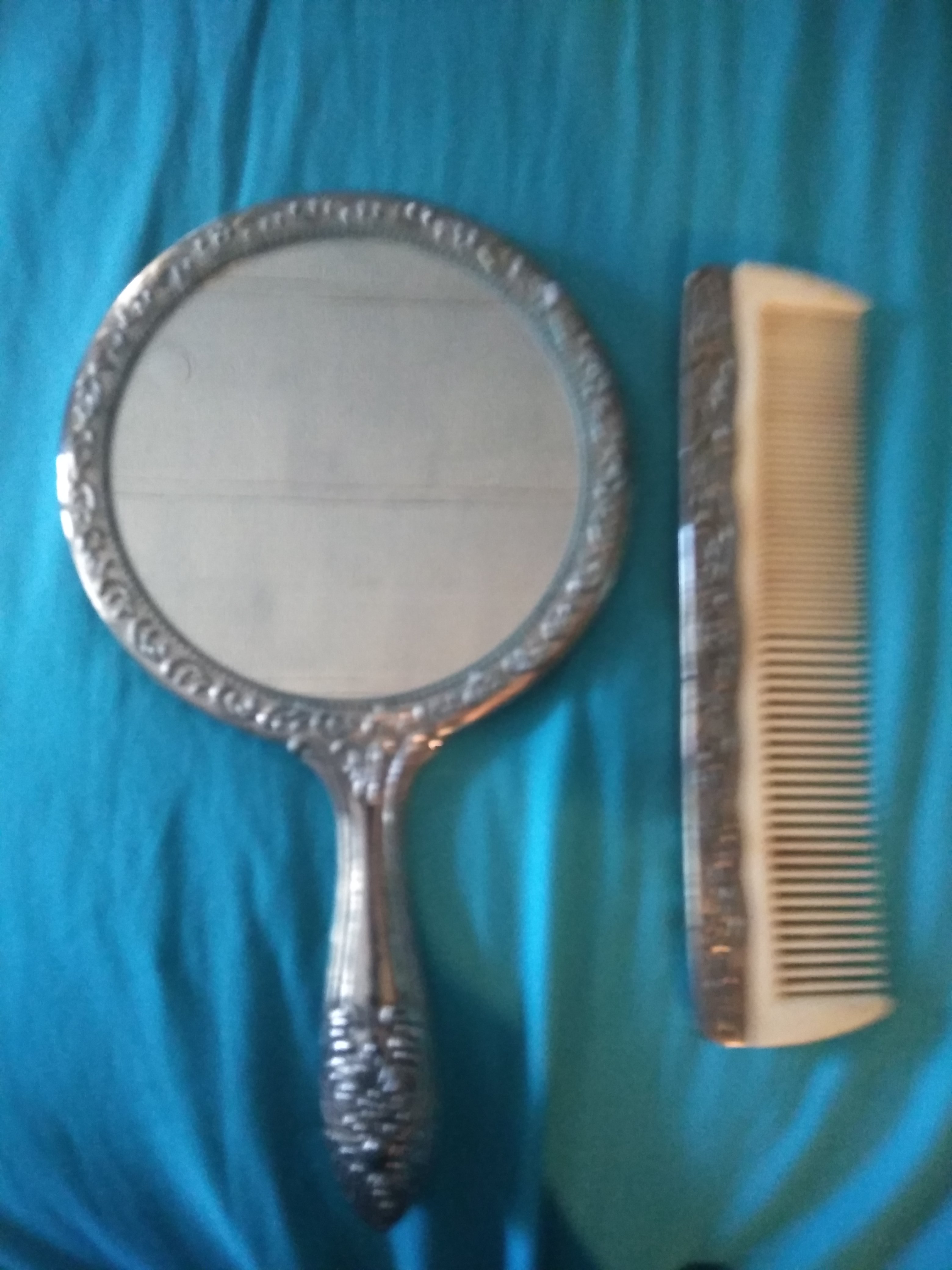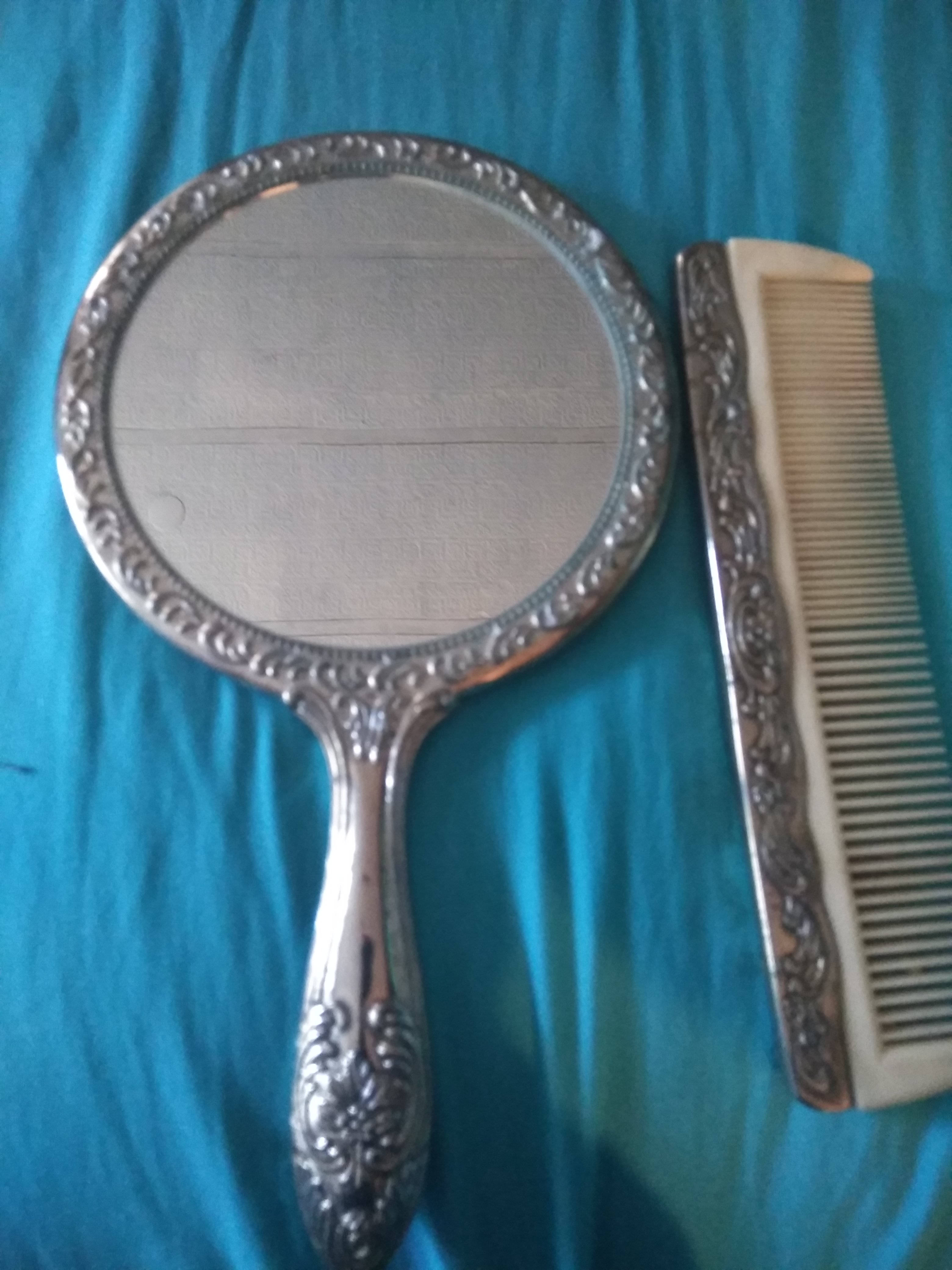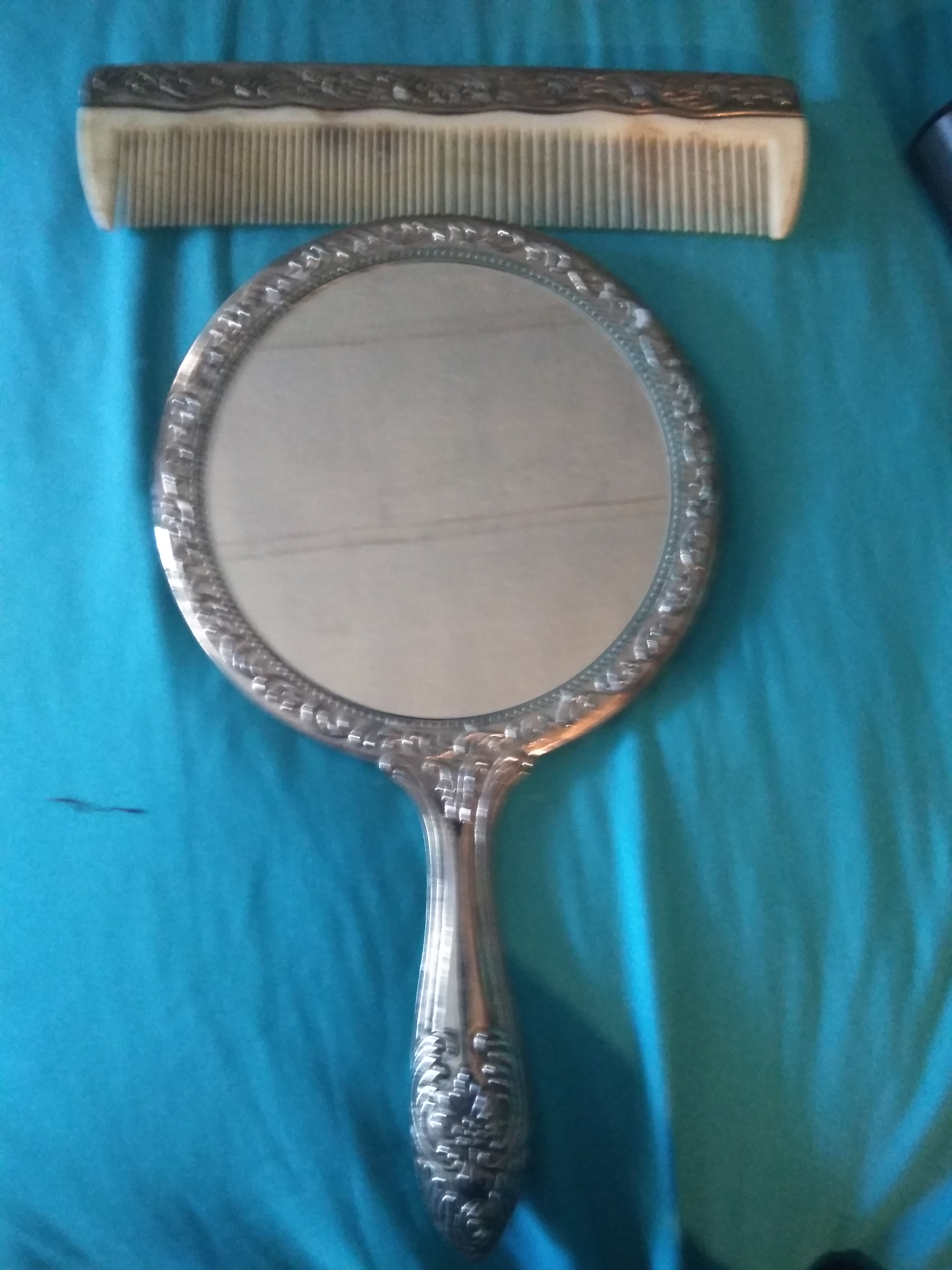 Silver mirror with comb set good condition don't know much about where it came from I know it's old. I would like to find out if it is rea mirroris still in tack it's really heavyll.